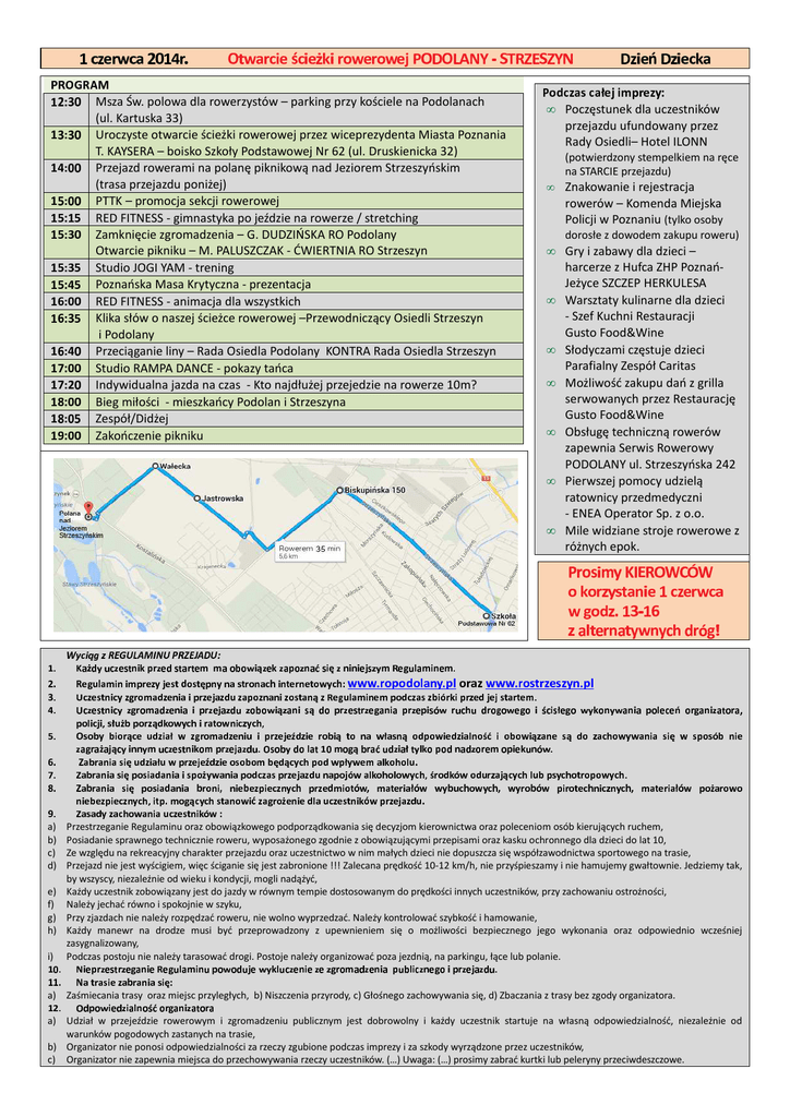 Msza Św. polowa dla rowerzystów – parking przy kościele na Podolanach 45 Q5 Y5 \5 a5 e5 g5 h5 i5 (ul. Kartuska 33) Uroczyste otwarcie ścieżki rowerowej przez wiceprezydenta Miasta Poznania T. KAYSERA – boisko Szkoły Podstawowej Nr 62 (ul. Druskienicka 32) Przejazd rowerami na polanę piknikową nad Jeziorem Strzeszyńskim (trasa przejazdu poniżej) PTTK – promocja sekcji rowerowej RED FITNESS - gimnastyka po jeździe na rowerze / stretching Zamknięcie zgromadzenia – G. DUDZIŃSKA RO Podolany Otwarcie pikniku – M. PALUSZCZAK - ĆWIERTNIA RO Strzeszyn Studio JOGI YAM - trening Poznańska Masa Krytyczna - prezentacja RED FITNESS - animacja dla wszystkich Klika słów o naszej ścieżce rowerowej –Przewodniczący Osiedli Strzeszyn i Podolany Przeciąganie liny – Rada Osiedla Podolany KONTRA Rada Osiedla Strzeszyn Studio RAMPA DANCE - pokazy tańca Indywidualna jazda na czas - Kto najdłużej przejedzie na rowerze 10m? Bieg miłości - mieszkańcy Podolan i Strzeszyna Zespół/Didżej Zakończenie pikniku • Poczęstunek dla uczestników przejazdu ufundowany przez Rady Osiedli– Hotel ILONN (potwierdzony stempelkiem na ręce na STARCIE przejazdu) • Znakowanie i rejestracja rowerów – Komenda Miejska Policji w Poznaniu (tylko osoby dorosłe z dowodem zakupu roweru) • Gry i zabawy dla dzieci – harcerze z Hufca ZHP PoznańJeżyce SZCZEP HERKULESA • Warsztaty kulinarne dla dzieci - Szef Kuchni Restauracji Gusto Food&Wine • Słodyczami częstuje dzieci Parafialny Zespół Caritas • Możliwość zakupu dań z grilla serwowanych przez Restaurację Gusto Food&Wine • Obsługę techniczną rowerów zapewnia Serwis Rowerowy PODOLANY ul. Strzeszyńska 242 • Pierwszej pomocy udzielą ratownicy przedmedyczni - ENEA Operator Sp. z o.o. • Mile widziane stroje rowerowe z różnych epok. !"#$ % &'()*+,-.) /&0'1+2)3 6789: ;<=>?@ABC DE=>9 ?@7E@>F F7 GHGIBJ=>C =7DG=A7K ?BL = ABAB>M?=:F N>O;P7FBA>F5 N>O;P7FBA BFDE>=: M>?@ 9G?@LDA: A7 ?@EGA7<R BA@>EA>@GI:<RS TTTUVWUV TTTUXWUV Z<=>?@AB<: =OEGF79=>AB7 B DE=>M7=9; =7DG=A7AB =G?@7AJ = N>O;P7FBA>F DG9<=7? =HB[ECB DE=>9 M>M ?@7E@>F5 Z<=>?@AB<: =OEGF79=>AB7 B DE=>M7=9; =GHGIBJ=7AB ?J 9G DE=>?@E=>O7AB7 DE=>DB?[I E;<R; 9EGOGI>OG B ]<B?^>OG I:CGA:I7AB7 DGP><>_ GEO7AB=7@GE7` DGPB<MB` ?^;8H DGE=J9CGI:<R B E7@GIAB<=:<R` b?GH: HBGEJ<> ;9=B7^ I =OEGF79=>AB; B DE=>M>c9=B> EGHBJ @G A7 I^7?AJ G9DGIB>9=B7PAG]K B GHGIBJ=7A> ?J 9G =7<RGI:I7AB7 ?BL I ?DG?[H AB> =7OE787MJ<: BAA:F ;<=>?@ABCGF DE=>M7=9;5 b?GH: 9G P7@ 4d FGOJ HE7K ;9=B7^ @:PCG DG9 A79=GE>F GDB>C;A[I5 f7HE7AB7 ?BL ;9=B7^; I DE=>M>c9=B> G?GHGF HL9J<:<R DG9 ID^:I>F 7PCGRGP;5 f7HE7AB7 ?BL DG?B797AB7 B ?DG8:I7AB7 DG9<=7? DE=>M7=9; A7DGM[I 7PCGRGPGI:<R` ]EG9C[I G9;E=7MJ<:<R P;H D?:<RG@EGDGI:<R5 f7HE7AB7 ?BL DG?B797AB7 HEGAB` AB>H>=DB><=A:<R DE=>9FBG@[I` F7@>EB7^[I I:H;<RGI:<R` I:EGH[I DBEG@><RAB<=A:<R` F7@>EB7^[I DG87EGIG AB>H>=DB><=A:<R` B@D5 FGOJ<:<R ?@7AGIBK =7OEG8>AB> 9P7 ;<=>?@ABC[I DE=>M7=9;5 f7?79: =7<RGI7AB7 ;<=>?@ABC[I S a) b) c) d) Przestrzeganie Regulaminu oraz obowiązkowego podporządkowania się decyzjom kierownictwa oraz poleceniom osób kierujących ruchem, Posiadanie sprawnego technicznie roweru, wyposażonego zgodnie z obowiązującymi przepisami oraz kasku ochronnego dla dzieci do lat 10, Ze względu na rekreacyjny charakter przejazdu oraz uczestnictwo w nim małych dzieci nie dopuszcza się współzawodnictwa sportowego na trasie, Przejazd nie jest wyścigiem, więc ściganie się jest zabronione !!! Zalecana prędkość 10-12 km/h, nie przyśpieszamy i nie hamujemy gwałtownie. Jedziemy tak, by wszyscy, niezależnie od wieku i kondycji, mogli nadążyć, e) Każdy uczestnik zobowiązany jest do jazdy w równym tempie dostosowanym do prędkości innych uczestników, przy zachowaniu ostrożności, f) Należy jechać równo i spokojnie w szyku, g) Przy zjazdach nie należy rozpędzać roweru, nie wolno wyprzedzać. Należy kontrolować szybkość i hamowanie, h) Każdy manewr na drodze musi być przeprowadzony z upewnieniem się o możliwości bezpiecznego jego wykonania oraz odpowiednio wcześniej zasygnalizowany, i) Podczas postoju nie należy tarasować drogi. Postoje należy organizować poza jezdnią, na parkingu, łące lub polanie. 4d5 jB>DE=>?@E=>O7AB> N>O;P7FBA; DGIG9;M> I:CP;<=>AB> => =OEGF79=>AB7 D;HPB<=A>OG B DE=>M7=9;5 445 j7 @E7?B> =7HE7AB7 ?BLS a) Zaśmiecania trasy oraz miejsc przyległych, b) Niszczenia przyrody, c) Głośnego zachowywania się, d) Zbaczania z trasy bez zgody organizatora. 4Q5 b9DGIB>9=B7PAG]K GEO7AB=7@GE7 a) Udział w przejeździe rowerowym i zgromadzeniu publicznym jest dobrowolny i każdy uczestnik startuje na własną odpowiedzialność, niezależnie od warunków pogodowych zastanych na trasie, b) Organizator nie ponosi odpowiedzialności za rzeczy zgubione podczas imprezy i za szkody wyrządzone przez uczestników, c) Organizator nie zapewnia miejsca do przechowywania rzeczy uczestników. (…) Uwaga: (…) prosimy zabrać kurtki lub peleryny przeciwdeszczowe.