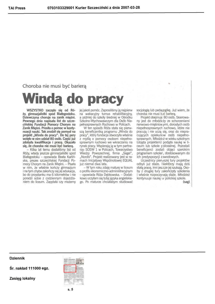 TAI Press 0703103329001 Kurier Szczeciński z dnia 2007-03-28 Choroba nie musi być barierą Windą do pracy WSZYSTKO zaczęło się od Róży, gimnazjalistki spod Białegostoku. Dziewczyna choruje na zanik mięśni. Pewnego dnia napisała list do szczecińskiej Fundacji Pomocy Chorym na Zanik Mięśni. Prosiła o pomoc w kontynuacji nauki. Tak zrodził się pomysł na projekt „Winda do pracy". Do tej pory wzięło w nim udział 80 osób. Część już zdobyła kwalifikacje i pracę. Okazało się, że choroba nie musi być barierą. - Kilka lat temu dostaliśmy list od Róży, wtedy jeszcze gimnazjalistki spod Białegostoku - opowiada Beata Karlińska, prezes szczecińskiej Fundacji Pomocy Chorym na Zanik Mięśni. - Pisała w nim, że właśnie kończy gimnazjum i na tym chyba zakończy się jej edukacja, bo do przystanku ma 6 kilometrów i nie poradzi sobie z codziennym dojeżdżaniem do liceum. Zapytała czy możemy jej jakoś pomóc. Zaprosiliśmy ją najpierw na wakacyjny turnus rehabilitacyjny, a później do szkoły średniej w Ośrodku Szkolno-Wychowawczym dla Osób Niepełnosprawnych Ruchowo w Policach. W ten sposób Róża stała się pierwszą beneficjentką programu „Winda do pracy", który fundacja stworzyła właśnie z myślą o pomocy osobom niepełnosprawnym ruchowo we wkraczaniu na rynek pracy. Wspierają ją w tym partnerzy: SOSW l w Policach, Towarzystwo Wiedzy Powszechnej, firma „Segel", „Nordis". Projekt realizowany jest w ramach Inicjatywy Wspólnotowej EO.UAL już niemal dwa lata. - W tym roku zdaję maturę w liceum o profilu ekonomiczno-administracyjnym - opowiada Róża Dębkowska. - Dodatkowo uczyłam się tutaj języka angielskiego. Po maturze chciałabym studiować Dziennik •-&_.__ Śr. nakład 111000 egz. Zasięg lokalny s, 5 socjologię lub pedagogikę. Już wiem, że choroba nie musi b/ć barierą. Projekt obejmuje 80 osób. Skierowany jest do młodzieży ze schorzeniami nerwowo-mięśniowymi, dorosłych osób niepełnosprawnych ruchowo, które nie pracują i nie uczą się, oraz do niepracujących opiekunów osób niepełnosprawnych. Młodzież w wieku szkolnym (objęta projektem) podjęła naukę w liceum lub szkole policealnej. Pozostali beneficjenci zostali objęci szerokim programem szkolei", dostosowanym do ich predyspozycji zawodowych. Uczestnicy pierwszej tury projektów odbyli już staże. Niektórzy mają dziś stałą pracę, inni jeszcze jej szukają. Osoby z drugiej tury zakończyły szkolenia i właśnie rozpoczynają staże. Młodzież kontynuuje naukę w polickiej szkole. (sag)