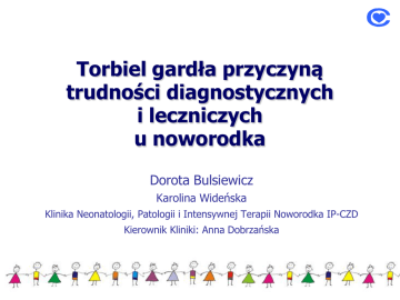 Torbiel gardła przyczyną trudności diagnostycznych i leczniczych u noworodka Dorota Bulsiewicz Karolina Wideńska Klinika Neonatologii, Patologii i Intensywnej Terapii Noworodka IP-CZD Kierownik Kliniki: Anna Dobrzańska Wywiad CI, PI, 32 t.c. (wsk. odklejające się łożysko), 1450g, 6 pkt. Apgar cechy dysmorfii – retrognacja, podniebienie gotyckie, wiotkość krtani, RDS II st, IVH I st, przejściowa niewydolność krążenia (AK: DA) próby doustnego karmienia nieefektywne, krztuszenie się, 1 epizod zachłyśnięcia (zachłystowe zapalenie płuc) przyjęcie do Kliniki w wieku 5,5 tygodnia celem dalszej, planowej diagnostyki genetycznej reanimacja w trakcie transportu Zaburzenia oddychania od momentu przyjęcia niewydolność oddechowa nCPAP, w 2 dobie pobytu głęboki bezdech bez poprawy po wentylacji workiem Ambu, intubacja, wentylacja mechaniczna próby ekstubacji (2x) – nieudane Stridor, odgięciowe ułożenie, gazometria prawidłowa Po kilku-kilkunastu godzinach głęboki bezdech wymagający reintubacji Problem neurologiczny od 1 doby hospitalizacji drgawki kloniczne USG OUN– stan po IVH (poszerzenie układu komorowego bez cech aktywnego wodogłowia) MRI OUN – ścieńczenie ciała modzelowatego EEG – zapis podejrzany o zmiany zlokalizowane Stosowano: phenobarbital, doraźnie fenytoinę Dalszy przebieg w laryngoskopii bezpośredniej przy kolejnej (3) intubacji uwidoczniono strukturę torbielowatą powyżej wejścia do krtani MRI szyi: torbiel Ø 1 cm, zlokalizowana w gardle, bez komunikacji z kanałem kręgowym direktoskopia: torbiel wywodząca się z języka (między nagłośnią a nasadą języka), szczątkowa nagłośnia zabieg marsupializacji torbieli w wieku 10 tygodni Ostateczny rezultat dziecko ekstubowane z powodzeniem 3 h po zabiegu oddech własny wydolny gazometria prawidłowa ustąpienie napadów drgawkowych Wątpliwości… Czy wstępne rozpoznanie było właściwe? Czy dziecko było właściwie przygotowane do transportu? Co było przyczyną zatrzymania oddychania i krążenia w karetce N? Co było przyczyną wystąpienia objawów neurologicznych u dziecka? Co było przyczyną niepowodzeń ekstubacji? Dziękuję za uwagę Dziękuję za uwagę