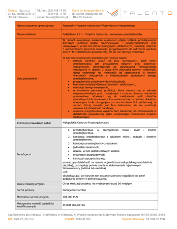 Nazwa programu operacyjnego Regionalny Program Operacyjny Województwa Małopolskiego Nazwa działania Podziałanie 1.2.1 - Projekty badawczo - rozwojowe przedsiębiorstw W ramach niniejszego konkursu wsparciem objęte zostaną przedsięwzięcia dotyczące realizacji badań przemysłowych i eksperymentalnych prac rozwojowych, w tym linii demonstracyjnych i pilotażowych, walidacji, włącznie z uruchomieniem pierwszej produkcji i przygotowaniem do wdrożenia wyników prac B+R w działalności gospodarczej, ale już nie samego wdrożenia. Opis poddziałania Instytucja prowadząca nabór W zakresie wspieranych przedsięwzięć możliwe będzie: nabycie wyników badań lub prac rozwojowych, jeżeli celem przedsięwzięcia jest prowadzenie dalszych prac badawczorozwojowych, zmierzających do opracowania innowacyjnego rozwiązania w oparciu o prace B+R dotyczące nowych właściwości danej technologii lub możliwości jej zastosowania w nowych warunkach związanych z indywidualnymi potrzebami danego przedsiębiorstwa, przygotowanie prototypów doświadczalnych, tworzenie instalacji demonstracyjnych i pilotażowych, walidacja danego rozwiązania, uruchomienie pierwszej produkcji, która zawiera się w zakresie eksperymentalnych prac rozwojowych i oznacza pierwsze wdrożenie przemysłowe odnoszące się do zwiększenia skali obiektów pilotażowych lub do pierwszych w swoim rodzaju urządzeń i obiektów, obejmujące kroki następujące po uruchomieniu linii pilotażowej, w ramach której zawarta jest faza testowania, ale nie produkcja masowa lub działalność handlowa, wsparcie przygotowania wyników fazy badawczej do zastosowania w działalności gospodarczej (jako uzupełniający komponent projektu badawczego). Małopolskie Centrum Przedsiębiorczości Beneficjenci 1. przedsiębiorstwa, przedsiębiorstwa, w szczególności mikro-, małe i średnie 2. konsorcja przedsiębiorstw z udziałem mikro-, małych i średnich przedsiębiorstw, 3. konsorcja przedsiębiorstw z udziałem: jednostek naukowych, uczelni, w tym spółek celowych uczelni, organizacji pozarządowych, instytucji otoczenia biznesu. prowadzący działalność na terenie województwa małopolskiego (oddział lub siedziba), co znajduje potwierdzenie w dokumentach rejestrowych Wnioskodawcy (oddział lub siedziba) LUB oświadczający, że warunek ten zostanie spełniony najpóźniej na dzień podpisania umowy o dofinansowanie. Okres realizacji projektu Okres realizacji projektu nie może przekraczać 36 miesięcy. Forma pomocy Dotacja bezzwrotna Minimalna wartość projektu 100.000 PLN Maksymalna wartość wydatków kwalifikowanych 25 000 000,00 PLN 1) w przypadku pomocy publicznej na badania przemysłowe: a) mikro i małe przedsiębiorstwa – 70%, b) średnie przedsiębiorstwa – 60%, c) pozostali beneficjenci – 50%, 2) w przypadku pomocy publicznej na eksperymentalne prace rozwojowe: Maksymalny poziom dofinansowania (%) a) mikro i małe przedsiębiorstwa – 45%, b) średnie przedsiębiorstwa – 35%, c) pozostali beneficjenci – 25%, 3) w przypadku pomocy publicznej na studium wykonalności: a) mikro i małe przedsiębiorstwa – 70%, b) średnie przedsiębiorstwa – 60%, c) pozostali beneficjenci – 50%. Termin naboru wniosków Termin rozstrzygnięcia konkursu 30 czerwca 2016 r. (dzień otwarcia naboru) do dnia 31 października 2016 r. do godziny 15:00 (dzień zamknięcia naboru). Ocena w turach. Pierwsze rozstrzygnięcie konkursu przewidywane jest w listopadzie 2016 r. Planowany termin ostatecznego rozstrzygnięcia konkursu to styczeń 2017 r. 1) przedmiotem oceny jest każdorazowo całościowa koncepcja projektu, tj. zarówno prace B+R, jak i założenia dotyczące dalszego wdrożenia: przedmiotem oceny jest poziom naukowy i innowacyjność proponowanych rozwiązań oraz możliwość dokonania wdrożenia pod względem technicznym i ekonomicznym; 2) wsparcie może być udzielone pod warunkiem zobowiązania się Wnioskodawcy do wdrożenia wyników prac B+R – w okresie trwałości projektu w zależności od typu Wnioskodawcy/Partnerów tj. 3 lub 5 lat, przy czym wdrożenie może być sfinansowane ze środków własnych lub innego, zewnętrznego źródła finansowania, np. ze środków przeznaczonych na wdrożenia wyników prac B+R w ramach poddziałań 3.4.3 i 3.4.4 RPO WM. Wdrożenie wyników prac rozwojowych rozumiane jest jako jedna z poniższych form: gospodarczej Wnioskodawcy poprzez rozpoczęcie produkcji lub świadczenia usług na bazie uzyskanych wyników projektu, Kryteria oceny przysługujących Wnioskodawcy praw własności przemysłowej w działalności gospodarczej prowadzonej przez innego przedsiębiorcę, w celu wprowadzenia ich do działalności gospodarczej innego przedsiębiorcy (z zastrzeżeniem, że za wdrożenie wyników prac rozwojowych nie uznaje się zbycia wyników tych badań lub prac w celu ich dalszej odsprzedaży). 3) przedsiębiorca dokonuje wyboru modelu realizacji projektu, przy czym: a) może zrealizować prace B+R samodzielnie – w przypadku, gdy dysponuje odpowiednią bazą infrastrukturalną oraz innymi niezbędnymi zasobami, b) może zlecić realizację prac B+R: jednostce naukowej, w rozumieniu ustawy z dn. 30 kwietnia 2010 r. o zasadach finansowania nauki, posiadającej przyznaną kategorię naukową A+, A lub B, o której mowa w tej ustawie, przedsiębiorcy posiadającemu status centrum badawczo-rozwojowego w rozumieniu ustawy z dn. 30 maja 2008 r. o niektórych formach wspierania działalności innowacyjnej oraz posiadającemu siedzibę na terytorium RP, konsorcjum naukowemu, konsorcjum naukowo-przemysłowemu, niezależnej jednostce, stanowiącej akredytowane laboratorium (posiadające akredytację Polskiego Centrum Akredytacji) lub notyfikowanemu laboratorium (ujęte w aktualnym obwieszczeniu ministra właściwego ds. gospodarki w sprawie informacji o notyfikowanych jednostkach certyfikujących i jednostkach kontrolujących oraz notyfikowanych laboratoriach), posiadającym sied