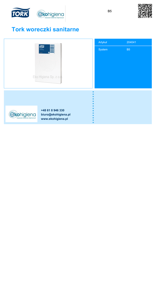 B5 Tork woreczki sanitarne Eko Higiena Sp. z o.o. +48 61 8 946 330 [email protected] www.ekohigiena.pl Artykuł 204041 System B5 B5 Informacje o opakowaniu Opakowanie pojedyncze Opakowanie transportowe Paleta EAN 7322540502640 7322540502657 7322540799576 Sztuki 25 1200 172800 Wybierz dozownik Eko Higiena Sp. z o.o. Opakowania pojedyncze - 48 6912 Opakowanie transportowe - - 144 Wysokość 15 mm 220 mm 1910 mm Szerokość 87 mm 180 mm 800 mm Długość 127 mm 260 mm 1200 mm Objętość 0.2 dm3 10.3 dm3 1.5 m3 Waga netto 31 g 1.5 kg 214.27 kg Waga brutto 35 g 2 kg 280.8 kg 566008 566000 Kontakt Eko Higiena Sp. z o.o. Ul. Gipsowa 13, Sierosław 62-080 Tarnowo Todgórne, Tel.: +48 61 8 946 330 Tork jest marką grupy SCA, Svenska Cellulosa Aktiebolaget. Grupa SCA oferuje artykuły higieniczne oraz produkty pochodzenia drzewnego w ponad 100 krajach. +48 61 8 946 330 [email protected] www.ekohigiena.pl