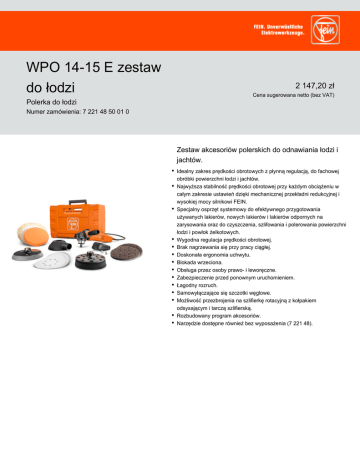 WPO 14-15 E zestaw do łodzi 2 147,20 zł Cena sugerowana netto (bez VAT) Polerka do łodzi Numer zamówienia: 7 221 48 50 01 0 Zestaw akcesoriów polerskich do odnawiania łodzi i jachtów. Idealny zakres prędkości obrotowych z płynną regulacją, do fachowej obróbki powierzchni łodzi i jachtów. Najwyższa stabilność prędkości obrotowej przy każdym obciążeniu w całym zakresie ustawień dzięki mechanicznej przekładni redukcyjnej i wysokiej mocy silnikowi FEIN. Specjalny osprzęt systemowy do efektywnego przygotowania używanych lakierów, nowych lakierów i lakierów odpornych na zarysowania oraz do czyszczenia, szlifowania i polerowania powierzchni łodzi i powłok żelkotowych. Wygodna regulacja prędkości obrotowej. Brak nagrzewania się przy pracy ciągłej. Doskonała ergonomia uchwytu. Blokada wrzeciona. Obsługa przez osoby prawo- i leworęczne. Zabezpieczenie przed ponownym uruchomieniem. Łagodny rozruch. Samowyłączające się szczotki węglowe. Możliwość przezbrojenia na szlifierkę rotacyjną z kołpakiem odsysającym i tarczą szlifierską. Rozbudowany program akcesoriów. Narzędzie dostępne również bez wyposażenia (7 221 48). WPO 14-15 E zestaw do łodzi Polerka do łodzi Numer zamówienia: 7 221 48 50 01 0 Dane techniczne Pobór mocy Moc użytkowa Prędkość obrotowa biegu jałowego Cena obejmuje: 1 200 W 750 W 500-1 500 obr/min Kabel z wtyczką 4m Ciężar wg EPTA 2,5 kg Narzędzia do polerowania Ø Gwint mocujący Sieciowe 230 mm M 14 X 1 polerka FEIN WPO 14-15 E z osłoną uchwytu i dodatkowym bocznym uchwytem antywibracyjnym w solidnej walizce z tworzywa sztucznego 1 talerz wsporczy z mocowaniem na rzep, Ø 170 mm 1 gąbka polerska, Ø 195 mm 1 futerko jagnięce, wypukłe, Ø 235 mm 1 kołpak odsysający 1 talerz szlifierski Ø 150 mm 2 włókniny szlifierskie do powłok antyporostowych 1 włóknina szlifierska po 2 arkusze papieru ściernego Ø 150 mm, z otworami, (ziarnistość 80, 150, 180)