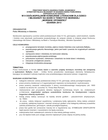 PREZYDENT MIASTA GDAŃSKA PAWEŁ ADAMOWICZ DYREKTOR PAŁACU MŁODZIEŻY W GDAŃSKU MARIA PAWŁOWSKA ZAPRASZAJĄ DO UDZIAŁU W II OGÓLNOPOLSKIM KONKURSIE LITERACKIM DLA DZIECI I MŁODZIEŻY NA BAŚŃ O TEMATYCE MORSKIEJ „MORSKIE OPOWIEŚCI” GDAŃSK 2013 ORGANIZATOR Pałac Młodzieży w Gdańsku Serdecznie zapraszamy uczniów szkół podstawowych (klas IV-VI), gimnazjów, szkół średnich, świetlic i klubów oraz placówek wychowania pozaszkolnego do wzięcia udziału w kolejnej edycji Konkursu Literackiego dla Dzieci i Młodzieży na Baśń o Tematyce Morskiej „ Morskie Opowieści”. CELE KONKURSU: propagowanie tematyki morskiej, piękna miasta Gdańska oraz wybrzeża Bałtyku, popularyzacja gatunku literackiego, jakim jest baśń i powrotu do oryginalnych wartości opowieści, zachęcanie dzieci i młodzieży do twórczości własnej, popularyzacja piękna języka polskiego, pobudzanie wyobraźni, ciekawości i otwartości na świat dzieci i młodzieży, ćwiczenie umiejętności pisania, integracja środowiska piszącego. TEMATYKA: Prace konkursowe w formie tekstu baśni o szeroko pojętej tematyce morskiej lub związanej z wybrzeżem Bałtyku (baśń - krótka forma prozatorska zawierająca elementy fantastyczne, bazująca na zasadach ludowej mądrości oraz przedstawiająca wierzenia ludowe i magiczne). WARUNKI UCZESTNICTWA: kategorie wiekowe: szkoły podstawowe (klasy IV-VI), gimnazja, szkoły ponadgimnazjalne, prace prosimy dostarczyć w 3 egzemplarzach napisane na komputerze i wydrukowane, prace powinny zawierać maksymalnie 3 strony znormalizowanego maszynopisu (ok. 1800 znaków na stronie A4, czcionka 12, Times New Roman), niedozwolone jest przysyłanie tekstów będących kombinacją innych, np. znalezionych w Internecie; organizator zachęca uczestników konkursu do kreatywności i użycia bogactwa własnej wyobraźni, każdą pracę należy oznaczyć na każdej stronie godłem - pseudonimem artystycznym, np. 'Żaba', do pracy należy dołączyć wypełnioną i podpisaną kartę zgłoszenia, którą należy umieścić w osobnej, zaklejonej kopercie i również oznaczyć godłem oraz kategorią wiekową uczestnika (szkoła podstawowa, gimnazjum, szkoła ponadgimnazjalna), prace bez godła lub oznaczone inaczej niż w regulaminie (np. SYMBOLEM GRAFICZNYM bądź jawnie imieniem i nazwiskiem) nie będą oceniane, maksymalna ilość nadesłanych utworów to dwa teksty jednego autora, jury nie będzie brało pod uwagę utworów napisanych przez więcej niż jedną osobę. TERMINY: do 25 marca 2013 roku (decyduje data wpływu pracy do placówki) prosimy nadsyłać prace wraz z wypełnioną kartą zgłoszenia (do pobrania ze strony http://palacmlo.internetdsl.pl/konkursy), na adres: Pałac Młodzieży im. Obrońców Poczty Polskiej w Gdańsku ul. Ogarna 56 80-826 Gdańsk z dopiskiem KONKURS NA BAŚŃ do 6 kwietnia 2013 r. ogłoszona zostanie lista laureatów, która będzie opublikowana na stronie Pałacu Młodzieży w Gdańsku (www.palacmlo.internetdsl.pl); nagrodzeni zostaną także poinformowani telefonicznie lub e-mailem, 13 kwietnia 2013 r. o godz. 11.00 w siedzibie Centralnego Muzeum Morskiego w Gdańsku odbędzie się uroczyste wręczenie nagród i podsumowanie konkursów literackiego i plastycznego "Morskie opowieści"; impreza będzie równocześnie otwarciem wystawy prac laureatów konkursu plastycznego. OCENA JURY I NAGRODY: prace oceni profesjonalne jury, jury przyzna nagrody: I, II i III w trzech kategoriach wiekowych oraz wyróżnienia, jury zastrzega sobie prawo do innego podziału nagród niż wyżej wymieniony, postanowienia jury są ostateczne. POSTANOWIENIA KOŃCOWE: przesłanie pracy wraz z kartą zgłoszenia jest jednoznaczne z akceptacją regulaminu, laureaci konkursu, nauczyciele lub opiekunowie przyjeżdżają na koszt własny lub na koszt instytucji delegujących, prace niezgodne z regulaminem, nieprawidłowo opisane, bez karty zgłoszenia nie będą oceniane, zgłaszający wyraża zgodę na rejestrację fotograficzną i wideo przez organizatorów gali wręczenia nagród oraz ich publikację i emisję w dowolnych mediach, a także wykorzystanie danych osobowych w materiałach dotyczących konkursu, nieodebrane nagrody będzie można odebrać w Pałacu Młodzieży w ciągu 30 dni od daty uroczystości wręczenia; te, które nie zostaną wydane przechodzą do puli nagród przyznawanych w kolejnych edycjach konkursu, organizator zastrzega sobie prawo do publikacji konkursowych tekstów oraz do cytowania ich w mediach bez gratyfikacji pieniężnych dla ich autorów; nadesłanie prac jest jednocześnie zgodą autora na nieodpłatne wykorzystanie ich w formie publikacji pokonkursowych, organizator zastrzega sobie prawo do odwołania konkursu z przyczyn niezależnych, szczegółowych informacji udziela Dział Promocji, Edukacji i Animacji Kulturalnej Pałacu Młodzieży w Gdańsku, tel. (58) 301-60-07 wew. 36, e- mail: [email protected] Koordynatorka konkursu: Barbara Piórkowska, e-mail: [email protected] SERDECZNIE ZAPRASZAMY!