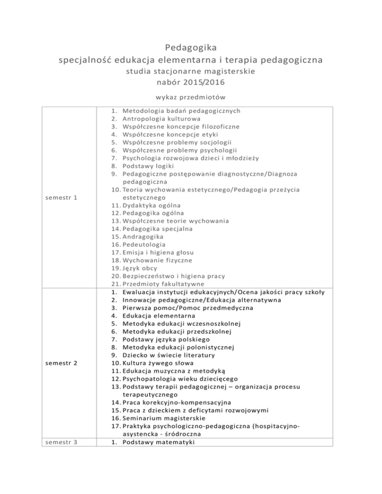 Pedagogika specjalność edukacja elementarna i terapia pedagogiczna studia stacjonarne magisterskie nabór 2015/2016 wykaz przedmiotów 1. 2. 3. 4. 5. 6. 7. 8. 9. semestr 1 semestr 2 semestr 3 Metodologia badań pedagogicznych Antropologia kulturowa Współczesne koncepcje filozoficzne Współczesne koncepcje etyki Współczesne problemy socjologii Współczesne problemy psychologii Psychologia rozwojowa dzieci i młodzieży Podstawy logiki Pedagogiczne postępowanie diagnostyczne/Diagnoza pedagogiczna 10. Teoria wychowania estetycznego/Pedagogia przeżycia estetycznego 11. Dydaktyka ogólna 12. Pedagogika ogólna 13. Współczesne teorie wychowania 14. Pedagogika specjalna 15. Andragogika 16. Pedeutologia 17. Emisja i higiena głosu 18. Wychowanie fizyczne 19. Język obcy 20. Bezpieczeństwo i higiena pracy 21. Przedmioty fakultatywne 1. Ewaluacja instytucji edukacyjnych/Ocena jakości pracy szkoły 2. Innowacje pedagogiczne/Edukacja alternatywna 3. Pierwsza pomoc/Pomoc przedmedyczna 4. Edukacja elementarna 5. Metodyka edukacji wczesnoszkolnej 6. Metodyka edukacji przedszkolnej 7. Podstawy języka polskiego 8. Metodyka edukacji polonistycznej 9. Dziecko w świecie literatury 10. Kultura żywego słowa 11. Edukacja muzyczna z metodyką 12. Psychopatologia wieku dziecięcego 13. Podstawy terapii pedagogicznej – organizacja procesu terapeutycznego 14. Praca korekcyjno-kompensacyjna 15. Praca z dzieckiem z deficytami rozwojowymi 16. Seminarium magisterskie 17. Praktyka psychologiczno-pedagogiczna (hospitacyjnoasystencka - śródroczna 1. Podstawy matematyki 2. 3. 4. 5. 6. 7. 8. 9. semestr 4 Metodyka edukacji matematycznej Podstawy przyrody Metodyka edukacji przyrodniczej Nauka gry na instrumencie Metodyka prowadzenia zajęć technicznych i komputerowych Edukacja plastyczna z metodyką Metodyka wychowania fizycznego i edukacja zdrowotna Metodyka zajęć korekcyjno-kompensacyjnych d la dzieci ze specyficznymi trudnościami w uczeniu się czytania i pisania 10. Metodyka zajęć korekcyjno-kompensacyjnych d la dzieci ze specyficznymi trudnościami w uczeniu się matematyki 11. Metodyka zajęć korekcyjno-kompensacyjnych d la dzieci z niepełnosprawnością intelektualną 12. Przedmioty fakultatywne 13. Edukacja medialna/Nowe technologie w edukacji 14. Metodyka zajęć korekcyjno-kompensacyjnych d la dzieci z dysfunkcją słuchu/Praca korekcyjno-kompensacyjna z dzieckiem z dysfunkcją słuchu 15. Podstawy terapii logopedycznej/Praca terapeutyczna z dzieckiem z zaburzeniami mowy 16. Seminarium magisterskie 17. Praktyka dydaktyczna (hospitacyjno-metodyczna) -śródroczna 1. Prawo oświatowe oraz struktura i funkcje placówek oświatowych/Prawo w oświacie i organizacja placówek edukacyjnych 2. Edukacja regionalna/Dziedzictwo kulturowe regionu 3. Multimedia w terapii/Nowe technologie w pracy terapeutycznej 4. Metodyka zajęć korekcyjno-kompensacyjnych d la dzieci z dysfunkcją wzroku/Praca korekcyjno-kompensacyjna z dzieckiem z dysfunkcja wzroku 5. Metodyka zajęć korekcyjno-kompensacyjnych d la dzieci z niepełnosprawnością sprzężoną/Praca korekcyjnokompensacyjna z dzieckiem z niepełnosprawnością sprzężoną 6. Metodyka zajęć korekcyjno-kompensacyjnych d la dzieci z zaburzeniami zachowania/Praca korekcyjno-kompensacyjna z dzieckiem z zaburzeniami zachowania 7. Muzyka w pracy terapeutycznej/Muzykoterapia 8. Plastyka w pracy terapeutycznej/Arteterapia 9. Komunikacja AAC/Wspomagające i alternatywne metody komunikacji 10. Seminarium magisterskie 11. Praktyka dydaktyczna (metodyczna) - (ciągła) opiekun roku: dr Justyna Wojciechowska