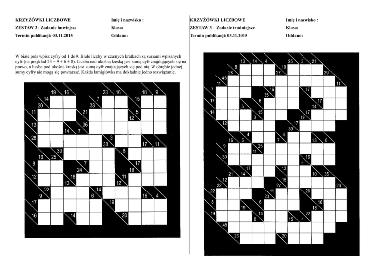 KRZYŻÓWKI LICZBOWE Imię i nazwisko : ZESTAW 3