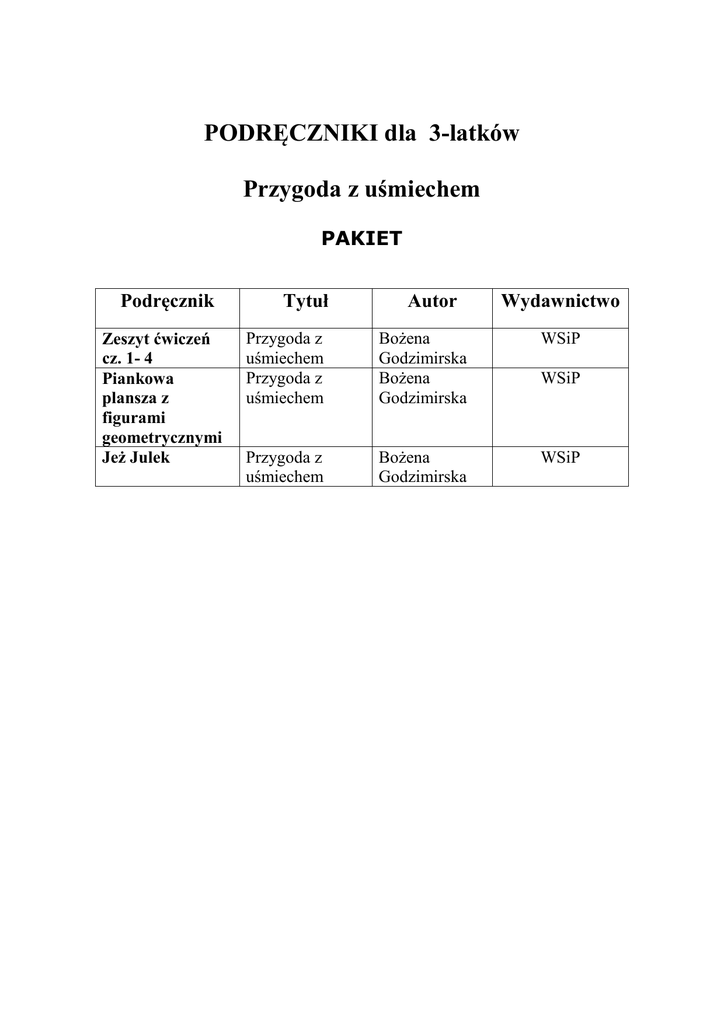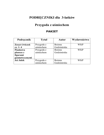 PODRĘCZNIKI dla 3-latków Przygoda z uśmiechem PAKIET Podręcznik Zeszyt ćwiczeń cz. 1- 4 Piankowa plansza z figurami geometrycznymi Jeż Julek Tytuł Autor Przygoda z uśmiechem Przygoda z uśmiechem Bożena Godzimirska Bożena Godzimirska Przygoda z uśmiechem Bożena Godzimirska Wydawnictwo WSiP WSiP WSiP PODRĘCZNIKI dla 4-latków Przygoda z uśmiechem PAKIET Podręcznik tytuł Autor Wydawnictwo Zeszyt ćwiczeń cz. 14 Kolorowe patyczki piankowe Jeż Julek Przygoda z uśmiechem Bożena Godzimirska WSiP Przygoda z uśmiechem Bożena Godzimirska WSiP Przygoda z uśmiechem Bożena Godzimirska WSiP PODRĘCZNIKI dla 5-latków Tropiciele Roczne przygotowanie przedszkolne PAKIET Podręcznik tytuł Autor Wydawnictwo Karty pracy cz. 1 - 4 Tropiciele Beata Gawrońska Emilia Raczek WSiP Wyprawka plastyczna Wyprawka matematyczna Zeszyt grafomotoryczny Wielka księga tropicieli Tropiciele Beata Gawrońska Emilia Raczek Beata Gawrońska Emilia Raczek Beata Gawrońska Emilia Raczek Beata Gawrońska Emilia Raczek WSiP Tropiciele Tropiciele Tropiciele WSiP WSiP WSiP PODRĘCZNIKI dla 6-latków Paczka Puszatka Roczne przygotowanie przedszkolne PAKIET Podręcznik tytuł Autor Wydawnictwo WSiP Karty pracy cz. 1 - 4 Paczka Puszatka Piszę Paczka Puszatka Liczę Paczka Puszatka A. Borchard J. Dziejówska WSiP Czytam Paczka Puszatka A. Borchard J. Dziejówska WSiP A. Borchard J. Dziejówska A. Borchard J. Dziejówska WSiP Wykaz podręczników klasa VI Autor Hanna Dobrowolska, Urszula Dobrowolska Wydawnictwo Przedmiot Tytuł podręcznika ,, Jutro pójdę w świat”- J. polski podręcznik do kształcenia literackiego, kulturowego i językowego zeszyt ćwiczeń Matematyka ,,Matematyka Wokół Nas’’ zeszyt ćw. 1,2 Wczoraj i dziś podręcznik i ćwiczenie kl. VI ,,Odkrywamy na nowo” Podręcznik część komunikacyjna Podręcznik część techniczna Smart Junior 6 Helena Lewicka Marianna Kowalczyk Grzegorz Wojciechowski WSiP Nowa Era Urszula Białka Jerzy Chrabąszcz OPERON H. Q. Michel mm publication Punkt podręcznik z ćwiczeniem + CD ,, Tajemnice Przyrody” podręcznik zeszyt ćwiczeń cz.1,2 Atlas do przyroda Anna Potapowicz WSiP Historia Technika J. angielski J. niemiecki Przyroda Religia Plastyka dla klas Muzyka Zajęcia komputerowe Tajemnice Bogatego życia - podręcznik Do dzieła klasy IV-VI I gra muzyka podręcznik + zeszyt ćwiczeń Zajęcia komputerowe dla szkoły podstawowej dla kl. IV -VI WSiP Urszula Białka M. M.Worłowska F. Szlajfer, J. Stawarz J. Golonko, U. Moździerz, J. Stawarz S. D. Adamek M. Chomać Jadwiga Lukas Krystyna Onak Monika Gromek Grażyna Kilbach G. Koba NOWA ERA Jedność ROŻAK Nowa Era MIGRA