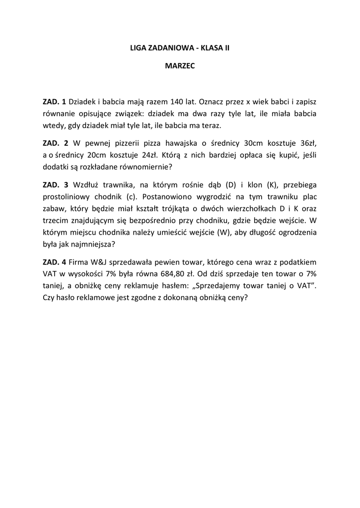 LIGA ZADANIOWA - KLASA II MARZEC ZAD. 1 Dziadek i babcia mają razem 140 lat. Oznacz przez x wiek babci i zapisz równanie opisujące związek: dziadek ma dwa razy tyle lat, ile miała babcia wtedy, gdy dziadek miał tyle lat, ile babcia ma teraz. ZAD. 2 W pewnej pizzerii pizza hawajska o średnicy 30cm kosztuje 36zł, a o średnicy 20cm kosztuje 24zł. Którą z nich bardziej opłaca się kupić, jeśli dodatki są rozkładane równomiernie? ZAD. 3 Wzdłuż trawnika, na którym rośnie dąb (D) i klon (K), przebiega prostoliniowy chodnik (c). Postanowiono wygrodzić na tym trawniku plac zabaw, który będzie miał kształt trójkąta o dwóch wierzchołkach D i K oraz trzecim znajdującym się bezpośrednio przy chodniku, gdzie będzie wejście. W którym miejscu chodnika należy umieścić wejście (W), aby długość ogrodzenia była jak najmniejsza? ZAD. 4 Firma W&J sprzedawała pewien towar, którego cena wraz z podatkiem VAT w wysokości 7% była równa 684,80 zł. Od dziś sprzedaje ten towar o 7% taniej, a obniżkę ceny reklamuje hasłem: „Sprzedajemy towar taniej o VAT”. Czy hasło reklamowe jest zgodne z dokonaną obniżką ceny?