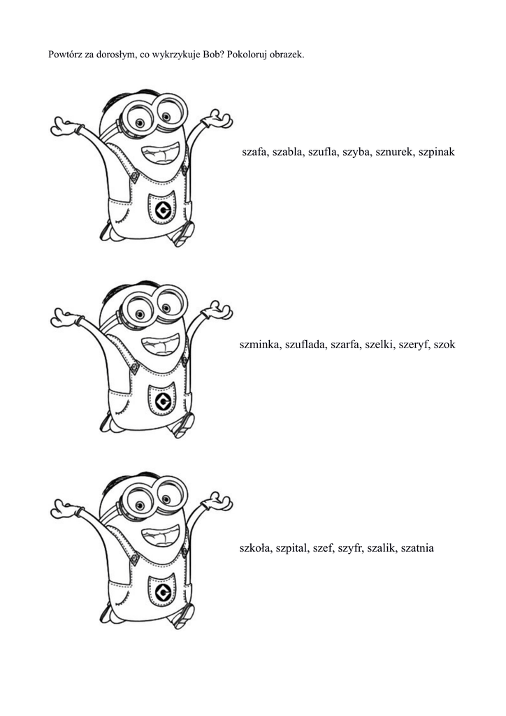 Powtórz za dorosłym, co wykrzykuje Bob? Pokoloruj obrazek. szafa, szabla, szufla, szyba, sznurek, szpinak szminka, szuflada, szarfa, szelki, szeryf, szok szkoła, szpital, szef, szyfr, szalik, szatnia
