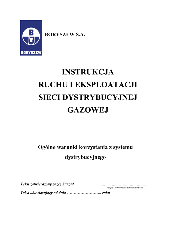 BORYSZEW S.A. INSTRUKCJA RUCHU I EKSPLOATACJI SIECI DYSTRYBUCYJNEJ GAZOWEJ Ogólne warunki korzystania z systemu dystrybucyjnego Tekst zatwierdzony przez Zarząd ……...………………………… Podpis i pieczęć osób zatwierdzających Tekst obowiązujący od dnia …………………….. roku BORYSZEW S.A. Instrukcja Ruchu i Eksploatacji Sieci Dystrybucyjnej Spis treści 1.1 WSTĘP .................................................................................................................................. 4 Operator Systemu Dystrybucyjnego........................................................................................ 4 1.2 DefinicjE ................................................................................................................................. 4 1.3 Wykaz zastosowanych skrótów w I I II CZ. IRIESD............................................................ 10 1.4 Podstawy prawne i zasady obowiązywania IRiESD ............................................................. 11 1.5 Dokumenty związane ............................................................................................................ 12 1.6 Informacje dodatkowe ........................................................................................................... 12 1.7 Procedura aktualizacji IRiESD .............................................................................................. 12 2.1 SYSTEM DYSTRYBUCYJNY .......................................................................................... 13 Opis systemu dystrybucyjnego .............................................................................................. 13 2.2 Przejście ryzyka ..................................................................................................................... 14 2.3 Parametry jakościowe............................................................................................................ 14 2.4 Obszary rozliczeniowe ciepła spalania ORCS ...................................................................... 16 2.5 Ciśnienie paliwa gazowego ................................................................................................... 17 2.6 Wymagania techniczne dla urządzeń i sieci wraz z niezbędną infrastrukturą pomocniczą .. 18 2.7 Połączenia systemu dystrybucyjnego z instalacjami odbiorców ........................................... 18 2.8 Kryteria bezpieczeństwa funkcjonowania systemu dystrybucyjnego ................................... 18 2.9 Współpraca OSD z operatorami systemów współpracujących ............................................. 19 2.10 Prawa i obowiązki odbiorców ............................................................................................... 20 2.11 Planowanie rozwoju systemu dystrybucyjnego ..................................................................... 21 3.1 PRZYŁĄCZANIE DO SYSTEMU DYSTRYBUCYJNEGO ............................................ 22 Zasady przyłączania podmiotów do sieci dystrybucyjnej. .................................................... 22 3.2 Wniosek o określenie warunków przyłączenia do sieci dystrybucyjnej. .............................. 23 3.3 Warunki przyłączenia do sieci dystrybucyjnej. ..................................................................... 23 3.4 Umowa o przyłączenie do sieci dystrybucyjnej. ................................................................... 26 3.5 Wymagania techniczne dla nowych punktów. ...................................................................... 27 4.1 PRAWA I OBOWIĄZKI STRON UMOWY DYSTRYBUCYJNEJ ................................. 27 Strony umowy dystrybucyjnej ............................................................................................... 27 4.2 Prawa i obowiązki Operatora Systemu Dystrybucyjnego ..................................................... 27 4.3 Prawa i obowiązki ZUD ........................................................................................................ 29 4.4 Odpowiedzialność za jakość i ciśnienie paliw gazowych ..................................................... 29 4.5 Siła wyższa ............................................................................................................................ 30 4.6 Zakup paliwa gazowego na potrzeby własne OSD ............................................................... 30 4.7 Standardy jakościowe obsługi użytkowników systemu ........................................................ 30 1. 2. 3. 4. IRiESD – Ogólne warunki korzystania z systemu dystrybucyjnego. Wersja 1.5 Strona 2 z 43 Zatwierdzono Obowiązuje od ………………………………. BORYSZEW S.A. Instrukcja Ruchu i Eksploatacji Sieci Dystrybucyjnej 5.1 WARUNKI ŚWIADCZENIA USŁUGI DYSTRYBUCJI ................................................. 31 Zakres usług świadczonych przez OSD ................................................................................ 31 5.2 Warunki wymagane przy zawarciu umowy dystrybucyjnej .................................................. 31 5.3 Warunki finansowe................................................................................................................ 32 5.4 Warunki techniczne ............................................................................................................... 32 5.5 Terminy składania wniosków o usługę dystrybucji .............................................................. 33 5.6 Złożenie wniosku o zawarcie umowy dystrybucyjnej ........................................................... 33 5.7 Rozpatrywanie wniosku o zawarcie umowy dystrybucyjnej................................................. 33 5.8 Przypadki odmowy zawarcia umowy dystrybucyjnej ........................................................... 34 5.9 Przypadki wypowiedzenia umowy ........................................................................................ 35 5.10 Przyp