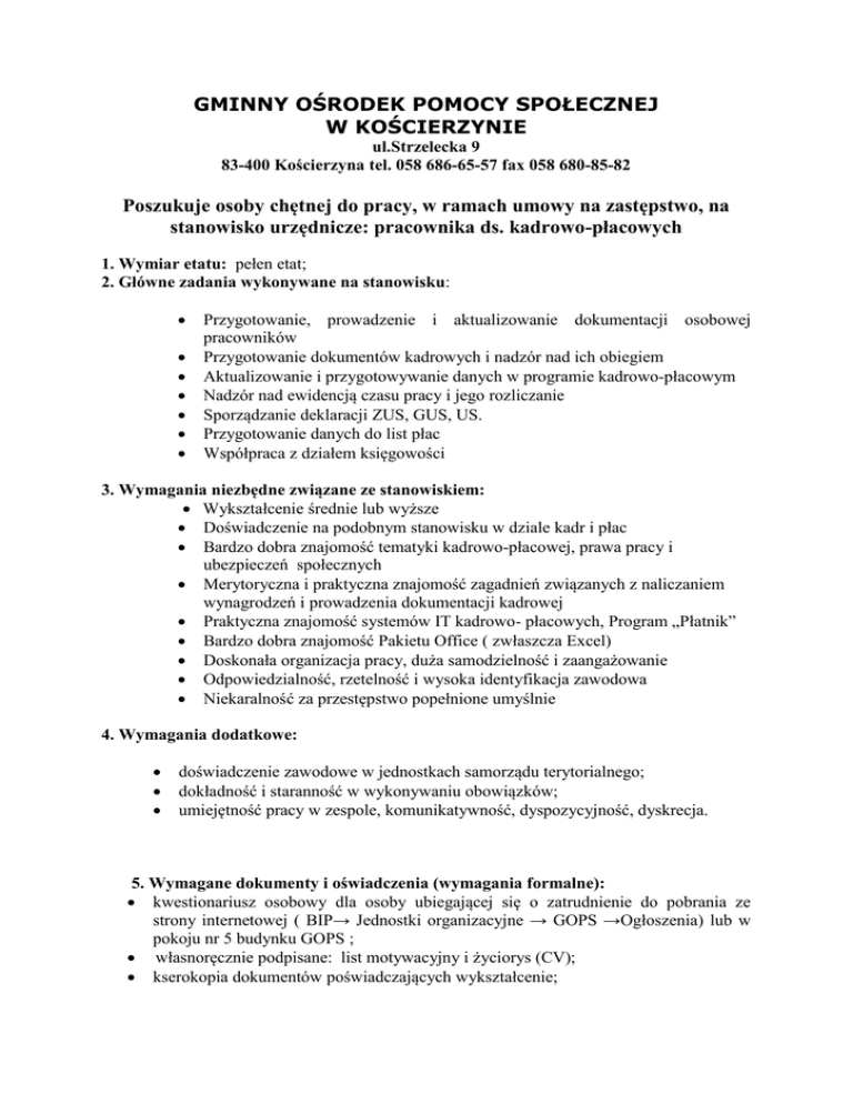 GMINNY OŚRODEK POMOCY SPOŁECZNEJ W KOŚCIERZYNIE ul.Strzelecka 9 83-400 Kościerzyna tel. 058 686-65-57 fax 058 680-85-82 Poszukuje osoby chętnej do pracy, w ramach umowy na zastępstwo, na stanowisko urzędnicze: pracownika ds. kadrowo-płacowych 1. Wymiar etatu: pełen etat; 2. Główne zadania wykonywane na stanowisku: Przygotowanie, prowadzenie i aktualizowanie dokumentacji osobowej pracowników Przygotowanie dokumentów kadrowych i nadzór nad ich obiegiem Aktualizowanie i przygotowywanie danych w programie kadrowo-płacowym Nadzór nad ewidencją czasu pracy i jego rozliczanie Sporządzanie deklaracji ZUS, GUS, US. Przygotowanie danych do list płac Współpraca z działem księgowości 3. Wymagania niezbędne związane ze stanowiskiem: Wykształcenie średnie lub wyższe Doświadczenie na podobnym stanowisku w dziale kadr i płac Bardzo dobra znajomość tematyki kadrowo-płacowej, prawa pracy i ubezpieczeń społecznych Merytoryczna i praktyczna znajomość zagadnień związanych z naliczaniem wynagrodzeń i prowadzenia dokumentacji kadrowej Praktyczna znajomość systemów IT kadrowo- płacowych, Program „Płatnik” Bardzo dobra znajomość Pakietu Office ( zwłaszcza Excel) Doskonała organizacja pracy, duża samodzielność i zaangażowanie Odpowiedzialność, rzetelność i wysoka identyfikacja zawodowa Niekaralność za przestępstwo popełnione umyślnie 4. Wymagania dodatkowe: doświadczenie zawodowe w jednostkach samorządu terytorialnego; dokładność i staranność w wykonywaniu obowiązków; umiejętność pracy w zespole, komunikatywność, dyspozycyjność, dyskrecja. 5. Wymagane dokumenty i oświadczenia (wymagania formalne): kwestionariusz osobowy dla osoby ubiegającej się o zatrudnienie do pobrania ze strony internetowej ( BIP→ Jednostki organizacyjne → GOPS →Ogłoszenia) lub w pokoju nr 5 budynku GOPS ; własnoręcznie podpisane: list motywacyjny i życiorys (CV); kserokopia dokumentów poświadczających wykształcenie; kserokopie zaświadczeń o ukończonych kursach i szkoleniach ( jeżeli takie miały miejsce); kserokopie świadectw pracy; własnoręcznie podpisane oświadczenia: o posiadaniu obywatelstwa polskiego, pełnej zdolności do czynności prawnych, korzystaniu z pełni praw publicznych i niekaralności za przestępstwo popełnione umyślnie. List motywacyjny oraz życiorys powinny być opatrzone klauzulą: „wyrażam zgodę na przetwarzanie moich danych osobowych zawartych w ofercie pracy dla potrzeb niezbędnych do realizacji procesu rekrutacji zgodnie z ustawą z dnia 29 sierpnia 1997 r. o ochronie danych osobowych (Dz.U. z 2002 r. nr 101, poz. 926 z późn. zm.) oraz ustawą z dnia 21 listopad 2008 r. o pracownikach samorządowych (Dz .U. z 2008 r. Nr 223, poz. 1458 z późn. zm.) 6. Wymagane dokumenty aplikacyjne należy składać osobiście w Gminnym Ośrodku Pomocy Społecznej w Kościerzynie (pokój nr 5 budynek GOPS w terminie do dnia 12.11.2015 r.