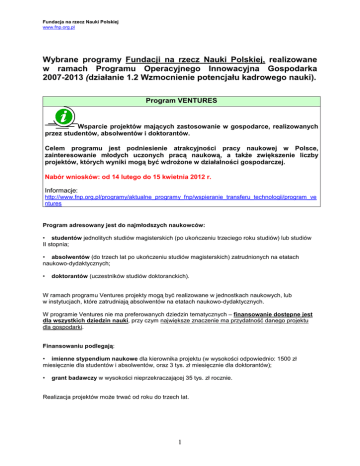 Fundacja na rzecz Nauki Polskiej www.fnp.org.pl Wybrane programy Fundacji na rzecz Nauki Polskiej, realizowane w ramach Programu Operacyjnego Innowacyjna Gospodarka 2007-2013 (działanie 1.2 Wzmocnienie potencjału kadrowego nauki). Program VENTURES Wsparcie projektów mających zastosowanie w gospodarce, realizowanych przez studentów, absolwentów i doktorantów. Celem programu jest podniesienie atrakcyjności pracy naukowej w Polsce, zainteresowanie młodych uczonych pracą naukową, a także zwiększenie liczby projektów, których wyniki mogą być wdrożone w działalności gospodarczej. Nabór wniosków: od 14 lutego do 15 kwietnia 2012 r. Informacje: http://www.fnp.org.pl/programy/aktualne_programy_fnp/wspieranie_transferu_technologii/program_ve ntures Program adresowany jest do najmłodszych naukowców: • studentów jednolitych studiów magisterskich (po ukończeniu trzeciego roku studiów) lub studiów II stopnia; • absolwentów (do trzech lat po ukończeniu studiów magisterskich) zatrudnionych na etatach naukowo-dydaktycznych; • doktorantów (uczestników studiów doktoranckich). W ramach programu Ventures projekty mogą być realizowane w jednostkach naukowych, lub w instytucjach, które zatrudniają absolwentów na etatach naukowo-dydaktycznych. W programie Ventures nie ma preferowanych dziedzin tematycznych – finansowanie dostępne jest dla wszystkich dziedzin nauki, przy czym największe znaczenie ma przydatność danego projektu dla gospodarki. Finansowaniu podlegają: • imienne stypendium naukowe dla kierownika projektu (w wysokości odpowiednio: 1500 zł miesięcznie dla studentów i absolwentów, oraz 3 tys. zł miesięcznie dla doktorantów); • grant badawczy w wysokości nieprzekraczającej 35 tys. zł rocznie. Realizacja projektów może trwać od roku do trzech lat. 1 Fundacja na rzecz Nauki Polskiej www.fnp.org.pl Program HOMING PLUS Subsydia dla młodych uczonych zachęcające do podjęcia pracy badawczej w Polsce. Celem programu jest zachęcenie młodych uczonych do powrotu (w przypadku uczonych polskich) lub przyjazdu do Polski (w przypadku uczonych z zagranicy). Nabór wniosków: od 14 stycznia do 15 marca 2012 r. Informacje: http://www.fnp.org.pl/programy/aktualne_programy_fnp/stypendia_i_subsydia/program_homing_plus W programie mogą brać udział także przedstawiciele innych nauk (w tym humanistycznych i społecznych). Projekty niemieszczące się w zakresie Bio, Info, Techno są finansowane ze środków własnych Fundacji. Program jest adresowany do osób, które: • posiadają co najmniej stopień naukowy doktora i znajdują się na wczesnym etapie kariery naukowej (do 4 lat po doktoracie*); • przebywały za granicą nieprzerwanie co najmniej 9 miesięcy** (prowadząc badania naukowe, odbywając staż podoktorski lub przygotowując pracę doktorską); • zamierzają przyjechać do Polski w terminie do 6 miesięcy od końcowej daty przyjmowania wniosków lub przyjechały do Polski nie wcześniej niż 12 miesięcy przed tą datą; • pracują w Polsce w jednostce prowadzącej badania naukowe lub uzyskały z niej promesę zatrudnienia co najmniej na czas projektu. *termin ten ulega przedłużeniu o 2 lata w przypadku kobiet posiadających dziecko oraz mężczyzn, którzy korzystali z urlopów ojcowskich lub wychowawczych nieprzerwanie przez min. 3 miesiące. **wymagany okres pobytu za granicą może ulec skróceniu w przypadku zawarcia przez Fundację szczegółowego porozumienia dotyczącego przyjazdów do Polski naukowców z danej zagranicznej instytucji naukowej Podstawę oceny kandydata stanowią dorobek naukowy z ostatnich 4 lat, projekt badawczy, który kandydat zamierza realizować w trakcie subsydium oraz informacje o zespole, w którym projekt będzie realizowany. Finansowaniu podlegają: • subsydium badawcze w wysokości do 80 tys. zł rocznie(przeznaczone wyłącznie na realizację projektu badawczego, m.in.: wynagrodzenia personelu, zakupy aparatury, materiałów niezbędnych do prowadzenia badań, publikacji naukowych, sprzętu i oprogramowania komputerowego, finansowanie współpracy z partnerami zagranicznymi); • stypendium naukowe w wysokości 5 tys. zł miesięcznie. Na wniosek laureata programu (kierownika projektu): • stypendia naukowe w wys. 1 tys. zł miesięcznie dla dwóch studentów realizujących jednocześnie prace magisterskie pod jego kierunkiem, wyłonionych w trybie konkursowym. Projekt realizowany w ramach programu może trwać od 1 roku do 2 lat. 2 Fundacja na rzecz Nauki Polskiej www.fnp.org.pl Program POMOST Granty dla rodziców ułatwiające powrót do pracy naukowej oraz wspierające kobiety w ciąży pracujące naukowo. Celem programu jest umożliwienie najlepszym naukowcom wychowującym małe dzieci powrót do zaawansowanej pracy naukowej oraz ułatwienie kobietom w ciąży prowadzenia projektów badawczych finansowanych ze źródeł zewnętrznych. Nabór wniosków: do 15 marca 2012 r. Informacje: http://www.fnp.org.pl/programy/aktualne_programy_fnp/stypendia_i_subsydia/program_pomost W programie mogą brać udział także przedstawiciele innych nauk (w tym humanistycznych i społecznych). Projekty niemieszczące się w zakresie Bio, Info, Techno są finansowane ze środków własnych Fundacji. Program przewiduje dwa rodzaje wsparcia: 1) GRANT POWROTOWY - finansowanie projektów realizowanych przez badaczy obu płci wychowujących małe dzieci Grant powrotowy jest adresowany do naukowców, którzy posiadają co najmniej stopień naukowy doktora, pracują w polskiej jednostce prowadzącej badania naukowe lub uzyskali z niej promesę zatrudnienia co najmniej na czas trwania projektu. Wnioski mogą być składane przez kobiety, które posiadają dziecko w wieku do lat 4 (lub 7 lat w przypadku adopcji lub porodu mnogiego) oraz mężczyzn, którzy korzystali z urlopów lub przerw w pracy związanych z posiadaniem takiego dziecka, trwających nieprzerwanie przez okres co najmniej 6 miesięcy, przy czym