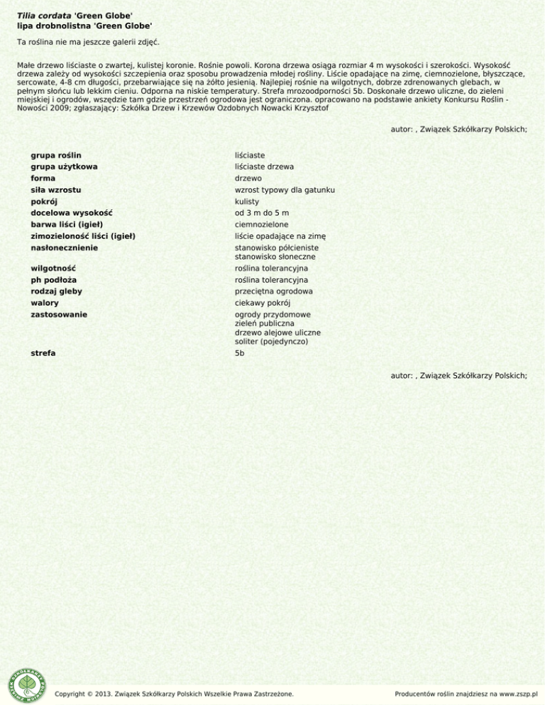 Tilia cordata 'Green Globe' lipa drobnolistna 'Green Globe' Ta roślina nie ma jeszcze galerii zdjęć. Małe drzewo liściaste o zwartej, kulistej koronie. Rośnie powoli. Korona drzewa osiąga rozmiar 4 m wysokości i szerokości. Wysokość drzewa zależy od wysokości szczepienia oraz sposobu prowadzenia młodej rośliny. Liście opadające na zimę, ciemnozielone, błyszczące, sercowate, 4-8 cm długości, przebarwiające się na żółto jesienią. Najlepiej rośnie na wilgotnych, dobrze zdrenowanych glebach, w pełnym słońcu lub lekkim cieniu. Odporna na niskie temperatury. Strefa mrozoodporności 5b. Doskonałe drzewo uliczne, do zieleni miejskiej i ogrodów, wszędzie tam gdzie przestrzeń ogrodowa jest ograniczona. opracowano na podstawie ankiety Konkursu Roślin Nowości 2009; zgłaszający: Szkółka Drzew i Krzewów Ozdobnych Nowacki Krzysztof autor: , Związek Szkółkarzy Polskich; grupa roślin liściaste grupa użytkowa liściaste drzewa forma drzewo siła wzrostu wzrost typowy dla gatunku pokrój kulisty docelowa wysokość od 3 m do 5 m barwa liści (igieł) ciemnozielone zimozieloność liści (igieł) liście opadające na zimę nasłonecznienie stanowisko półcieniste stanowisko słoneczne wilgotność roślina tolerancyjna ph podłoża roślina tolerancyjna rodzaj gleby przeciętna ogrodowa walory ciekawy pokrój zastosowanie ogrody przydomowe zieleń publiczna drzewo alejowe uliczne soliter (pojedynczo) strefa 5b autor: , Związek Szkółkarzy Polskich; Copyright © 2013. Związek Szkółkarzy Polskich Wszelkie Prawa Zastrzeżone. Producentów roślin znajdziesz na www.zszp.pl