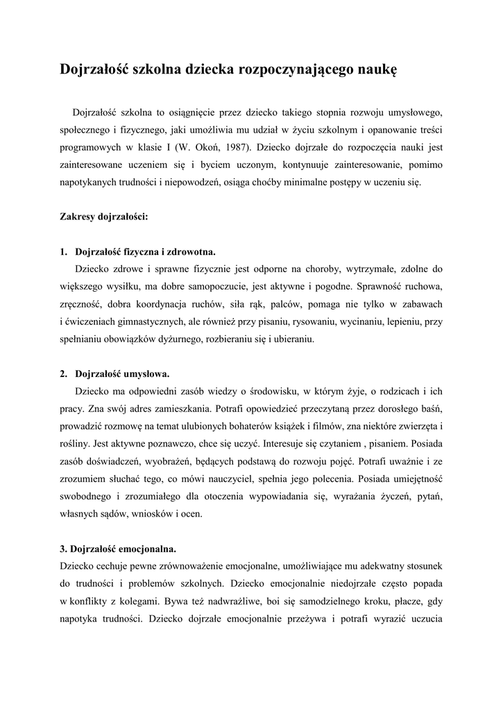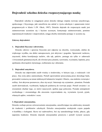 Dojrzałość szkolna dziecka rozpoczynającego naukę Dojrzałość szkolna to osiągnięcie przez dziecko takiego stopnia rozwoju umysłowego, społecznego i fizycznego, jaki umożliwia mu udział w życiu szkolnym i opanowanie treści programowych w klasie I (W. Okoń, 1987). Dziecko dojrzałe do rozpoczęcia nauki jest zainteresowane uczeniem się i byciem uczonym, kontynuuje zainteresowanie, pomimo napotykanych trudności i niepowodzeń, osiąga choćby minimalne postępy w uczeniu się. Zakresy dojrzałości: 1. Dojrzałość fizyczna i zdrowotna. Dziecko zdrowe i sprawne fizycznie jest odporne na choroby, wytrzymałe, zdolne do większego wysiłku, ma dobre samopoczucie, jest aktywne i pogodne. Sprawność ruchowa, zręczność, dobra koordynacja ruchów, siła rąk, palców, pomaga nie tylko w zabawach i ćwiczeniach gimnastycznych, ale również przy pisaniu, rysowaniu, wycinaniu, lepieniu, przy spełnianiu obowiązków dyżurnego, rozbieraniu się i ubieraniu. 2. Dojrzałość umysłowa. Dziecko ma odpowiedni zasób wiedzy o środowisku, w którym żyje, o rodzicach i ich pracy. Zna swój adres zamieszkania. Potrafi opowiedzieć przeczytaną przez dorosłego baśń, prowadzić rozmowę na temat ulubionych bohaterów książek i filmów, zna niektóre zwierzęta i rośliny. Jest aktywne poznawczo, chce się uczyć. Interesuje się czytaniem , pisaniem. Posiada zasób doświadczeń, wyobrażeń, będących podstawą do rozwoju pojęć. Potrafi uważnie i ze zrozumiem słuchać tego, co mówi nauczyciel, spełnia jego polecenia. Posiada umiejętność swobodnego i zrozumiałego dla otoczenia wypowiadania się, wyrażania życzeń, pytań, własnych sądów, wniosków i ocen. 3. Dojrzałość emocjonalna. Dziecko cechuje pewne zrównoważenie emocjonalne, umożliwiające mu adekwatny stosunek do trudności i problemów szkolnych. Dziecko emocjonalnie niedojrzałe często popada w konflikty z kolegami. Bywa też nadwrażliwe, boi się samodzielnego kroku, płacze, gdy napotyka trudności. Dziecko dojrzałe emocjonalnie przeżywa i potrafi wyrazić uczucia wdzięczności, przyjaźni, życzliwości, odczuwa więź uczuciową ze swoją klasą i nauczycielem jest ambitne, wrażliwe na pochwały i uwagi krytyczne. 4. Dojrzałość społeczna. Dziecko jest w znacznym stopniu samodzielne. Potrafi współdziałać z kolegami w nauce, zabawie i pracy. Przeżywa wspólnie radość z powodu osiągnięć klasy i poszczególnych uczniów. Wykonując zadania na rzecz grupy dba o porządek w klasie. Dziecku niedojrzałemu społecznie trudno jest zrozumieć, że w klasie wszyscy mają jednakowe prawa. Słaby rozwój społeczny wyraża się w niezdyscyplinowaniu, niechęci do wykonywania poleceń nauczyciela, bądź w zachowaniu przekornym i samowolnym. Dojrzałość społeczna wyraża się także w umiejętności oceniania postępowania swego i kolegów i odpowiedniej reakcji np. powstrzymywania się od zachowania niewłaściwego (np. przebieganie przez jezdnię, niszczenie wspólnego dobra, bicia się z kolegami), a nawet zaprotestowania i nie poddawania się złym przykładom.