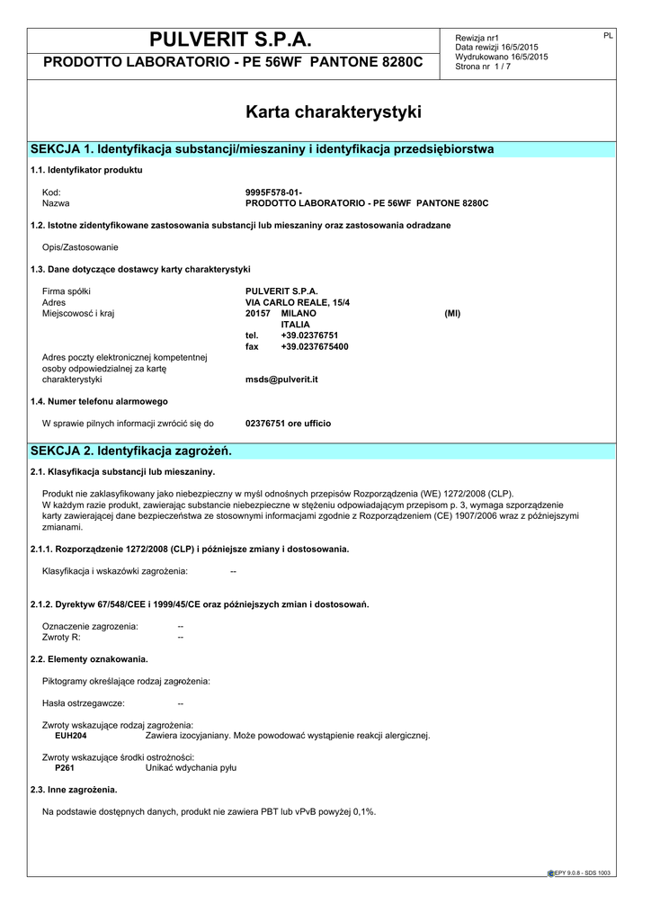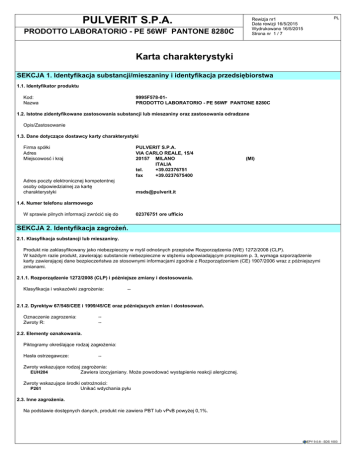 PULVERIT S.P.A. PL Rewizja nr1 Data rewizji 16/5/2015 Wydrukowano 16/5/2015 Strona nr 1 / 7 PRODOTTO LABORATORIO - PE 56WF PANTONE 8280C Karta charakterystyki SEKCJA 1. Identyfikacja substancji/mieszaniny i identyfikacja przedsiębiorstwa 1.1. Identyfikator produktu Kod: Nazwa 9995F578-01PRODOTTO LABORATORIO - PE 56WF PANTONE 8280C 1.2. Istotne zidentyfikowane zastosowania substancji lub mieszaniny oraz zastosowania odradzane Opis/Zastosowanie 1.3. Dane dotyczące dostawcy karty charakterystyki Firma spółki Adres Miejscowosć i kraj PULVERIT S.P.A. VIA CARLO REALE, 15/4 20157 MILANO ITALIA tel. +39.02376751 fax +39.0237675400 Adres poczty elektronicznej kompetentnej osoby odpowiedzialnej za kartę charakterystyki (MI) [email protected] 1.4. Numer telefonu alarmowego W sprawie pilnych informacji zwrócić się do 02376751 ore ufficio SEKCJA 2. Identyfikacja zagrożeń. 2.1. Klasyfikacja substancji lub mieszaniny. Produkt nie zaklasyfikowany jako niebezpieczny w myśl odnośnych przepisów Rozporządzenia (WE) 1272/2008 (CLP). W każdym razie produkt, zawierając substancie niebezpieczne w stężeniu odpowiadającym przepisom p. 3, wymaga szporządzenie karty zawierającej dane bezpieczeństwa ze stosownymi informacjami zgodnie z Rozporządzeniem (CE) 1907/2006 wraz z późniejszymi zmianami. 2.1.1. Rozporządzenie 1272/2008 (CLP) i późniejsze zmiany i dostosowania. Klasyfikacja i wskazówki zagrożenia: -- 2.1.2. Dyrektyw 67/548/CEE i 1999/45/CE oraz późniejszych zmian i dostosowań. Oznaczenie zagrozenia: Zwroty R: --- 2.2. Elementy oznakowania. -Piktogramy określające rodzaj zagrożenia: Hasła ostrzegawcze: -- Zwroty wskazujące rodzaj zagrożenia: EUH204 Zawiera izocyjaniany. Może powodować wystąpienie reakcji alergicznej. Zwroty wskazujące środki ostrożności: P261 Unikać wdychania pyłu 2.3. Inne zagrożenia. Na podstawie dostępnych danych, produkt nie zawiera PBT lub vPvB powyżej 0,1%. EPY 9.0.8 - SDS 1003 PULVERIT S.P.A. PRODOTTO LABORATORIO - PE 56WF PANTONE 8280C PL Rewizja nr1 Data rewizji 16/5/2015 Wydrukowano 16/5/2015 Strona nr 2 / 7 SEKCJA 3. Skład/informacja o składnikach. 3.1. Substancje. Nie dotyczy. 3.2. Mieszaniny. Zawiera: Identyfikacja. Stęż. %. Klasyfikacja 67/548/CEE. Klasyfikacja 1272/2008 (CLP). SIARCZAN BAROWY 58,8% - pierwiastka metalicznego CAS. 7727-43-7 10,5 - 12 WE. 231-784-4 INDEX. Nr. Rej. 01-2119491274-35 Substancja o obowiązującym we Wspólnocie najwyższym dopuszc zalnym stężeniu w srodowisku pracy. Uwaga: Górna wartość zakresu nie wliczana. Pełne znaczenie zwrotów (R) i symboli zagrożenia (H) ujęto w p. 16 karty. T+ = Bardzo Toksyczny(T+), T = Toksyczny(T), Xn = Szkodliwy(Xn), C = Żracy(C), Xi = Drażniący(Xi), O = Utleniający(O), E = Wybuchowy(E), F+ = Skrajnie Łatwopalny(F+), F = Wysoce Łatwopalny(F), N = Niebezpieczny dla Środowiska(N) SEKCJA 4. Środki pierwszej pomocy. 4.1. Opis środków pierwszej pomocy. Nie są wymagane. W kazdym razie, zaleca się przestrzegać przepisów higieny pracy. 4.2. Najważniejsze ostre i opóźnione objawy oraz skutki narażenia. Nie są znane przypadki ujemnego skutkowania produktu na zdrowie. 4.3. Wskazania dotyczące wszelkiej natychmiastowej pomocy lekarskiej i szczególnego postępowania z poszkodowanym. Brak. SEKCJA 5. Postępowanie w przypadku pożaru. 5.1. Środki gaśnicze. ZALECANE ŚRODKI GAŚNICZE Zwykłe środki gaśnicze: dwutlenek węgla, piana, proszki gaśnicze i mgła chłodziwa. NIE ZALECANE ŚRODKI GAŚNICZE Żaden. 5.2. Szczególne zagrożenia związane z substancją lub mieszaniną. ZAGROŻENIA ZWIĄZANE Z EKSPOZYCJĄ NA POŻAR Unikać wdychania produktów rozkładu. Produkt jest łatwopalny, dane stężenie pyłu rozproszonego w powietrzu ze źródłem zapłonu w pobliżu może wytworzyć z powietrzem mieszaniny wybuchowe. Produkt stały, w przypadku niezamierzonego wydostania się z pojemnika, narażony na wysokie temperatury lub w kontakcie źródła zapłonu, może wywołać lub rozprzestrzenić pożar. 5.3. Informacje dla straży pożarnej. WSKAZÓWKI OGÓLNE Pojemniki chłodzić strumieniami wody, aby zapobiec rozkładowi produktu i powstaniu substancji potencjalnie szkodliwych dla zdrowia. Wyposażenie ochrony przeciwpożarowej należy stosować zawsze w komplecie. Zebrać mieszaninę gaśniczą nie odprowadzając do kanalizacji. Zanieczyszczoną wodę i pozostałości gaśnicze skierować do zniszczenia zgodnie z obowiązującymi normami. WYPOSAŻENIE OCHRONNE Stosowna odzież przeznaczona do akcji przeciwpożarowej, tj aparat powietrzny butlowy ze sprężonym powietrzem i otwartym obwodem (EN 137), odzież ognioodporna (EN469), rękawice ognioodporne (EN659) i obuwie wysokie dla strażaków (HO A29 lub A30). SEKCJA 6. Postępowanie w przypadku niezamierzonego uwolnienia do środowiska. 6.1. Indywidualne środki ostrożności, wyposażenie ochronne i procedury w sytuacjach awaryjnych. W przypadku par lub pyłu rozproszonych w powietrzu stosować ochronę dróg oddechowych. Niniejsze wskazówki odnoszą się do osób uczestniczących w obrocie substancją, jak również w przypadku sytuacji awaryjnej. EPY 9.0.8 - SDS 1003 PULVERIT S.P.A. PRODOTTO LABORATORIO - PE 56WF PANTONE 8280C SEKCJA 6. Postępowanie w przypadku niezamierzonego uwolnienia do środowiska. PL Rewizja nr1 Data rewizji 16/5/2015 Wydrukowano 16/5/2015 Strona nr 3 / 7 ... / >> 6.2. Środki ostrożności w zakresie ochrony środowiska. Unikać przedostania się produktu do kanalizacji, do wód powierzchniowych i do wód gruntowych. 6.3. Metody i materiały zapobiegające rozprzestrzenianiu się skażenia i służące do usuwania skażenia. Potraktować ziemią lub kruszywem. Zebrać większość materiału i usunąć pozostałości za pomocą strumieni wody. Likwidacja zanieczyszczonego materiału winna się odbywać zgodnie z wytycznymi zawartymi w punkcie 13. 6.4. Odniesienia do innych sekcji. Ewentualne informacje odnośnie do ochrony indywidualnej i postępowaniem z odpadami podano
