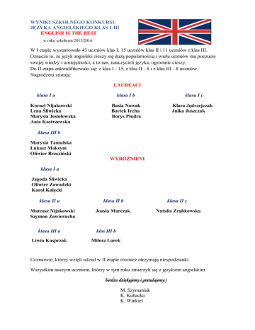 WYNIKI SZKOLNEGO KONKURSU JĘZYKA ANGIELSKIEGO KLAS I-III ENGLISH IS THE BEST w roku szkolnym 2015/2016 W I etapie wystartowało 43 uczniów klas I, 15 uczniów klas II i 11 uczniów z klas III. Oznacza to, że język angielski cieszy się dużą popularnością i wielu uczniów ma poczucie swojej wiedzy i umiejętności, a to nas, nauczycieli języka, ogromnie cieszy. Do II etapu zakwalifikowało się: z klas I - 15, z klas II - 8 i z klas III - 8 uczniów. Nagrodzeni zostają: LAUREACI klasa I a Kornel Nijakowski Lena Śliwicka Marysia Jesiołowska Ania Kostrzewska klasa I b klasa I c Basia Nowak Bartek Ircha Borys Pludra Klara Jędrzejczak Julka Juszczak klasa III b Marysia Tamulska Łukasz Maksym Oliwier Brzeziński WYRÓŻNIENI klasa I a Jagoda Śliwicka Oliwier Zawadzki Karol Kałęcki klasa II a Mateusz Nijakowski Szymon Zawierucha klasa II b klasa II c Joasia Marczak Natalia Zrąbkowska klasa III a klas III b Liwia Kasprzak Miłosz Larek Uczniowie, którzy wzięli udział w II etapie również otrzymają niespodzianki. Wszystkim naszym uczniom, którzy w tym roku zmierzyli się z językiem angielskim bardzo dziękujemy i gratulujemy:) M. Szymaniak K. Kubacka K. Winkiel