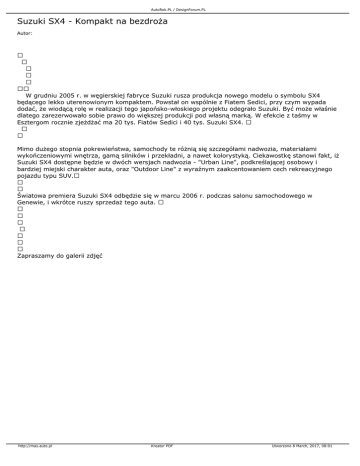 AutoRok.PL / DesignForum.PL Suzuki SX4 - Kompakt na bezdroża Autor: W grudniu 2005 r. w węgierskiej fabryce Suzuki rusza produkcja nowego modelu o symbolu SX4 będącego lekko uterenowionym kompaktem. Powstał on wspólnie z Fiatem Sedici, przy czym wypada dodać, że wiodącą rolę w realizacji tego japońsko-włoskiego projektu odegrało Suzuki. Być może właśnie dlatego zarezerwowało sobie prawo do większej produkcji pod własną marką. W efekcie z taśmy w Esztergom rocznie zjeżdżać ma 20 tys. Fiatów Sedici i 40 tys. Suzuki SX4. Mimo dużego stopnia pokrewieństwa, samochody te różnią się szczegółami nadwozia, materiałami wykończeniowymi wnętrza, gamą silników i przekładni, a nawet kolorystyką. Ciekawostkę stanowi fakt, iż Suzuki SX4 dostępne będzie w dwóch wersjach nadwozia - "Urban Line", podkreślającej osobowy i bardziej miejski charakter auta, oraz "Outdoor Line" z wyraźnym zaakcentowaniem cech rekreacyjnego pojazdu typu SUV. Światowa premiera Suzuki SX4 odbędzie się w marcu 2006 r. podczas salonu samochodowego w Genewie, i wkrótce ruszy sprzedaż tego auta. Zapraszamy do galerii zdjęć http://mas.auto.pl Kreator PDF Utworzono 8 March, 2017, 08:01