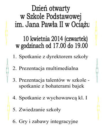 1. Spotkanie z dyrektorem szkoły 2. Prezentacja multimedialna 3. Prezentacja talentów w szkole spotkanie z bohaterami bajek 4. Spotkanie z wychowawcą kl. I 5. Zwiedzanie szkoły 6. Gry i zabawy integracyjne
