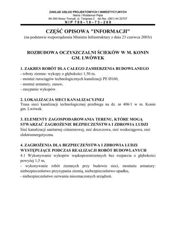 ZAKŁAD USŁUG PROJEKTOWYCH I INWESTYCYJNYCH Maria i Waldemar Pięta 64-300 Nowy Tomyśl, ul. Targowa 2 tel./fax. (061) 44 22727 NIP 788–18–73–268 CZĘŚĆ OPISOWA "INFORMACJI" (na podstawie rozporządzenia Ministra Infrastruktury z dnia 23 czerwca 2003r) ROZBUDOWA OCZYSZCZALNI ŚCIEKÓW W M. KONIN GM. LWÓWEK 1. ZAKRES ROBÓT DLA CAŁEGO ZAMIERZENIA BUDOWLANEGO - roboty ziemne: wykopy o głębokości 1,50 m, - montaż rurociągów technologicznych kanalizacji PE Ø160, - montaż armatury, zasuw, - zasypanie wykopów. 2. LOKALIZACJA SIECI KANALIZACYJNEJ Trasa sieci kanalizacji technologicznej przebiega na dz. nr 406/1 w m. Konin gm. Lwówek. 3. ELEMENTY ZAGOSPODAROWANIA TERENU, KTÓRE MOGĄ STWARZAĆ ZAGROŻENIE BEZPIECZEŃSTWA I ZDROWIA LUDZI Sieć kanalizacji sanitarnej ciśnieniowej, sieć deszczowa, sieć wodociągowa, sieć elektroenergetyczna. 4. ZAGROŻENIA DLA BEZPIECZEŃSTWA I ZDROWIA LUDZI WYSTĘPUJĄCE PODCZAS REALIZACJI ROBÓT BUDOWLANYCH 4.1 Wykonywanie wykopów wąskoprzestrzennych bez rozparcia o głębokości powyżej 1,5 m, - wykonywanie robót ziemnych przy budowie sieci, montażu armatury: niebezpieczeństwo przysypania ziemią, niebezpieczeństwo upadku, - niebezpieczeństwo zerwania nieoznaczonych urządzeń. ZAKŁAD USŁUG PROJEKTOWYCH I INWESTYCYJNYCH Maria i Waldemar Pięta 64-300 Nowy Tomyśl, ul. Targowa 2 tel./fax. (061) 44 22727 NIP 788–18–73–268 5. SPOSÓB PROWADZENIA INSTRUKTAŻU PRACOWNIKÓW PRZED PRZYSTĄPIENIEM DO REALIZACJI ROBÓT SZCZEGÓLNIE NIEBEZPIECZNYCH 5.1 Przy wykonywaniu robót ziemnych, zabezpieczaniu wykopów: wszyscy pracownicy powinni być zapoznani z przepisami zawartymi w Rozporządzeniu Ministra Infrastruktury z dnia 6 lutego 2003r w sprawie bhp przy wykonywaniu robót budowlanych Dz. U. Nr 47 poz. 401. 6. WYKAZ ŚRODKÓW TECHNICZNYCH I ORGANIZACYJNYCH ZAPOBIEGAJĄCYCH NIEBEZPIECZEŃSTWOM WYNIKAJĄCYM Z WYKONYWANIA ROBÓT BUDOWLANYCH W STREFACH SZCZEGÓLNEGO ZAGROŻENIA ZDROWIA: 6.1. Na placu budowy (sporządza kierownik budowy) umieścić wykaz zawierający adresy i numery telefonów: - punktu lekarskiego - Straży Pożarnej - posterunku Policji 6.2. Ogrodzenie terenu budowy wykonać o wys. min.1,5 m, 6.3. Rozmieścić tablice ostrzegawcze, 6.4. Stosować pełne umocnienie wykopu typu boks, 6.5.Wykonać skarpy zabezpieczające wykop przed wodami opadowymi, 6.6. Zejścia do wykopu wykonać co 20 m. Opracował: mgr inż. Waldemar Pięta WKP/0364/PWOS/09 mgr inż. Jerzy Meyza WKP/0293/PWOS/07 ZAKŁAD USŁUG PROJEKTOWYCH I INWESTYCYJNYCH Maria i Waldemar Pięta 64-300 Nowy Tomyśl, ul. Targowa 2 tel./fax. (061) 44 22727 NIP 788–18–73–268