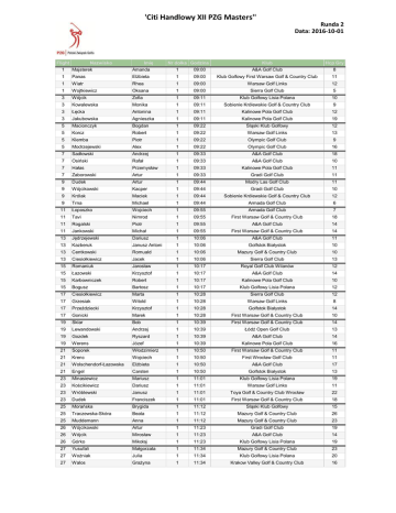 'Citi Handlowy XII PZG Masters'' Runda 2 Data: 2016-10-01 Flight Imię Nazwisko Nr dołka Godzina Klub Hcp Gry 1 Majsterek Amanda 1 09:00 A&A Golf Club 8 1 Panas Elżbieta 1 09:00 Klub Golfowy First Warsaw Golf & Country Club 11 1 Wiatr Rhea 1 09:00 Warsaw Golf Links 12 1 Wojtkiewicz Oksana 1 09:00 Sierra Golf Club 5 3 Wójcik Zofia 1 09:11 Klub Golfowy Lisia Polana 10 3 Kowalewska Monika 1 09:11 Sobienie Królewskie Golf & Country Club 9 3 Łęcka Antonina 1 09:11 Kalinowe Pola Golf Club 12 3 Jakubowska Agnieszka 1 09:11 Kalinowe Pola Golf Club 19 5 Macionczyk Bogdan 1 09:22 Śląski Klub Golfowy 12 5 Korcz Robert 1 09:22 Warsaw Golf Links 13 5 Klemba Piotr 1 09:22 Olympic Golf Club 9 5 Modrzejewski Alex 1 09:22 Olympic Golf Club 16 7 Sadłowski Andrzej 1 09:33 A&A Golf Club 18 7 Osiński Rafał 1 09:33 A&A Golf Club 10 7 Hałas Przemysław 1 09:33 Kalinowe Pola Golf Club 11 7 Zaborowski Artur 1 09:33 Gradi Golf Club 11 9 Dudek Artur 1 09:44 Modry Las Golf Club 11 9 Wójcikowski Kacper 1 09:44 Gradi Golf Club 10 9 Królak Maciek 1 09:44 Sobienie Królewskie Golf & Country Club 12 9 Trna Michael 1 09:44 Armada Golf Club 6 11 Łoposzko Wojciech 1 09:55 Armada Golf Club 7 11 Tavi Nimrod 1 09:55 First Warsaw Golf & Country Club 18 11 Rogalski Piotr 1 09:55 A&A Golf Club 14 11 Jankowski Michał 1 09:55 First Warsaw Golf & Country Club 14 13 Jędrzejewski Dariusz 1 10:06 A&A Golf Club 11 13 Kazberuk Janusz Antoni 1 10:06 Golfstok Białystok 10 13 Centkowski Romuald 1 10:06 Mazury Golf & Country Club 10 13 Ciesiołkiewicz Jacek 1 10:06 Sierra Golf Club 13 15 Romaniuk Jarosław 1 10:17 Royal Golf Club Wilanów 12 15 Łazowski Krzysztof 1 10:17 A&A Golf Club 14 15 Karbowniczek Robert 1 10:17 Kalinowe Pola Golf Club 10 15 Bogusz Bartosz 1 10:17 Klub Golfowy Lisia Polana 12 17 Ciesiołkiewicz Marta 1 10:28 Sierra Golf Club 12 17 Grzesiak Witold 1 10:28 Warsaw Golf Links 8 17 Przeździecki Krzysztof 1 10:28 Golfstok Białystok 14 17 Gonicki Marek 1 10:28 First Warsaw Golf & Country Club 10 19 Sklar Bob 1 10:39 First Warsaw Golf & Country Club 14 19 Lewandowski Andrzej 1 10:39 Łódź Open Golf Club 13 19 Gozdek Ryszard 1 10:39 A&A Golf Club 14 19 Werens Józef 1 10:39 Kalinowe Pola Golf Club 16 21 Soporek Włodzimierz 1 10:50 First Warsaw Golf & Country Club 11 21 Krenc Wojciech 1 10:50 First Wrocław Golf Club 11 21 Wolschendorf-Łazowska Elżbieta 1 10:50 A&A Golf Club 17 21 Engel Carsten 1 10:50 Golfstok Białystok 13 23 Minasiewicz Mariusz 1 11:01 Klub Golfowy Lisia Polana 19 23 Kościkiewicz Dariusz 1 11:01 Warsaw Golf Links 11 23 Wróblewski Janusz 1 11:01 Toya Golf & Country Club Wrocław 22 23 Dudek Franciszek 1 11:01 First Warsaw Golf & Country Club 18 25 Morańska Brygida 1 11:12 Śląski Klub Golfowy 15 25 Traczewska-Skóra Beata 1 11:12 Mazury Golf & Country Club 26 25 Muddemann Anna 1 11:12 Mazury Golf & Country Club 23 26 Wójcikowski Artur 1 11:23 Gradi Golf Club 19 26 Wójcik Mirosław 1 11:23 A&A Golf Club 14 26 Górko Mikołaj 1 11:23 Klub Golfowy Lisia Polana 19 27 Yusufali Małgorzata 1 11:34 Mazury Golf & Country Club 23 27 Woźniak Julia 1 11:34 Klub Golfowy Lisia Polana 20 27 Walos Grażyna 1 11:34 Krakow Valley Golf & Country Club 16