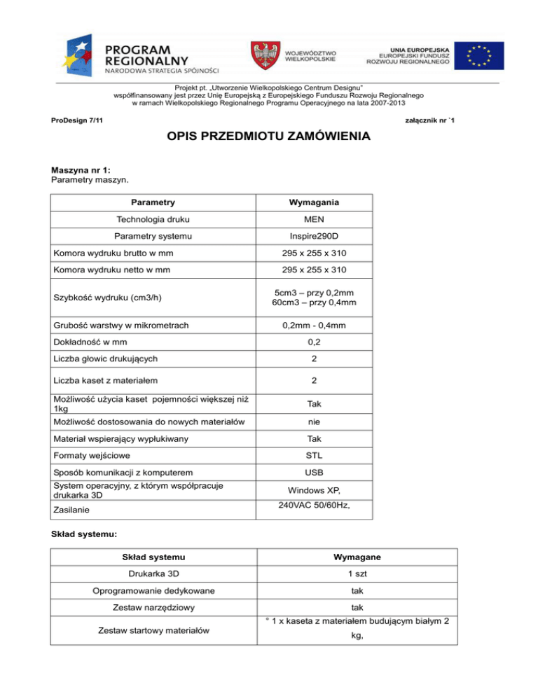 Projekt pt. „Utworzenie Wielkopolskiego Centrum Designu” współfinansowany jest przez Unię Europejską z Europejskiego Funduszu Rozwoju Regionalnego w ramach Wielkopolskiego Regionalnego Programu Operacyjnego na lata 2007-2013 załącznik nr `1 ProDesign 7/11 OPIS PRZEDMIOTU ZAMÓWIENIA Maszyna nr 1: Parametry maszyn. Parametry Wymagania Technologia druku MEN Parametry systemu Inspire290D Komora wydruku brutto w mm 295 x 255 x 310 Komora wydruku netto w mm 295 x 255 x 310 Szybkość wydruku (cm3/h) Grubość warstwy w mikrometrach Dokładność w mm 5cm3 – przy 0,2mm 60cm3 – przy 0,4mm 0,2mm - 0,4mm 0,2 Liczba głowic drukujących 2 Liczba kaset z materiałem 2 Możliwość użycia kaset pojemności większej niż 1kg Tak Możliwość dostosowania do nowych materiałów nie Materiał wspierający wypłukiwany Tak Formaty wejściowe STL Sposób komunikacji z komputerem USB System operacyjny, z którym współpracuje drukarka 3D Windows XP, 240VAC 50/60Hz, Zasilanie Skład systemu: Skład systemu Wymagane Drukarka 3D 1 szt Oprogramowanie dedykowane tak Zestaw narzędziowy tak ° 1 x kaseta z materiałem budującym białym 2 Zestaw startowy materiałów kg, Projekt pt. „Utworzenie Wielkopolskiego Centrum Designu” współfinansowany jest przez Unię Europejską z Europejskiego Funduszu Rozwoju Regionalnego w ramach Wielkopolskiego Regionalnego Programu Operacyjnego na lata 2007-2013 załącznik nr `1 ProDesign 7/11 ° 1 x kaseta z materiałem wspierającym 2 kg Instalacja Tak, u Zamawiającego Szkolenie Tak, 8h dla 4 osób Gwarancja 12 miesięcy Instrukcja w języku polskim i angielskim tak Maszyna nr 2: Minimalne parametry maszyny. Parametr Wymagania Technologia druku POLYJET Parametry systemu Objet24 Komora wydruku brutto w mm Komora wydruku netto w mm Szybkość wydruku (mm/h/pasek 65mm) Rozdzielczość X,Y,Z w dpi 240x200x150 234,4x192,7x150 8 600x600x900 Grubość warstwy w mikrometrach 28 Dokładność w mm 0,1 Liczba głowic drukujących 2 Liczba kaset z materiałem 4 Możliwość użycia kaset o pojemności 1kg Tak Możliwość dostosowania do nowych materiałów nie Materiał wspierający wypłukiwany wodą Tak Formaty wejściowe Sposób komunikacji z komputerem STL, SLC LAN – TCP/IP System operacyjny, z którym współpracuje drukarka 3D Windows XP, Windows7 Zasilanie 240VAC 50/60Hz, 1,5KW prąd jednofazowy Zewnętrzne wymiary drukarki 3D w mm Waga maszyny 825x620x590 93 kg Projekt pt. „Utworzenie Wielkopolskiego Centrum Designu” współfinansowany jest przez Unię Europejską z Europejskiego Funduszu Rozwoju Regionalnego w ramach Wielkopolskiego Regionalnego Programu Operacyjnego na lata 2007-2013 załącznik nr `1 ProDesign 7/11 Skład systemu: Skład systemu Wymagania minimalne Drukarka 3D 1 szt Oprogramowanie dedykowane tak System zarządzania materiałem tak Urządzenie do usuwania materiału pomocniczego 1 szt Zestaw narzędziowy tak ° 2 x kaseta z materiałem budującym białym Zestaw startowy materiałów 1kg, ° 2 x kaseta z materiałem wspierającym 1kg Instalacja Tak, u Zamawiającego Szkolenie Tak, 8h dla 4 osób Gwarancja 12 miesięcy Instrukcja w języku polskim i angielskim tak