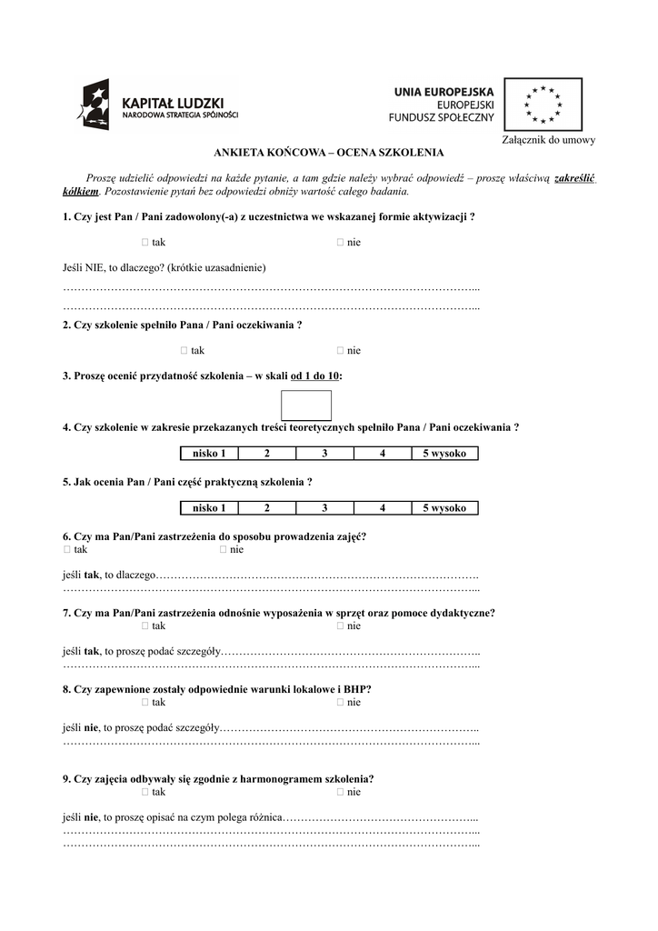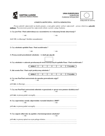 Załącznik do umowy ANKIETA KOŃCOWA – OCENA SZKOLENIA Proszę udzielić odpowiedzi na każde pytanie, a tam gdzie należy wybrać odpowiedź – proszę właściwą zakreślić kółkiem. Pozostawienie pytań bez odpowiedzi obniży wartość całego badania. 1. Czy jest Pan / Pani zadowolony(-a) z uczestnictwa we wskazanej formie aktywizacji ? tak nie Jeśli NIE, to dlaczego? (krótkie uzasadnienie) …………………………………………………………………………………………………... …………………………………………………………………………………………………... 2. Czy szkolenie spełniło Pana / Pani oczekiwania ? tak nie 3. Proszę ocenić przydatność szkolenia – w skali od 1 do 10: 4. Czy szkolenie w zakresie przekazanych treści teoretycznych spełniło Pana / Pani oczekiwania ? nisko 1 2 3 4 5 wysoko 3 4 5 wysoko 5. Jak ocenia Pan / Pani część praktyczną szkolenia ? nisko 1 2 6. Czy ma Pan/Pani zastrzeżenia do sposobu prowadzenia zajęć? tak nie jeśli tak, to dlaczego……………………………………………………………………………. …………………………………………………………………………………………………... 7. Czy ma Pan/Pani zastrzeżenia odnośnie wyposażenia w sprzęt oraz pomoce dydaktyczne? tak nie jeśli tak, to proszę podać szczegóły…………………………………………………………….. …………………………………………………………………………………………………... 8. Czy zapewnione zostały odpowiednie warunki lokalowe i BHP? tak nie jeśli nie, to proszę podać szczegóły…………………………………………………………….. …………………………………………………………………………………………………... 9. Czy zajęcia odbywały się zgodnie z harmonogramem szkolenia? tak nie jeśli nie, to proszę opisać na czym polega różnica……………………………………………... …………………………………………………………………………………………………... …………………………………………………………………………………………………... 10. Po ukończeniu udziału w szkoleniu proszę określić, w jakim stopniu ocenia Pan / Pani : • poziom swoich kwalifikacji zawodowych w stosunku do oczekiwań rynku pracy ? nisko 1 • 3 4 5 wysoko 3 4 5 wysoko 3 4 5 wysoko swoje przygotowanie do powrotu / wejścia na rynek pracy ? nisko 1 • 2 2 umiejętności radzenia sobie z poszukiwaniem pracy ? nisko 1 2 11. Inne uwagi dotyczące szkolenia: ……………………………………………………………………………………………………………………………… ……………………………………………………………………………………………………………………………… ……………………………………………………………………………………………………………………………… ……………………………………………………………………………………………………………………………… ……………………………………………………………………………………………………………………………… …………………………………………………………………………………………………………………………… ……………………………………………………………………………………………………………………………… ……………………………………………………………………………………………………………………………… ……………………………………………………………………… Katowice, ................................................... data wypełnienia ankiety