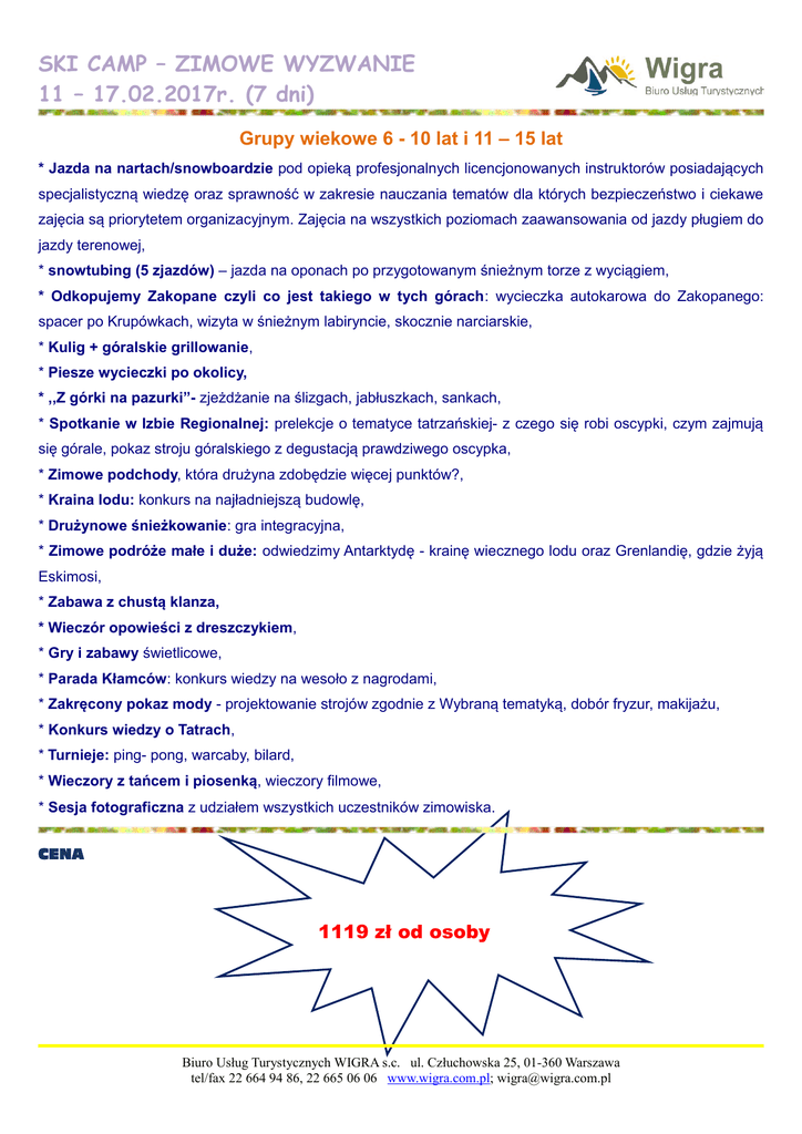 SKI CAMP – ZIMOWE WYZWANIE 11 – 17.02.2017r. (7 dni) Grupy wiekowe 6 - 10 lat i 11 – 15 lat * Jazda na nartach/snowboardzie pod opieką profesjonalnych licencjonowanych instruktorów posiadających specjalistyczną wiedzę oraz sprawność w zakresie nauczania tematów dla których bezpieczeństwo i ciekawe zajęcia są priorytetem organizacyjnym. Zajęcia na wszystkich poziomach zaawansowania od jazdy pługiem do jazdy terenowej, * snowtubing (5 zjazdów) – jazda na oponach po przygotowanym śnieżnym torze z wyciągiem, * Odkopujemy Zakopane czyli co jest takiego w tych górach: wycieczka autokarowa do Zakopanego: spacer po Krupówkach, wizyta w śnieżnym labiryncie, skocznie narciarskie, * Kulig + góralskie grillowanie, * Piesze wycieczki po okolicy, * ,,Z górki na pazurki”- zjeżdżanie na ślizgach, jabłuszkach, sankach, * Spotkanie w Izbie Regionalnej: prelekcje o tematyce tatrzańskiej- z czego się robi oscypki, czym zajmują się górale, pokaz stroju góralskiego z degustacją prawdziwego oscypka, * Zimowe podchody, która drużyna zdobędzie więcej punktów?, * Kraina lodu: konkurs na najładniejszą budowlę, * Drużynowe śnieżkowanie: gra integracyjna, * Zimowe podróże małe i duże: odwiedzimy Antarktydę - krainę wiecznego lodu oraz Grenlandię, gdzie żyją Eskimosi, * Zabawa z chustą klanza, * Wieczór opowieści z dreszczykiem, * Gry i zabawy świetlicowe, * Parada Kłamców: konkurs wiedzy na wesoło z nagrodami, * Zakręcony pokaz mody - projektowanie strojów zgodnie z Wybraną tematyką, dobór fryzur, makijażu, * Konkurs wiedzy o Tatrach, * Turnieje: ping- pong, warcaby, bilard, * Wieczory z tańcem i piosenką, wieczory filmowe, * Sesja fotograficzna z udziałem wszystkich uczestników zimowiska. CENA 1119 zł od osoby Biuro Usług Turystycznych WIGRA s.c. ul. Człuchowska 25, 01-360 Warszawa tel/fax 22 664 94 86, 22 665 06 06 www.wigra.com.pl; [email protected] SKI CAMP – ZIMOWE WYZWANIE 11 – 17.02.2017r. (7 dni) CENA ZAWIERA: transport autokarem/PKP, zakwaterowanie w ośrodku wypoczynkowym U Tośki w Murzasichle w pokojach 3-5 os. z łazienkami i TV, wyżywienie 4 posiłki dziennie (śniadania i kolacje szwedzki stół, obiad + podwieczorek), realizację programu wg opisu, opiekę pedagogiczną, medyczną, instruktorską, ubezpieczenie NNW, podatek VAT. CENA NIE ZAWIERA: wypożyczenie sprzętu cały okres pobytu, narty ok.180 zł (narty, buty, kijki, kask), snowboard ok. 240 zł, karnety ok. 30-50 zł/dzień Biuro Usług Turystycznych WIGRA s.c. ul. Człuchowska 25, 01-360 Warszawa tel/fax 22 664 94 86, 22 665 06 06 www.wigra.com.pl; [email protected]