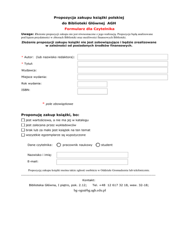 Propozycja zakupu książki polskiej do Biblioteki Głównej AGH Formularz dla Czytelnika Uwaga: Złożenie propozycji zakupu nie jest równoznaczne z jego realizacją. Propozycje będą analizowane pod kątem przydatności w zbiorach Biblioteki oraz możliwości finansowych Biblioteki. Złożenie propozycji zakupu książki nie jest zobowiązujące i będzie zrealizowane w zależności od posiadanych środków finansowych. * Autor: (lub nazwisko redaktora): * Tytuł: Wydawca: Miejsce wydania: Rok wydania: ISBN: * pole obowiązkowe Proponuję zakup książki, bo: jest wartościowa, a nie ma jej w katalogu jest zalecana przez wykładowców brak lub za mało jest książek na ten temat wszystkie egzemplarze są wypożyczone Dane czytelnika: pracownik naukowy student Nazwisko i imię: E-mail: Propozycję zakupu książki można także zgłosić osobiście w Oddziale Gromadzenia lub telefonicznie. --------------------------------------------------------------------------------------------------Kontakt: Biblioteka Główna, I piętro, pok. 2.12; Tel. +48 12 617 32 18, wew. 32-18; [email protected] [email protected]