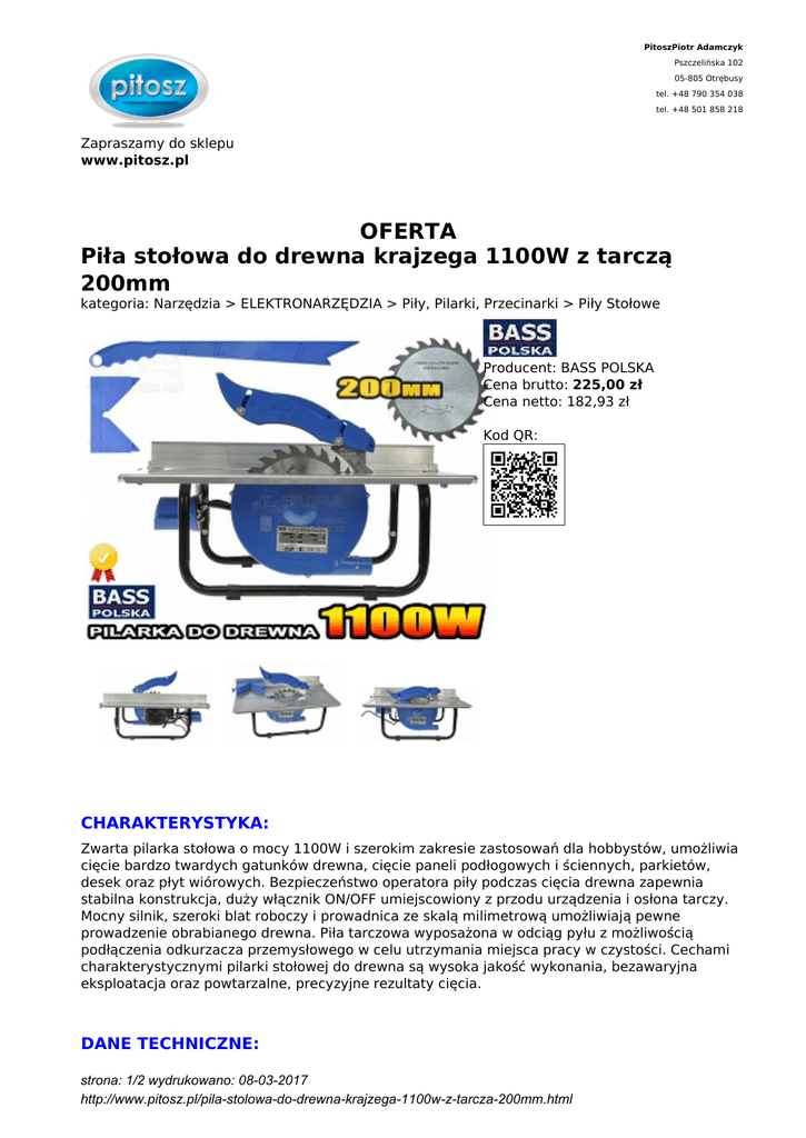PitoszPiotr Adamczyk Pszczelińska 102 05-805 Otrębusy tel. +48 790 354 038 tel. +48 501 858 218 Zapraszamy do sklepu www.pitosz.pl OFERTA Piła stołowa do drewna krajzega 1100W z tarczą 200mm kategoria: Narzędzia > ELEKTRONARZĘDZIA > Piły, Pilarki, Przecinarki > Piły Stołowe Producent: BASS POLSKA Cena brutto: 225,00 zł Cena netto: 182,93 zł Kod QR: CHARAKTERYSTYKA: Zwarta pilarka stołowa o mocy 1100W i szerokim zakresie zastosowań dla hobbystów, umożliwia cięcie bardzo twardych gatunków drewna, cięcie paneli podłogowych i ściennych, parkietów, desek oraz płyt wiórowych. Bezpieczeństwo operatora piły podczas cięcia drewna zapewnia stabilna konstrukcja, duży włącznik ON/OFF umiejscowiony z przodu urządzenia i osłona tarczy. Mocny silnik, szeroki blat roboczy i prowadnica ze skalą milimetrową umożliwiają pewne prowadzenie obrabianego drewna. Piła tarczowa wyposażona w odciąg pyłu z możliwością podłączenia odkurzacza przemysłowego w celu utrzymania miejsca pracy w czystości. Cechami charakterystycznymi pilarki stołowej do drewna są wysoka jakość wykonania, bezawaryjna eksploatacja oraz powtarzalne, precyzyjne rezultaty cięcia. DANE TECHNICZNE: strona: 1/2 wydrukowano: 08-03-2017 http://www.pitosz.pl/pila-stolowa-do-drewna-krajzega-1100w-z-tarcza-200mm.html - Napięcie znamionowe: 230V / 50 Hz Moc: 1100 W Klasa ochrony: IP20 Liczba obrotów biegu jałowego: 2950 /min Rozmiar stołu: 50 x 33,5 cm Średnica tarczy standardowej: 200x16x2,4 mm Maksymalna głębokość cięcia: 45 mm WYPOSAŻENIE PODSTAWOWE: Piła stołowa krajzega do drewna Tarcza do cięcia drewna 200mm Osłona na tarczę Klucze do obsługi Popychadło Element umożliwiający cięcie w karo strona: 2/2 wydrukowano: 08-03-2017 http://www.pitosz.pl/pila-stolowa-do-drewna-krajzega-1100w-z-tarcza-200mm.html