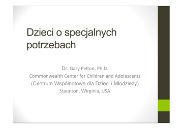 Dzieci o specjalnych potrzebach Dr. Gary Pelton, Ph.D. Commonwealth Center for Children and Adolescents (Centrum Wspólnotowe dla Dzieci i Młodzieży) Staunton, Wirginia, USA Centrum Wspólnotowe dla Dzieci i Młodzieży Specjalne potrzeby Specjalne potrzeby Historia Montessori: •1899 Klinika Ortofreniczna •1906 San Lorenzo, Rzym, Włochy Ortofrenia = pedagogika lecznicza zajmująca się korygowaniem psychicznych odchyleń od normy „Zwykły nauczyciel nie może tak po prostu stać się nauczycielem metody Montessori. Wpierw musi uwolnić się od pedagogicznych uprzedzeń, stworzyć się na nowo. Musi wyćwiczyć wyobraźnię; wyobrazić sobie dziecko, którego nie ma, i wierzyć w dziecko, które objawi się w trakcie pracy. Taki nauczyciel, patrząc na dzieci borykające się z uchybieniami, będzie umiał dojrzeć ich duchowe ja. Będzie czekał, aż dziecko trafi na coś, co je zainteresuje, i obserwował zachodzący w nim rozwój." 'Education for a New World', Clio Press Ltd, 67) – (Tłum. Własne) Specjalne potrzeby • Niepełnosprawność intelektualna • Spektrum Autyzmu • Trudności w uczeniu się • ADD • Problemy emocjonalne NIEDOROZWÓJ NIEPEŁNOSPRAWNOŚĆ INTELKTUALNA Niepełnosprawność intelektualna Odczuwalne ograniczenia… 1.Zdolności intelektualnych 2.Zdolności adaptacyjnych. Niepełnosprawność intelektualna 1. Zdolności intelektualne a. Ogólne zdolności umysłowe, w tym rozumienie związków przyczynowo-skutkowych, planowanie, rozwiązywanie problemów, abstrakcyjne myślenie, rozumienie złożonych zagadnień, szybkie uczenie się, wyciąganie wniosków z doświadczeń b. Zdolności wielo-wymiarowe: werbalne, niewerbalne (wizualno-manipulacyjne), pamięciowe, percepcyjne Niepełnosprawność intelektualna 2. Zdolności adaptacyjne a. Zdolności koncepcyjne używane w życiu codziennym (czytanie, pisanie, posługiwanie się pieniędzmi i liczbami). b. Zdolności społeczne używane z życiu codziennym (interpersonalne, przestrzeganie reguł, unikanie represjonowania, rozwiązywanie problemów o podłożu socjalnym). c. Zdolności praktyczne używane w życiu codziennym (dbanie o siebie, używanie telefonu, koncentracja na jednej rzeczy, przestrzeganie zasad bezpieczeństwa). Zdolności intelektualne i adaptacyjne Lekkie 55-70 Umiarkowane 40-55 Ciężkie 25-40 Bardzo głębokie < 25 bardzo źle dół normy na skraju normy norma góra normy ponad normę bardzo ponad normę Absolutnie Unikalni Totalnie Interesujący Sporadycznie Mistyczni Spektrum autyzmu Odczuwalne upośledzenie w zakresie… 1.Komunikacji i interakcji społecznej 2.Utartych wzorców zachowań, zainteresowań i/lub aktywności Intensywność objawów może być bardzo zróżnicowana, dlatego mówimy tu o spektrum lub kontinuum autyzmu. 1.Poziom wsparcia wymagany do efektywnej adaptacji Spektrum autyzmu 1. Społeczna komunikacja i interakcja a. Zaburzenia komunikacyjne, począwszy od całkowitego braku mowy, przez problemy z przetwarzaniem informacji, do przesadnie rzeczowego sposobu wysławiania się. Może wystąpić powtarzanie zasłyszanych kwestii, nietypowa intonacja czy stylistyka. Dziecko z pozoru znające swój język może nie być w stanie prowadzić normalnej rozmowy. Spektrum autyzmu 2. Utarte wzorce zachowań, stałe zainteresowania i zajęcia a. Objawy od typowych tików ruchowych do posługiwania się konkretnym przedmiotem do powatzralnej mowy, przesadne przestrzeganie rutyny, nadwrazliwośc na bodźce czuciowe (nieproporcjonalna reakcja na dźwięki, teksturę, zapachy, światło, ciepło, zimno i ból). Trudności w uczeniu się Trudności w uczeniu się Zauważalne trudności lub wyniki poniżej normy w jednej lub kilku z poniższych dziedzin: • Czytanie na głos (dysleksja) i/lub czytanie ze zrozumieniem • Literowanie • Wyrażanie się na piśmie (dysgrafia) • Rozumienie pojęć matematycznych (dyskalkulia) Trudności w uczeniu się • Trudności w uczeniu się nie wynikają z niskiego IQ, zaburzeń sensorycznych, problemów psychosocjalnych i niedostatecznych instrukcji. • Trudności w uczeniu się wynikają z konkretnych zaburzeń kognitywnych, np. przetwarzania bodźców słuchowych czy wizualnych. ADD – zespół zaburzeń uwagi ADD – zespół zaburzeń uwagi Uporczywe problemy z koncentracją i/lub nadpobudliwość, które uniemożliwiają dziecku prawidłowy rozwój; Typowe objawy: • Zaburzenia koncentracji • • • • • • • • Omijanie szczegółów, niedokładność w pracy Trudność w utrzymaniu skupienia podczas nauki i zabawy Brak reakcji na komunikaty słowne Trudność w organizowaniu zajęć Unikanie zadań wymagających skupienia Częste gubienie przedmiotów Łatwe rozpraszanie Krótka pamięć na co dzień ADD – zespół zaburzeń uwagi • Nadpobudliwość • Wiercenie się i stukanie palcami lub stopami podczas spokojnego zajęcia • Nagłe wycofanie się z sytuacji lub porzucenie zadania • Bieganie i wspinanie się, gdy nie jest to wskazane • Niemożność cichego uczestnictwa w rekreacji • Często słowotok • Wcinanie się w cudze rozmowy, przerywanie nauczycielowi, wyrywanie się do mówienia • Trudności w dzieleniu się i czekaniu na swoją kolej • Często przeszkadzanie innym ADD – zespół zaburzeń uwagi • Rozkojarzenie/nieuwaga, i/lub nadpobudliwość nie idą w parze z prawidłowym rozwojem; mają negatywny wpływ na rozwój społeczny i intelektualny • Problemy muszą się utrzymywać przez przynajmniej 6 miesięcy i pojawić się przed 12 rokiem życia. Problemy emocjonalne Problemy emocjonalne • Terminem tym określa się wszystkie problemy natury emocjonalnej lub behawioralnej które zaburzają rozwój dziecka i przeszkadzają mu w nauce • Cechy możliwe do zaobserwowania: • • • • • • Agresja, celowe samo-okaleczanie się Dziwne zachowanie Wycofanie, przygnębienie, rozdrażnienie Emocjonalne reakcje (np., płacz, histeria, bojaźliwość) Zachowania kompulsywne 