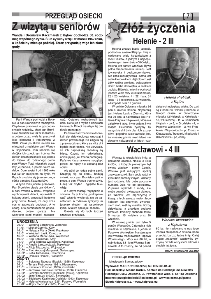 PRZEGLĄD OSIECKI Z wizytą u seniorów Wanda i Bronisław Kaczmarek z Kątów obchodzą 50. rocznicę wspólnego życia. Ślub cywilny wzięli w marcu 1962 roku, a kościelny miesiąc później. Teraz przypadają więc ich złote gody. Pani Wanda pochodzi z Bojanic, a pan Bronisław z Maciejewa. Obydwoje pracowali w gospodarstwach rodziców, choć pan Bronisław zatrudnił się też w melioracji, a potem przez wiele lat pracował jako kierowca i traktorzysta w SKR. Zaraz po ślubie młodzi zamieszkali u rodziców pani Wandy w Bojanicach. Tam urodziła się dwójka ich dzieci, syn i córka. Po dwóch latach przenieśli się jednak do Kątów, do rodzinnego domu pani Wandy. Tutaj mieszkała przed laty jej babcia, a potem także rodzice. Dom został i od 1965 roku był już ich miejscem na życie. W Kątach urodziła się jeszcze druga córka państwa Kaczmarków. A życie mieli jubilaci pracowite. Pan Bronisław ciągle „za kółkiem”, a pani Wanda w domu. Wspólnie wychowywali dzieci, uprawiali 2 hektary ziemi, prowadzili hodowlę przy domu. Mówią, że cały czas coś w zagrodzie budowali. A to oborę, a to pomieszczenie gospodarcze, potem garaże. Na wszystko sami musieli zapraco- URODZENIA wać. Ostatnio rozbudowali też dom, ale to już z myślą o dzieciach i wnukach. Dzieci zresztą w tej budowie pomagały. Państwo Kaczmarkowie doczekali się dziewięciorga wnucząt i dwóch prawnucząt. Na zdjęciu są z prawnuczkiem, który za kilka dni będzie miał roczek. Nie ukrywają, że ich największą radością są bliscy. Często ich odwiedzają, opiekują się, jak trzeba pomagają. Państwo Kaczmarkowie mogą być pewni, że nigdy nie zostaną bez opieki. Ale póki co radzą sobie sami. Krzątają się po domu, hodują świnki, kury, pan Bronisław pali w piecu, a pani Wanda trochę szyje. Lubią też czytać i oglądać telewizję. A o czym marzą? Wyłącznie o zdrowiu. By je trochę „podreperować” właśnie wybierają się do sanatorium. A rodzinka życzymy im jeszcze długich lat wspólnego życia. A także spokoju i radości. Gazeta się do tych życzeń szczerze przyłącza. 09. 01. – Wiktoria Bardzińska, Ziemnice 11. 01. – Michał Gorynia, Kąty 14. 01. – Natasza Maria Okręt, Frankowo 15. 01. – Wojciech Lasik, Osieczna 16. 01. – Wiktoria Maria Cyka, Wojnowice 19. 01. – Filip Sobkowiak, Kąty 21. 01. – Lena Barbara Wojszczyk, Kąkolewo 23. 01. – Amelia Landzwojczak, Kąkolewo 24. 01. – Alicja Niezgódka, Wojnowice 01. 02. – Piotr Andrzej Marszałek, Świerczyna 08. 02. – Zofia Turbańska, Świerczyna 08. 02. – Dominik Homski, Frankowo ZGONY 19. 01. – Bolesław Tadeusz Glapiak (1925), Kąkolewo 26. 01. – Teresa Piotrowska (1931), Kleszczewo 27. 01. – Kazimierz Kraśner (1935), Grodzisko 04. 02. – Jarosław Stanisław Skrobała (1966), Osieczna 05. 02. – Leszek Stanisław Chudziński (1947), Kąkolewo 06. 02. – Józef Krauze (1922), Świerczyna 09. 02. – Zdzisława Kazimiera Dudziak (1943), Kąkolewo 10. 02. – Helena Krajewska (1926), Popowo Wonieskie 11. 02. – Alojzy Pieprzyk (1963), Osieczna [7] ZłóŜ Ŝyczenia Helenie - 2 III Helena znaczy blask, jasność, pochodnia, a nawet Księżyc. Imię to nadawano wielu księżniczkom z rodu Piastów, a jednym z najpopularniejszych imion było w XIX wieku. Helena jest bardzo wrażliwa. Bywa pełna temperamentu i intuicji. Jest towarzyska i bezkompromisowa. Nie znosi rozkazywania i sama jest sobie kierownikiem. Jej kolorem jest żółty, rośliną orchidea, zwierzęciem dorsz, liczbą dziewiątka, a znakiem zodiaku Bliźnięta. Imieniny obchodzi jeszcze wiele razy w roku: 2 marca, 23 i 26 kwietnia, 4 i 22 maja, 31 lipca, 13 i 18 sierpnia, 23 września, 4 listopada oraz 19 grudnia. W gminie Osieczna mieszka 66 pań o imieniu Helena. Najstarszą jest Helena Lasik z Ziemnic, która ma 93 lata, a najmłodszą jest Helenka Przytuła z Kąkolewa, która ma zaledwie 4 latka. I tym dużym, i tym małym Helenkom życzymy by wszystkie dni były dla nich szczęśliwe i pogodne. A ciekawostką jest, że w naszej gminie imię Helena nadawano najczęściej w latach trzy- Helena Pietrzak z Kątów dziestych ubiegłego wieku. Do dziś są z nami 23 Helenki urodzone w tamtym czasie. W Świerczynie mieszka 12 Helenek, w Kąkolewie 18, w Osiecznej - 11, w Ziemnicach i Kątach - po 5, w Grodzisku - 4, w Popowie Wonieskim - 3, we Frankowie i Wojnowicach - po 2 oraz w Kleszczewie, Trzebani, Miąskowie i Drzeczkowie - po jednej. Wacławowi - 4 III Wacław to słowiańskie imię, a dokładnie czeskie. Nosiło je kilku królów, z których pierwszym był święty Wacław - patron Czech. Wacław jest miłującym spokój znawcą muzyki. Sam sobie radzi w życiu bez pomocy innych. Oddany jest rodzinie. Ma duże poczucie humoru. Dziś nie jest popularny. Zupełnie wyszedł z mody, ale może powróci, zwłaszcza dlatego, że Wacław jest mężczyzną z klasą, a tych zawsze mało. Jego kolorem jest czerwień, zwierzęciem słoń, rośliną wierzba, liczbą dziewiątka, a znakiem zodiaku Strzelec. Imieniny obchodzi także 5 marca, 15 kwietnia oraz 28 września. W naszej gminie jest tylko 5 panów Wacławów. Czterech z nich mieszka w Kąkolewie, a jeden w Popowie Wonieskim. Najstarszym jest Wacław Maćkowiak z Popowa Wonieskiego, który ma 86 lat, a najmłodszy 63 - letni Wacław Bartkowiak. A to znaczy, że od ponad PRZEGLĄD OSIECKI Miesięcznik Samorządowy Wacław Iwanowicz z Kąkolewa 60 lat nie nadawano u nas tego imienia chłopcom. A szkoda, bo to przecież bardzo ładne imię. Całej piątce „naszych” Wacławów życzymy przede wszystkim zdrowia i długich lat życia. DRUK: TRANSMAR LESZNO Wydawca: M-GOK w Osiecznej, tel. 065 535-01-40 Red. naczelny: Aldona Korbik. Kontakt do Redakcji: 065 5350 016 Redakcja: UMiG Osieczna, ul. Powstańców Wlkp. 6, 64-113 Osieczna Internet: [email protected] www.osieczna.pl/gazeta Skład: Halpress s.c. - www.halpress.eu