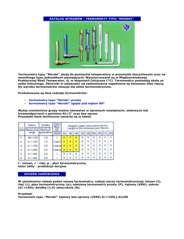 KATALOG WYROBÓW - TERMOMERTY TYPU "MORSKI" Termometry typu "Morski" służą do pomiarów temperatury w przemyśle stoczniowym oraz na wszelkiego typu jednostkach pływających. Wywzorcowane są w Międzynarodowej Praktycznej Skali Temperatur, tj. w stopniach Celcjusza (°C). Termometry posiadają skalę ze szkła mlecznego. Zbiorniki w zależności od zastosowania napełnione są toluenem albo rtęcią. Do wyrobu termometrów stosuje się szkło termometryczne. Produkowane są dwa rodzaje termometrów: • • termometry typu "Morski" proste termometry typu "Morski" zgięte pod kątem 90° Wyżej wymienione grupy można zamawiać w oprawach mosiężnych, stalowych lub kwasoodpornych z gwintem R1/2" oraz bez opraw. Pozostałe dane techniczne zawarte są w tabeli. t - toluen, r - rtęć, p - płyn termometryczny, kolor żółty - produkcja seryjna. SPOSÓB ZAMÓWIENIA W zamówieniu należy podać nazwę termometru, rodzaj cieczy termometrycznej: toluen (t), rtęć (r), płyn termometryczny (p); odmianę termometru prosty (P), kątowy (K90); zakres (0/+150); działkę (1,0) zanurzenie (R). Przykład: Termometr typu "Morski" kątowy bez oprawy r(K90) 0/+150(1,0)100