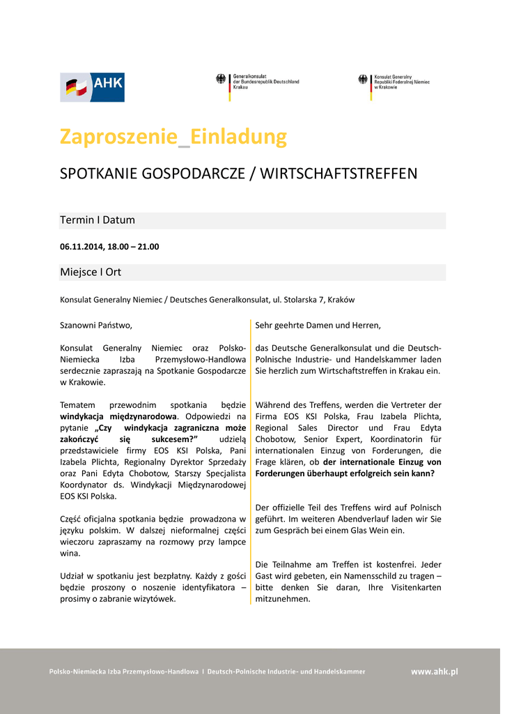 Zaproszenie_Einladung SPOTKANIE GOSPODARCZE / WIRTSCHAFTSTREFFEN Termin I Datum 06.11.2014, 18.00 – 21.00 Miejsce I Ort Konsulat Generalny Niemiec / Deutsches Generalkonsulat, ul. Stolarska 7, Kraków Szanowni Państwo, Sehr geehrte Damen und Herren, Konsulat Generalny Niemiec oraz Polsko- das Deutsche Generalkonsulat und die DeutschNiemiecka Izba Przemysłowo-Handlowa Polnische Industrie- und Handelskammer laden serdecznie zapraszają na Spotkanie Gospodarcze Sie herzlich zum Wirtschaftstreffen in Krakau ein. w Krakowie. Tematem przewodnim spotkania będzie windykacja międzynarodowa. Odpowiedzi na pytanie „Czy windykacja zagraniczna może zakończyć się sukcesem?” udzielą przedstawiciele firmy EOS KSI Polska, Pani Izabela Plichta, Regionalny Dyrektor Sprzedaży oraz Pani Edyta Chobotow, Starszy Specjalista Koordynator ds. Windykacji Międzynarodowej EOS KSI Polska. Während des Treffens, werden die Vertreter der Firma EOS KSI Polska, Frau Izabela Plichta, Regional Sales Director und Frau Edyta Chobotow, Senior Expert, Koordinatorin für internationalen Einzug von Forderungen, die Frage klären, ob der internationale Einzug von Forderungen überhaupt erfolgreich sein kann? Der offizielle Teil des Treffens wird auf Polnisch Część oficjalna spotkania będzie prowadzona w geführt. Im weiteren Abendverlauf laden wir Sie języku polskim. W dalszej nieformalnej części zum Gespräch bei einem Glas Wein ein. wieczoru zapraszamy na rozmowy przy lampce wina. Die Teilnahme am Treffen ist kostenfrei. Jeder Udział w spotkaniu jest bezpłatny. Każdy z gości Gast wird gebeten, ein Namensschild zu tragen – będzie proszony o noszenie identyfikatora – bitte denken Sie daran, Ihre Visitenkarten prosimy o zabranie wizytówek. mitzunehmen. Serdecznie zapraszamy również partnerów do udziału w spotkaniu. Państwa Auch Ihre Geschäftspartner sind uns herzlich willkommen. Zgłoszenia prosimy przesłać na załączonym Bitte bestätigen Sie Ihre Teilnahme bis zum formularzu do dnia 27.10.2014 r. na adres 27.10.2014 durch die Zusendung des [email protected]. beiliegenden Formulars an [email protected]. Dziękujemy / Mit herzlichem Dank an Kontakt AHK Polska / AHK Polen Biuro Regionalne / Regionalbüro Tel. 32 232 15 10 Potwierdzenie udziału_Anmeldung Spotkanie gospodarcze / Wirtschaftstreffen Potwierdzenie udziału prosimy przesłać do dnia 27.10.2014 mailem na adres: Bitte senden Sie Ihre Anmeldung bis zum 27.10.2014 per E-Mail an: [email protected] Imię i Nazwisko / Vor- und Nachname …………………………………………………………………………………………………………………………………………………..…..……… Stanowisko / Position ..………………………………………………………………………………………………………………………………………….………………… Firma / Instytucja / Institution ...…………………………………………………………………….……………………………………………………………………………………… Ulica i numer / Straße, Nummer …………………………………………………………………………………………………………………………………………………………….… Kod i miejscowość / PLZ, Ort ……………………………………………………………………………………………..……………………………………………………….………. Tel. ………………………………………………….….…….… Mail ………….………………….…….…………………………………..…… Data i podpis / Datum und Unterschrift ………………………………………………..…………………..…………………………