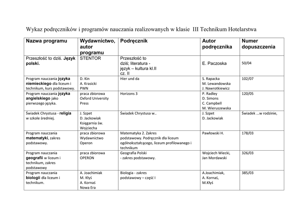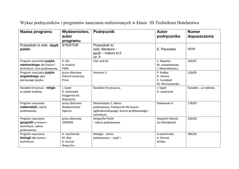 Wykaz podręczników i programów nauczania realizowanych w klasie III Technikum Hotelarstwa Nazwa programu Wydawnictwo, Podręcznik autor programu Przeszłość to dziś. Język polski. STENTOR Program nauczania języka niemieckiego dla liceum i technikum, kurs podstawowy. Program nauczania języka angielskiego jako pierwszego języka. D. Kin A. Krasicki PWN praca zbiorowa Oxford University Press Hier und da Świadek Chrystusa - religia w szkole średniej. J. Szpet D. Jackowiak Księgarnia św. Wojciecha praca zbiorowa Wydawnictwo Operon Świadek Chrystusa w.. Program nauczania matematyki, zakres podstawowy. Program nauczania geografii w liceum i technikum, zakres podstawowy Program nauczania biologii dla liceum i technikum. praca zbiorowa OPERON A. Joachimiak M. Kłyś A. Kornaś Nowa Era Autor podręcznika Numer dopuszczenia E. Paczoska 50/04 S. Rapacka M. Lewandowska J. Nawrotkiewicz P. Radley D. Simons C. Campbell M. Wieruszewska J. Szpet D. Jackowiak 102/07 Matematyka 2. Zakres podstawowy. Podręcznik dla liceum ogólnokształcącego, liceum profilowanego i technikum Geografia Polski - zakres podstawowy. Pawłowski H. 178/03 Wojciech Wiecki, Jan Mordawski 326/03 Biologia - zakres podstawowy – częśd I A.Joachimiak, A. Kornaś, M.Kłyś 385/03 Przeszłość to dziś; literatura język – kultura kl.II cz. II Horizons 3 120/05 Świadek ...w rodzinie, Fizyka i astronomia dla każdego. Program nauczania w zakresie podstawowym. praca zbiorowa ZAMKOR Fizyka dla szkoł ponadgimnazjalnych. M. Fiałkowska K. Fiałkowski Sagnowska 46/02 Poznad przeszłośd, zrozumied dziś. Program nauczania historii w liceum i technikum. Program nauczania chemii dla liceum i technikum, zakres podstawowy. Program nauczania wiedzy o społeczeństwie. Grzegorz Szczepaoski, STENTOR Poznad przeszłośd, zrozumied dziś. Maciej Przybylioski 109/08 praca zbiorowa Operon Chemia 2 71/05 praca zbiorowa Centrum Edukacji Obywatelskie Przewodnik młodego obywatela. S. Hejwowska R. Marcinkowski J. Staluszka praca zbiorowa 372/02 Przedmioty zawodowe Numer Autor podręcznika dopuszczenia Nazwa przedmiotu Podręcznik Ekonomia i prawo w hotelarstwie Podstawy ekonomiczne i prawne w hotelarstwie Wajgner M., Tylińska R. 22/2007 Obsługa konsumenta Obsługa konsumenta w hotelarstwie Duda J, Krzywda S. 27/2007 Obsługa informatyczna w hotelarstwie Internet w turystyce i hotelarstwie. Informatyka w hotelarstwie. PZHiMG Marketing usług w hotelarstwie Marketing w hotelarstwie Język angielski zawodowy "how can I help you?" cz. I Język angielski zawodowy dla zawodu technik hotelarstwa Organizacja pracy w hotelarstwie Organizacja pracy w hotelarstwie M. Nalazek i in. Stefański A. Joanna DolińskaRomanowicz Dorota Nowakowska Małgorzata Tkaczyk Joanna Orłowska 24/2007 131/1/2009 07/2008