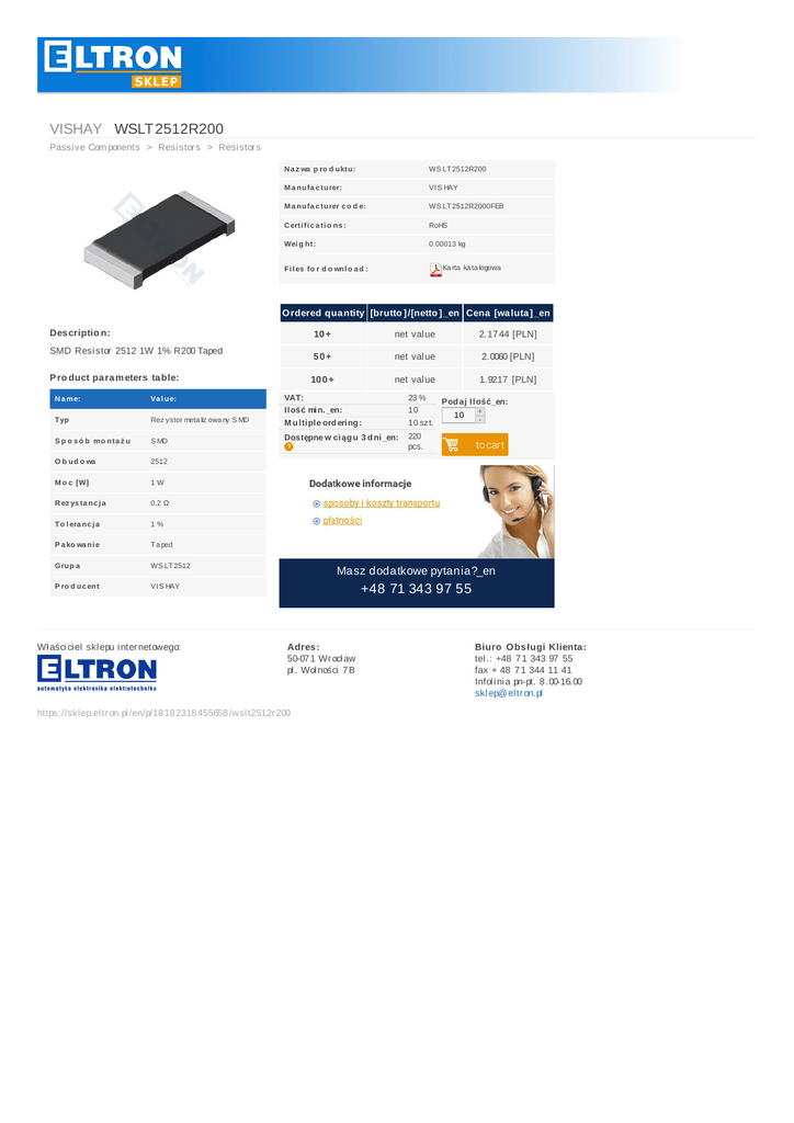 VISHAYWSLT 2512R200 Passi veCom ponents > Resi stor s > Resi stor s N a z wa p ro d u ktu : WS LT 2512R200 M a n u fa c tu rer: VI S HAY M a n u fa c tu rerc o d e: WS LT 2512R2000FEB C erti fi c a ti o n s : RoHS Wei g h t: 0.00013kg Ka rta ka ta logowa F i l es fo rd o wn l o a d : O rderedqua ntity [brutto ] /[netto ] _en Cena [wa luta ] _en Des criptio n: SMDResi stor 25121W1%R200Taped P ro ductpa ra m eters ta ble: 10 + netval ue 2.17 44[PLN] 50+ netval ue 2.0060[PLN] 10 0 + netval ue 1.9217 [PLN] Rez ystormeta liz owa nyS MD VAT: Ilośćmin._en: M u ltipleord ering : 23% Pod ajIlość_en: 10 + 10 10sz t. S p o s ó b m o n ta ż u S MD Dostępnewciąg u 3d ni_en: 220 pcs. O b u d o wa 2512 M o c [W] 1W R ez ys ta n c j a 0.2Ω T o l era n c j a 1% P a ko wa n i e T a ped Gru p a WS LT 2512 P ro d u c en t VI S HAY N a m e: Va l u e: T yp Wł aści ci el skl epui nter netowego: tocart Maszdodatkowepytania?_en +48713439755 Adres : 50-07 1Wr ocł aw pl .Wol ności 7 B https://skl ep.el tr on.pl /en/p/18 18 2318 455658 /wsl t2512r 200 Biuro O bs ługiKlienta : tel .:+48 7 134397 55 fax+48 7 13441141 Infol i ni apn-pt.8 .00-16.00 skl ep@ el tr on.pl