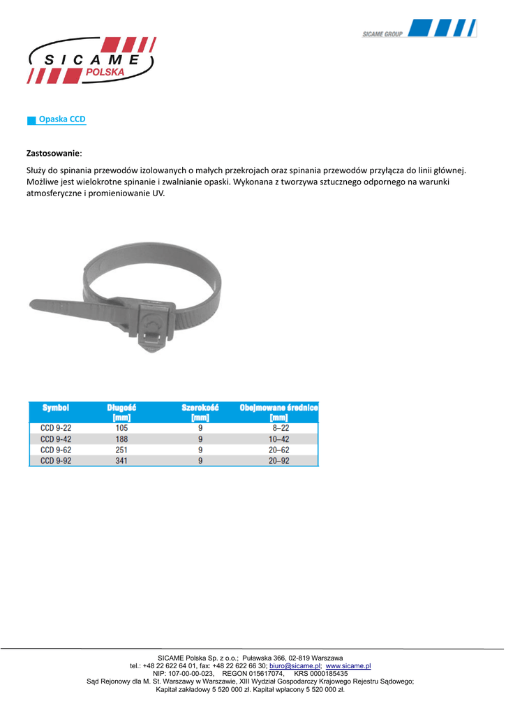 Opaska CCD Zastosowanie: Służy do spinania przewodów izolowanych o małych przekrojach oraz spinania przewodów przyłącza do linii głównej. Możliwe jest wielokrotne spinanie i zwalnianie opaski. Wykonana z tworzywa sztucznego odpornego na warunki atmosferyczne i promieniowanie UV. SICAME Polska Sp. z o.o.; Puławska 366, 02-819 Warszawa tel.: +48 22 622 64 01, fax: +48 22 622 66 30; [email protected]; www.sicame.pl NIP: 107-00-00-023, REGON 015617074, KRS 0000185435 Sąd Rejonowy dla M. St. Warszawy w Warszawie, XIII Wydział Gospodarczy Krajowego Rejestru Sądowego; Kapitał zakładowy 5 520 000 zł. Kapitał wpłacony 5 520 000 zł.