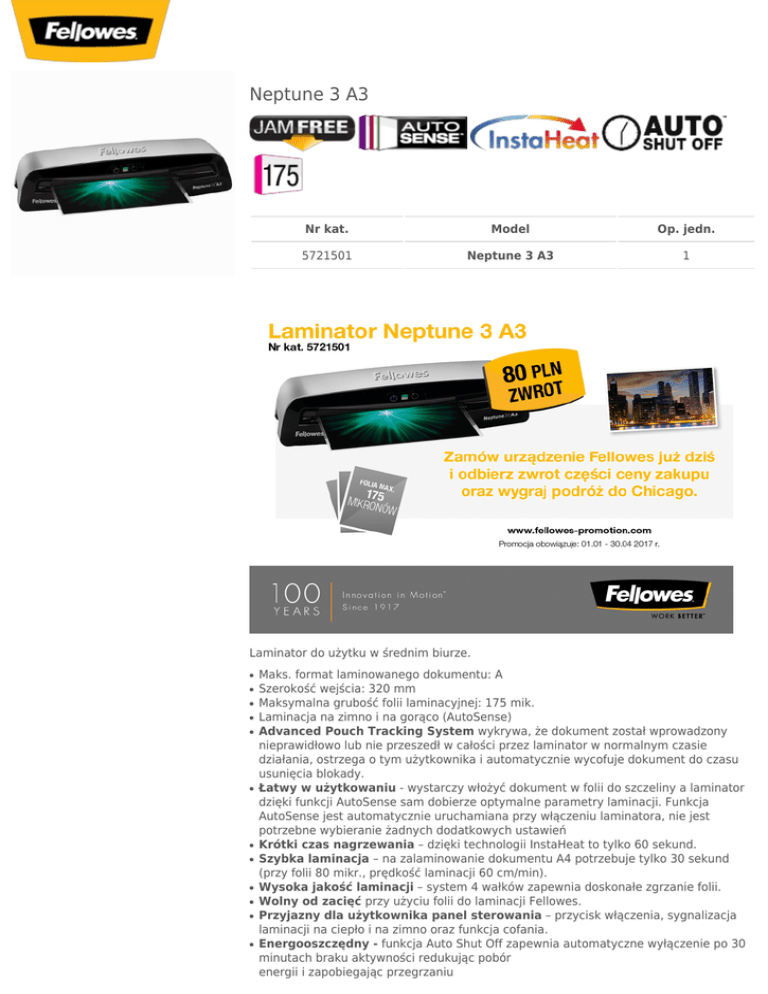 Neptune 3 A3 Nr kat. Model Op. jedn. 5721501 Neptune 3 A3 1 Laminator do użytku w średnim biurze. ● ● ● ● ● ● ● ● ● ● ● ● Maks. format laminowanego dokumentu: A Szerokość wejścia: 320 mm Maksymalna grubość folii laminacyjnej: 175 mik. Laminacja na zimno i na gorąco (AutoSense) Advanced Pouch Tracking System wykrywa, że dokument został wprowadzony nieprawidłowo lub nie przeszedł w całości przez laminator w normalnym czasie działania, ostrzega o tym użytkownika i automatycznie wycofuje dokument do czasu usunięcia blokady. Łatwy w użytkowaniu - wystarczy włożyć dokument w folii do szczeliny a laminator dzięki funkcji AutoSense sam dobierze optymalne parametry laminacji. Funkcja AutoSense jest automatycznie uruchamiana przy włączeniu laminatora, nie jest potrzebne wybieranie żadnych dodatkowych ustawień Krótki czas nagrzewania – dzięki technologii InstaHeat to tylko 60 sekund. Szybka laminacja – na zalaminowanie dokumentu A4 potrzebuje tylko 30 sekund (przy folii 80 mikr., prędkość laminacji 60 cm/min). Wysoka jakość laminacji – system 4 wałków zapewnia doskonałe zgrzanie folii. Wolny od zacięć przy użyciu folii do laminacji Fellowes. Przyjazny dla użytkownika panel sterowania – przycisk włączenia, sygnalizacja laminacji na ciepło i na zimno oraz funkcja cofania. Energooszczędny - funkcja Auto Shut Off zapewnia automatyczne wyłączenie po 30 minutach braku aktywności redukując pobór energii i zapobiegając przegrzaniu ● ● Pakiet startowy 10 szt. folii A4 80 mik. w zestawie 2 lata gwarancji na urządzenie. Parametry techniczne: Maks. format dokumentu A3 Szerokość wejścia 320 Grubość folii w mikronach 80-175 Liczba rolek 4 Czas nagrzewania w minutach 60s Ustawienie temperatury (ilość) Autosense Prędkość laminacji w cm na min 60 Maks. grubość laminowanego dokumentu w mm 0,6 Możliwość laminacji zdjęć Laminacja bez carriera Funkcja cofania Autosense Instaheat Auto Shut Off Jam Free Sygnał gotowości dioda + sygnał dźwiękowy Laminacja na zimno Uchwyty ułatwiające przenoszenie Wymiary urządzenia w mm 122 x 508 x 140 Waga w kg 4,6 Nr kat. 5721501 Mechanizm grzejny Quartz System Rozmiar A3 Maksymalna grubość folii w mikronach 175 Technologia zapobiegająca zacięciom Funkcja cofania, Jam Free Szybkie nagrzewanie Technologia Instaheat Automatyczny dobór parametrów Technologia Autosense Energooszczędność Technologia Auto Shut Off
