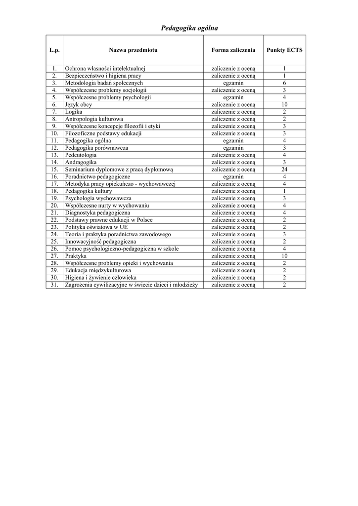 Pedagogika ogólna L.p. Nazwa przedmiotu Forma zaliczenia Punkty ECTS 1. 2. 3. 4. 5. 6. 7. 8. 9. 10. 11. 12. 13. 14. 15. 16. 17. 18. 19. 20. 21. 22. 23. 24. 25. 26. 27. 28. 29. 30. 31. Ochrona własności intelektualnej Bezpieczeństwo i higiena pracy Metodologia badań społecznych Współczesne problemy socjologii Współczesne problemy psychologii Język obcy Logika Antropologia kulturowa Współczesne koncepcje filozofii i etyki Filozoficzne podstawy edukacji Pedagogika ogólna Pedagogika porównawcza Pedeutologia Andragogika Seminarium dyplomowe z pracą dyplomową Poradnictwo pedagogiczne Metodyka pracy opiekuńczo - wychowawczej Pedagogika kultury Psychologia wychowawcza Współczesne nurty w wychowaniu Diagnostyka pedagogiczna Podstawy prawne edukacji w Polsce Polityka oświatowa w UE Teoria i praktyka poradnictwa zawodowego Innowacyjność pedagogiczna Pomoc psychologiczno-pedagogiczna w szkole Praktyka Współczesne problemy opieki i wychowania Edukacja międzykulturowa Higiena i żywienie człowieka Zagrożenia cywilizacyjne w świecie dzieci i młodzieży zaliczenie z oceną zaliczenie z oceną egzamin zaliczenie z oceną egzamin zaliczenie z oceną zaliczenie z oceną zaliczenie z oceną zaliczenie z oceną zaliczenie z oceną egzamin egzamin zaliczenie z oceną zaliczenie z oceną zaliczenie z oceną egzamin zaliczenie z oceną zaliczenie z oceną zaliczenie z oceną zaliczenie z oceną zaliczenie z oceną zaliczenie z oceną zaliczenie z oceną zaliczenie z oceną zaliczenie z oceną zaliczenie z oceną zaliczenie z oceną zaliczenie z oceną zaliczenie z oceną zaliczenie z oceną zaliczenie z oceną 1 1 6 3 4 10 2 2 3 3 4 3 4 3 24 4 4 1 3 4 4 2 2 3 2 4 10 2 2 2 2