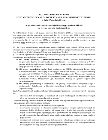 ROZPORZĄDZENIE nr 1/2016 POWIATOWEGO LEKARZA WETERYNARII W KAZIMIERZY WIELKIEJ z dnia 27 grudnia 2016 r. w sprawie zwalczania wysoce zjadliwej grypy ptaków (HPAI) na terenie powiatu kazimierskiego Na podstawie art. 45 ust. 1, ust. 2, ust. 3 ustawy z dnia 11 marca 2004 r. o ochronie zdrowia zwierząt oraz zwalczaniu chorób zakaźnych zwierząt (t.j. Dz. U. z 2014 r. poz. 1539, z późn. zm.1) oraz rozporządzenia Ministra Rolnictwa i Rozwoju Wsi z dnia 18 grudnia 2007 r. w sprawie zwalczania grypy ptaków (Dz. U. Nr 239, poz. 1752) w związku ze stwierdzeniem ogniska choroby – wysoce zjadliwej grypy ptaków (HPAI) zarządza się, co następuje: §1. Za obszar zapowietrzony wystąpieniem wysoce zjadliwej grypy ptaków (HPAI), zwany dalej obszarem zapowietrzonym, uznaje się teren miejscowości: Bolowiec (gm. Skalbmierz), Gunów-Kolonia (gm. Kazimierza Wielka), Gunów-Wilków (gm. Kazimierza Wielka). § 2. Za obszar zagrożony wystąpieniem wysoce zjadliwej grypy ptaków (HPAI), zwany dalej obszarem zagrożonym, uznaje się teren ograniczony: 1) Od strony północnej i północno-wschodniej: granicą powiatu kazimierskiego, w miejscowości Szarbia Zwierzyniecka (gm. Skalbmierz) – do drogi powiatowej nr 0498T, granice administracyjne miasta Skalbmierz, dalej na północnym-wschodzie rzeka Nidzica do drogi powiatowej nr 0529T. 2) Od strony wschodniej: wzdłuż drogi powiatowej nr 0518T, miejscowość Donosy (gm. Kazimierza Wielka), Chruszczyny Wielkiej (gm. Kazimierza Wielka), do skrzyżowania dróg powiatowych 0530T i 0534T, dalej droga nr 0534T do miejscowości Wielgus (gm. Kazimierza Wielka) i wzdłuż drogi gminnej Wielgus-Krzyszkowice, miejscowość Krzyszkowice (gm. Kazimierza Wielka), Dalechowice (gm. Kazimierza Wielka) do granicy województwa świętokrzyskiego. 3) Od strony południowej i zachodniej: od granicy województwa świętokrzyskiego i miejscowości Dalechowice w kierunku zachodnim i północnym, do granicy obszaru zapowietrzonego. § 3. 1. W gospodarstwach znajdujących się w obszarze zapowietrzonym, o którym mowa w § 1 nakazuje się: 1) odosobnić drób lub inne ptaki w kurnikach lub innych zamkniętych obiektach budowlanych lub w innym miejscu w gospodarstwie w sposób: - uniemożliwiający kontakt z drobiem lub innymi ptakami utrzymywanymi w innych gospodarstwach, - ograniczający ich kontakt z dzikimi ptakami; 2) niezwłoczne usunięcie zwłok drobiu lub innych ptaków; 3) niezwłoczne czyszczenie i odkażanie środków transportu i sprzętu wykorzystywanych do transportu drobiu lub innych ptaków, ich mięsa, paszy, ściółki lub nawozów naturalnych, innych środków transportu wjeżdżających do gospodarstwa lub z niego wyjeżdżających oraz innych przedmiotów lub substancji, które mogły zostać skażone wirusem wysoce zjadliwej grypy ptaków; 4) posiadaczowi zwierząt niezwłoczne informowanie właściwego miejscowo powiatowego lekarza weterynarii o zwiększonej zachorowalności lub śmiertelności lub znacznym obniżeniu produkcyjności zwierząt utrzymywanych w gospodarstwie; 5) wyłożyć maty dezynfekcyjne przed wejściami, wyjściami, wjazdami i wyjazdami do i z gospodarstw utrzymujących drób; 2. W gospodarstwach znajdujących się w obszarze zapowietrzonym, o którym mowa w § 1 zakazuje się: 1) wyprowadzania z gospodarstwa i wprowadzania do niego drobiu lub innych ptaków oraz ssaków utrzymywanych w gospodarstwach; 2) wywożenia lub rozrzucania ściółki lub nawozów naturalnych; 3) organizowania targów, wystaw, pokazów lub konkursów, gdzie są gromadzone drób lub inne ptaki oraz polowań i odłowów ptactwa dzikiego; 4) przemieszczania i transportu drobiu lub innych ptaków, w tym piskląt jednodniowych, drobiu odchowanego do rozpoczęcia nieśności, a także ich zwłok i jaj z gospodarstw znajdujących się na obszarze zapowietrzonym drogami, z wyłączeniem prywatnych dróg dojazdowych do gospodarstw oraz transportu kolejowego; 5) transportu mięsa drobiowego z rzeźni, zakładów rozbioru oraz chłodni, chyba że mięso to zostało pozyskane: - z drobiu pochodzącego spoza obszaru zapowietrzonego oraz nie było przechowywane i transportowane z mięsem drobiowym pozyskanym z drobiu pochodzącego z obszaru zapowietrzonego lub - co najmniej 21 dni przed dniem prawdopodobnego wprowadzenia wirusa wysoce zjadliwej grypy ptaków do gospodarstwa oraz było przechowywane i transportowane z mięsem drobiowym pozyskanym nie później niż na 21 dni przed dniem prawdopodobnego wprowadzenia wirusa wysoce zjadliwej grypy ptaków do gospodarstwa z drobiu pochodzącego z obszaru zapowietrzonego; 6) targowiskowej sprzedaży drobiu, mięsa drobiowego, mięsa ptaków łownych oraz jaj konsumpcyjnych. § 4. 1. W gospodarstwach znajdujących się w obszarze zagrożonym, o którym mowa w § 2 nakazuje się niezwłoczne czyszczenie i odkażanie środków transportu i sprzętu wykorzystywanych do transportu drobiu lub innych ptaków, ich mięsa, paszy, ściółki lub nawozów naturalnych oraz innych przedmiotów lub substancji, które mogły zostać skażone wirusem wysoce zjadliwej grypy ptaków. 2. W gospodarstwach znajdujących się na obszarze zagrożonym, o którym mowa w § 2 zakazuje się: 1) przemieszczania drobiu, w tym drobiu odchowanego do rozpoczęcia nieśności i piskląt jednodniowych oraz jaj na obszarze zagrożonym, chyba że powiatowy lekarz weterynarii wyrazi zgodę na takie przemieszczanie przy zastosowaniu określonych przez niego środków bezpieczeństwa biologicznego zapobiegających rozprzestrzenianiu się wysoce zjadliwej grypy ptaków; 2) przemieszczania drobiu, w tym drobiu odchowanego do rozpoczęcia nieśności i piskląt jednodniowych oraz jaj do gospodarstw, rzeźni, zakładów pakowania jaj, zakładów wytwarzających lub przetwarzających produkty jajeczne znajdujących się poza obszarem zagrożonym; 3) wyprowadzania z gospodarstwa, gdzie jest utrzymywany drób, i wprowadzania do tego gospodarstwa drobiu lub innych pta