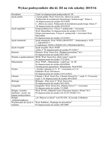 Wykaz podręczników dla kl. III na rok szkolny 2015/16 Tytuł i nr dopuszczenia podręcznika kl. III 1.Język polski: Wyd. Nowa Era „Słowa na czasie. Podręcznik do kształcenia literackiego i kulturowego”. Klasa 3, Nr dopuszczenia do użytku 95/5/2010 2. „Słowa na czasie. Podręcznik do kształcenia językowego. Klasa 3”. Nr dopuszczenia do użytku 95/6/2010 Język angielski Grupa podstawowa- Voices 3–podręcznik + ćwiczenia Wyd. Macmillan, Nr dopuszczenia do użytku 313/3/2011 Grupa zaawansowana -Voices 4 –podręcznik + ćwiczenia Wyd. Macmillan Nr dopuszczenia do użytku 313/4/2011 Język niemiecki Język niemiecki: Wyd. WSiP„GRAFFITI” – kontynuacja z kl.II, i „GRAFFITI 3“ Z nadrukiem: NOWA PODSTAWA PROGRAMOWA Język rosyjski Język rosyjski: Wyd. WSiP „Echo 3” Nr dopuszczenia do użytku 97/3/2011” Historia Historia: Wyd. Nowa Era „Śladami przeszłości” kl.3 Nr dopuszczenia do użytku 60/3/2011 Wiedza o społeczeństwie WOS :Wyd. Nowa Era „Dziś i jutro” część II Nr dopuszczenia do użytku 77/2/2010 Matematyka Wyd. WSiP „ Matematyka wokół nas” kl. III Nr dopuszczenia do użytku 62/3/2010 Trening przed egzaminem. Matematyka. Wyd.WSiP Fizyka „Fizyka z plusem.cz.3 i 4” + ćwiczenia cz.3 i 4 Gdańskie Wyd. Oświatowe Nr dopuszczenia do użytku 214/3,4/2012 Chemia Chemia 1.Wyd. Nowa Era „Chemia Nowej Ery ” część 3+ Ćwiczenia część 3, Nr dopuszczenia do użytku 49/3/2010 Biologia Biologia: „Puls życia 3” Wyd. Nowa Era, Nr dopuszczenia do użytku 58/3/2010 Geografia Geografia: Wyd. Nowa Era „Planeta Nowa 3” + ćwiczenia Nr dopuszczenia do użytku 7/3/2009 Religia rzymsko – Wyd. WAM „Odsłonić twarz Chrystusa-Jestem z Wami” kl.3 katolicka - uczeń nie Nr dopuszczenia do użytku AZ-32-01/10-KR-3/12 kupuje podręczników Religia „Ja i Bóg na co dzień” wyd.TE-EM , K.Łuczak, E.Bednarz zielonoświątkowa Wychowanie do życia w Wyd. Rubikon„ Wędrując ku dorosłości” rodzinie Nr dopuszczenia do użytku 205/2009 Przedmiot Język polski