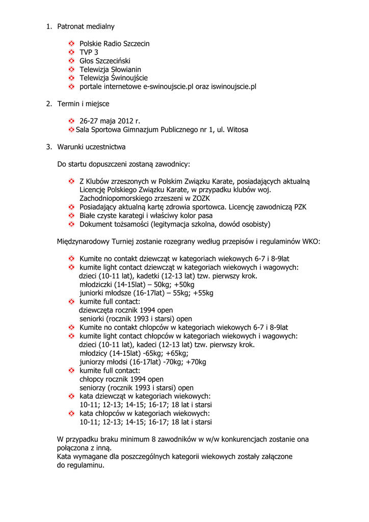 1. Patronat medialny Polskie Radio Szczecin TVP 3 Głos Szczeciński Telewizja Słowianin Telewizja Świnoujście portale internetowe e-swinoujscie.pl oraz iswinoujscie.pl 2. Termin i miejsce 26-27 maja 2012 r. Sala Sportowa Gimnazjum Publicznego nr 1, ul. Witosa 3. Warunki uczestnictwa Do startu dopuszczeni zostaną zawodnicy: Z Klubów zrzeszonych w Polskim Związku Karate, posiadających aktualną Licencję Polskiego Związku Karate, w przypadku klubów woj. Zachodniopomorskiego zrzeszeni w ZOZK Posiadający aktualną kartę zdrowia sportowca. Licencję zawodniczą PZK Białe czyste karategi i właściwy kolor pasa Dokument tożsamości (legitymacja szkolna, dowód osobisty) Międzynarodowy Turniej zostanie rozegrany według przepisów i regulaminów WKO: Kumite no contakt dziewcząt w kategoriach wiekowych 6-7 i 8-9lat kumite light contact dziewcząt w kategoriach wiekowych i wagowych: dzieci (10-11 lat), kadetki (12-13 lat) tzw. pierwszy krok. młodziczki (14-15lat) – 50kg; +50kg juniorki młodsze (16-17lat) – 55kg; +55kg kumite full contact: dziewczęta rocznik 1994 open seniorki (rocznik 1993 i starsi) open Kumite no contakt chlopców w kategoriach wiekowych 6-7 i 8-9lat kumite light contact chłopców w kategoriach wiekowych i wagowych: dzieci (10-11 lat), kadeci (12-13 lat) tzw. pierwszy krok. młodzicy (14-15lat) -65kg; +65kg; juniorzy młodsi (16-17lat) -70kg; +70kg kumite full contact: chłopcy rocznik 1994 open seniorzy (rocznik 1993 i starsi) open kata dziewcząt w kategoriach wiekowych: 10-11; 12-13; 14-15; 16-17; 18 lat i starsi kata chłopców w kategoriach wiekowych: 10-11; 12-13; 14-15; 16-17; 18 lat i starsi W przypadku braku minimum 8 zawodników w w/w konkurencjach zostanie ona połączona z inną. Kata wymagane dla poszczególnych kategorii wiekowych zostały załączone do regulaminu.