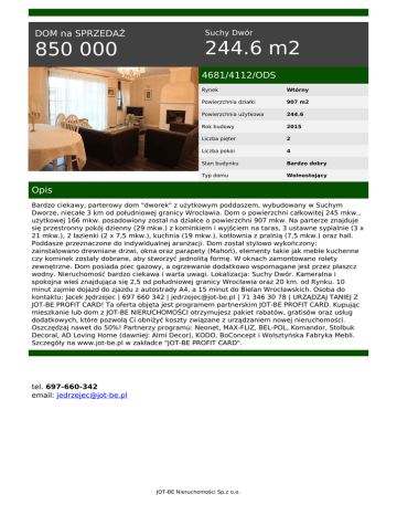 DOM na SPRZEDAŻ 850 000 Suchy Dwór 244.6 m2 4681/4112/ODS Rynek Wtórny Powierzchnia działki 907 m2 Powierzchnia użytkowa 244.6 Rok budowy 2015 Liczba pięter 2 Liczba pokoi 4 Stan budynku Bardzo dobry Typ domu Wolnostojący Opis Bardzo ciekawy, parterowy dom "dworek" z użytkowym poddaszem, wybudowany w Suchym Dworze, niecałe 3 km od południowej granicy Wrocławia. Dom o powierzchni całkowitej 245 mkw., użytkowej 166 mkw. posadowiony został na działce o powierzchni 907 mkw. Na parterze znajduje się przestronny pokój dzienny (29 mkw.) z kominkiem i wyjściem na taras, 3 ustawne sypialnie (3 x 21 mkw.), 2 łazienki (2 x 7,5 mkw.), kuchnia (19 mkw.), kotłownia z pralnią (7,5 mkw.) oraz hall. Poddasze przeznaczone do indywidualnej aranżacji. Dom został stylowo wykończony: zainstalowano drewniane drzwi, okna oraz parapety (Mahoń), elementy takie jak meble kuchenne czy kominek zostały dobrane, aby stworzyć jednolitą formę. W oknach zamontowano rolety zewnętrzne. Dom posiada piec gazowy, a ogrzewanie dodatkowo wspomagane jest przez płaszcz wodny. Nieruchomość bardzo ciekawa i warta uwagi. Lokalizacja: Suchy Dwór. Kameralna i spokojna wieś znajdująca się 2,5 od południowej granicy Wrocławia oraz 20 km. od Rynku. 10 minut zajmie dojazd do zjazdu z autostrady A4, a 15 minut do Bielan Wrocławskich. Osoba do kontaktu: Jacek Jędrzejec | 697 660 342 | [email protected] | 71 346 30 78 | URZĄDZAJ TANIEJ Z JOT-BE PROFIT CARD! Ta oferta objęta jest programem partnerskim JOT-BE PROFIT CARD. Kupując mieszkanie lub dom z JOT-BE NIERUCHOMOŚCI otrzymujesz pakiet rabatów, gratisów oraz usług dodatkowych, które pozwolą Ci obniżyć koszty związane z urządzaniem nowej nieruchomości. Oszczędzaj nawet do 50%! Partnerzy programu: Neonet, MAX-FLIZ, BEL-POL, Komandor, Stolbuk Decoral, AD Loving Home (dawniej: Almi Decor), KODO, BoConcept i Wolsztyńska Fabryka Mebli. Szczegóły na www.jot-be.pl w zakładce "JOT-BE PROFIT CARD". tel. 697-660-342 email: [email protected] JOT-BE Nieruchomości Sp.z o.o. Powered by TCPDF (www.tcpdf.org)