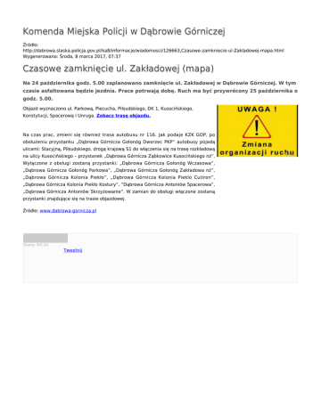 Komenda Miejska Policji w Dąbrowie Górniczej Źródło: http://dabrowa.slaska.policja.gov.pl/ka8/informacje/wiadomosci/126663,Czasowe-zamkniecie-ul-Zakladowej-mapa.html Wygenerowano: Środa, 8 marca 2017, 07:37 Czasowe zamknięcie ul. Zakładowej (mapa) Na 24 października godz. 5.00 zaplanowano zamknięcie ul. Zakładowej w Dąbrowie Górniczej. W tym czasie asfaltowana będzie jezdnia. Prace potrwają dobę. Ruch ma być przywrócony 25 października o godz. 5.00. Objazd wyznaczono ul. Parkową, Piecucha, Piłsudskiego, DK 1, Kusocińskiego, Konstytucji, Spacerową i Unruga. Zobacz trasę objazdu. Na czas prac, zmieni się również trasa autobusu nr 116. Jak podaje KZK GOP, po obsłużeniu przystanku „Dąbrowa Górnicza Gołonóg Dworzec PKP” autobusy pojadą ulicami: Stacyjną, Piłsudskiego, drogą krajową S1 do włączenia się na trasę rozkładową na ulicy Kusocińskiego – przystanek „Dąbrowa Górnicza Ząbkowice Kusocińskiego nż”. Wyłączone z obsługi zostaną przystanki: „Dąbrowa Górnicza Gołonóg Wczasowa”, „Dąbrowa Górnicza Gołonóg Parkowa”, „Dąbrowa Górnicza Gołonóg Zakładowa nż”, „Dąbrowa Górnicza Kolonia Piekło”, „Dąbrowa Górnicza Kolonia Pieklo Cutiron”, „Dąbrowa Górnicza Kolonia Piekło Kostury”, ”Dąbrowa Górnicza Antoniów Spacerowa”, „Dąbrowa Górnicza Antoniów Skrzyżowanie”. W zamian do obsługi włączone zostaną przystanki znajdujące się na trasie objazdowej. Źródło: www.dabrowa-gornicza.pl Ocena: 0/5 (0) Tweetnij