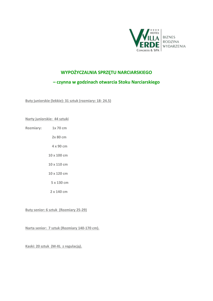 WYPOŻYCZALNIA SPRZĘTU NARCIARSKIEGO – czynna w godzinach otwarcia Stoku Narciarskiego Buty juniorskie (lekkie): 31 sztuk (rozmiary: 18- 24.5) Narty juniorskie: 44 sztuki Rozmiary: 1x 70 cm 2x 80 cm 4 x 90 cm 10 x 100 cm 10 x 110 cm 10 x 120 cm 5 x 130 cm 2 x 140 cm Buty senior: 6 sztuk (Rozmiary 25-29) Narta senior: 7 sztuk (Rozmiary 140-170 cm). Kaski: 20 sztuk (M-XL z regulacją).