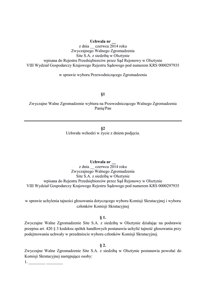 Uchwała nr __ z dnia __ czerwca 2014 roku Zwyczajnego Walnego Zgromadzenia Site S.A. z siedzibą w Olsztynie wpisana do Rejestru Przedsiębiorców przez Sąd Rejonowy w Olsztynie VIII Wydział Gospodarczy Krajowego Rejestru Sądowego pod numerem KRS 0000297935 w sprawie wyboru Przewodniczącego Zgromadzenia §1 Zwyczajne Walne Zgromadzenie wybiera na Przewodniczącego Walnego Zgromadzenia Panią/Pan §2 Uchwała wchodzi w życie z dniem podjęcia. Uchwała nr __ z dnia __ czerwca 2014 roku Zwyczajnego Walnego Zgromadzenia Site S.A. z siedzibą w Olsztynie wpisana do Rejestru Przedsiębiorców przez Sąd Rejonowy w Olsztynie VIII Wydział Gospodarczy Krajowego Rejestru Sądowego pod numerem KRS 0000297935 w sprawie uchylenia tajności głosowania dotyczącego wyboru Komisji Skrutacyjnej i wyboru członków Komisji Skrutacyjnej § 1. Zwyczajne Walne Zgromadzenie Site S.A. z siedzibą w Olsztynie działając na podstawie przepisu art. 420 § 3 kodeksu spółek handlowych postanawia uchylić tajność głosowania przy podejmowaniu uchwały w przedmiocie wyboru członków Komisji Skrutacyjnej. § 2. Zwyczajne Walne Zgromadzenie Site S.A. z siedzibą w Olsztynie postanawia powołać do Komisji Skrutacyjnej następujące osoby: 1. ________ ________ 2. ________ ________ 3. ________ ________ § 3. Uchwała wchodzi w życie z dniem podjęcia. Uchwała nr __ z dnia __ czerwca 2014 roku Zwyczajnego Walnego Zgromadzenia Site S.A. z siedzibą w Olsztynie wpisana do Rejestru Przedsiębiorców przez Sąd Rejonowy w Olsztynie VIII Wydział Gospodarczy Krajowego Rejestru Sądowego pod numerem KRS 0000297935 sprawie przyjęcia porządku obrad Zwyczajnego Walnego Zgromadzenia §1 1. Otwarcie Zwyczajnego Walnego Zgromadzenia 2. Wybór Przewodniczącego Zwyczajnego Walnego Zgromadzenia 3. Stwierdzenie prawidłowości zwołania Zwyczajnego Walnego Zgromadzenia oraz stwierdzenie jego zdolności do podejmowania uchwał 4. Podjęcie uchwały w sprawie uchylenia tajności głosowania dotyczącego wyboru Komisji Skrutacyjnej i wyboru członków Komisji Skrutacyjnej. 5. Przyjęcie porządku obrad Zwyczajnego Walnego Zgromadzenia 6. Podjęcie uchwały w sprawie zatwierdzenia sprawozdania Zarządu z działalności za okres od dnia 1 stycznia 2013 roku do dnia 31 grudnia 2013 roku 7. Podjęcie uchwały w sprawie zatwierdzenia sprawozdania finansowego za okres od dnia 1 stycznia 2013 do dnia 31 grudnia 2013 roku 8. Podjęcie uchwały w sprawie udzielenia absolutorium Prezesowi Zarządu Spółki z wykonania obowiązków w roku 2013 9. Podjęcie uchwał w sprawie udzielenia członkom Zarządu absolutorium z wykonania przez nich obowiązków w roku 2013 10.Podjęcie uchwały w sprawie podziału zysku za rok 2013 obejmujący okres od dnia 1 stycznia 2013 roku do dnia 31 grudnia 2013 roku 11. Zamknięcie obrad. §2 Uchwała wchodzi w życie z dniem jej podjęcia. Uchwała nr __ z dnia __ czerwca 2014 roku Zwyczajnego Walnego Zgromadzenia Site S.A. z siedzibą w Olsztynie wpisana do Rejestru Przedsiębiorców przez Sąd Rejonowy w Olsztynie VIII Wydział Gospodarczy Krajowego Rejestru Sądowego pod numerem KRS 0000297935 w sprawie zatwierdzenia sprawozdania Zarządu z działalności za okres od dnia 1 stycznia 2013 roku do dnia 31 grudnia 2013 roku Zwyczajne Walne Zgromadzenie SITE S.A. na podstawie przepisu art. 393 pkt. 1 i art. 395 § 2 pkt. 1 k.s.h. uchwala co następuje oraz postanowienia § 33 ust. 1 statutu Spółki uchwala co następuje: § 1. Po rozpatrzeniu sprawozdania Zarządu z działalności Site S.A. za rok obrotowy obejmujący okres od dnia 1 stycznia 2013 roku do dnia 31 grudnia 2013 roku, Walne Zgromadzenie postanawia zatwierdzić sprawozdanie Zarządu z działalności Site S.A. za rok obrotowy obejmujący okres od dnia 1 stycznia 2013 roku do dnia 31 grudnia 2013 roku. § 2. Uchwała wchodzi w życie z dniem podjęcia. Uchwała nr __ z dnia __ czerwca 2014 roku Zwyczajnego Walnego Zgromadzenia Site S.A. z siedzibą w Olsztynie wpisana do Rejestru Przedsiębiorców przez Sąd Rejonowy w Olsztynie VIII Wydział Gospodarczy Krajowego Rejestru Sądowego pod numerem KRS 0000297935 w sprawie zatwierdzenia sprawozdania finansowego za okres od dnia 1 stycznia 2013 do dnia 31 grudnia 2013 roku Zwyczajne Walne Zgromadzenie Site S.A. działając na podstawie przepisu art. 393 pkt. 1 i art. 395 § 2 pkt. 1 k.s.h. uchwala co następuje: § 1. Niniejszym zatwierdza sprawozdanie finansowe Spółki za rok obrotowy 2013, zaopiniowane przez niezależnego biegłego rewidenta Sebastiana Kolegę działającego w imieniu Adviser Audyt Sp. z o.o. z siedzibą w Warszawie (Adviser Audyt Sp. z o.o. z siedzibą w 03-310 Warszawie (podmiot uprawniony do badania sprawozdań finansowych nr 3883), składające się z: a) wprowadzenia do sprawozdania finansowego, b) bilansu, który po stronie aktywów i pasywów na dzień 31 grudnia 2013 roku zamyka się sumą _________________ (słownie: _____________________________________________) złotych, c) rachunku zysków i strat za rok obrotowy 2013, za okres od dnia 1 stycznia 2013 roku do dnia 31 grudnia 2013 roku, który wykazuje zysk/stratę netto w wysokości ____________ (słownie: ____________________________________________) złotych. § 2. Niniejsza uchwała wchodzi w życie z dniem podjęcia Uchwała nr __ z dnia __ czerwca 2014 roku Zwyczajnego Walnego Zgromadzenia Site S.A. z siedzibą w Olsztynie wpisana do Rejestru Przedsiębiorców przez Sąd Rejonowy w Olsztynie VIII Wydział Gospodarczy Krajowego Rejestru Sądowego pod numerem KRS 0000297935 w sprawie udzielenia absolutorium Prezesowi Zarządu Spółki z wykonania obowiązków w roku 2013 Zwyczajne Walne Zgromadzenie SITE S.A. działając na podstawie przepisu art. 393 pkt. 1 i art. 395 § 2 pkt. 3 k.s.h uchwala co następuje: § 1. Walne Zgromadzenie Spółki udziela Panu Dawidowi Skrzypczakowi – Prezesowi Zarządu Spółki - absolutorium z wykonania obowiązków za okres pełnienia funkcji w roku 2013. § 2. Uchwała wchodz