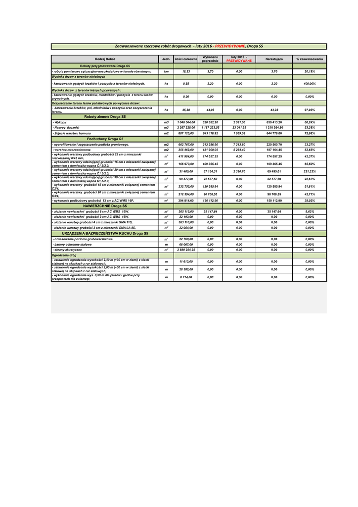 Zaawansowanerzeczowerobótdrogowych-luty2016-PRZEWIDYWANE,DrogaS5 Jedn. ilości całkowite Wykonane poprzednio luty 2016 PRZEWIDYWANE Narastająco % zaawansowania km 18,33 3,70 0,00 3,70 20,19% ha 0,55 2,20 0,00 2,20 400,00% ha 0,20 0,00 0,00 0,00 0,00% ha 45,38 44,03 0,00 44,03 97,03% - Wykopy m3 1 046 564,00 628 382,20 2 031,00 630 413,20 60,24% - Nasypy (łącznie) m3 2 267 228,00 1 187 223,55 23 041,25 1 210 264,80 53,38% - Zdjęcie warstwu humusu m2 887 125,00 643 118,92 1 659,08 644 778,00 72,68% Rodzaj Robót Roboty przygotowawcze Droga S5 - roboty pomiarowe sytuacyjno-wysokościowe w terenie równinnym, Wycinka drzew z terenów nieleśnych - karczowanie gęstych krzaków i poszycia z terenów nieleśnych, Wycinka drzew z terenów leśnych prywatnych : - karczowanie gęstych krzaków, młodników i poszycia z terenu lasów prywatnych, Oczyszczenie terenu lasów państwowych po wycince drzew: - karczowania krzaków, pni, młodników i poszycia oraz oczyszczenia terenu, Roboty ziemne Droga S5 Podbudowy Droga S5 - wyprofilowanie i zagęszczenie podłoża gruntowego. m2 662 767,00 213 286,90 7 213,80 220 500,70 33,27% - warstwa mrozoochronna m2 355 469,00 181 900,05 5 264,40 187 164,45 52,65% m2 411 984,00 174 557,25 0,00 174 557,25 42,37% m2 166 973,00 109 365,45 0,00 109 365,45 65,50% m2 31 400,00 67 164,31 2 330,70 69 495,01 221,32% - wykonanie warstwy podbudowy grubości 22 cm z mieszanki niezwiązanej 0/45 mm, - wykonanie warstwy odcinającej grubości 15 cm z mieszanki związanej cementem z domieszką wapna C1,5/2,0, - wykonanie warstwy odcinającej grubości 20 cm z mieszanki związanej cementem z domieszką wapna C1,5/2,0, - wykonanie warstwy odcinającej grubości 30 cm z mieszanki związanej cementem z domieszką wapna C1,5/2,0, - wykonanie warstwy grubości 15 cm z mieszanki związanej cementem C3/4, - wykonanie warstwy grubości 20 cm z mieszanki związanej cementem C3/4, - wykonanie podbudowy grubości 13 cm z AC WMS 16P, m2 99 577,00 22 577,50 0,00 22 577,50 22,67% m 2 232 752,00 120 585,94 0,00 120 585,94 51,81% m 2 212 394,00 90 708,55 0,00 90 708,55 42,71% m2 394 814,00 150 112,90 0,00 150 112,90 38,02% - ułożenie nawierzchni grubości 8 cm AC WMS 16W, m2 365 115,00 35 147,64 0,00 35 147,64 9,63% - ułożenie nawierzchni grubości 9 cm AC WMS 16W, m2 22 193,00 0,00 0,00 0,00 0,00% - ułożenie warstwy grubości 4 cm z mieszanki SMA 11S, m2 363 110,00 0,00 0,00 0,00 0,00% - ułożenie warstwy grubości 3 cm z mieszanki SMA LA 8S, m2 22 054,00 0,00 0,00 0,00 0,00% - oznakowanie poziome grubowarstwowe m2 22 760,00 0,00 0,00 0,00 0,00% - bariery ochronne stalowe m 66 067,00 0,00 0,00 0,00 0,00% - ekrany akustyczne m2 2 880 254,25 0,00 0,00 0,00 0,00% m 11 613,00 0,00 0,00 0,00 0,00% m 28 382,00 0,00 0,00 0,00 0,00% m 8 714,00 0,00 0,00 0,00 0,00% NAWIERZCHNIE Droga S5 URZĄDZENIA BAZPIECZEŃSTWA RUCHU Droga S5 Ogrodzenia dróg - ustawienie ogrodzenia wysokości 2,40 m (+30 cm w ziemi) z siatki stalowej na słupkach z rur stalowych, - ustawienie ogrodzenia wysokości 2,00 m (+30 cm w ziemi) z siatki stalowej na słupkach z rur stalowych, - wykonanie ogrodzenia wys. 0,50 m dla plazów i gadów przy przepustach dla zwiezrząt,