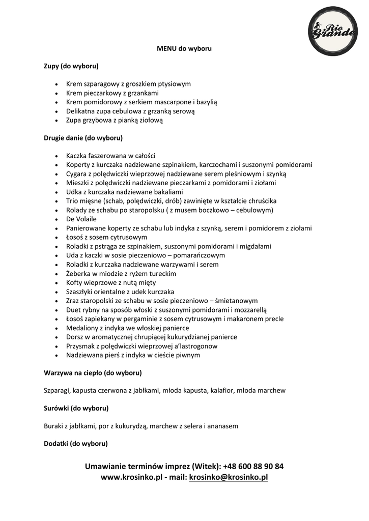MENU do wyboru Zupy (do wyboru) Krem szparagowy z groszkiem ptysiowym Krem pieczarkowy z grzankami Krem pomidorowy z serkiem mascarpone i bazylią Delikatna zupa cebulowa z grzanką serową Zupa grzybowa z pianką ziołową Drugie danie (do wyboru) Kaczka faszerowana w całości Koperty z kurczaka nadziewane szpinakiem, karczochami i suszonymi pomidorami Cygara z polędwiczki wieprzowej nadziewane serem pleśniowym i szynką Mieszki z polędwiczki nadziewane pieczarkami z pomidorami i ziołami Udka z kurczaka nadziewane bakaliami Trio mięsne (schab, polędwiczki, drób) zawinięte w kształcie chruścika Rolady ze schabu po staropolsku ( z musem boczkowo – cebulowym) De Volaile Panierowane koperty ze schabu lub indyka z szynką, serem i pomidorem z ziołami Łosoś z sosem cytrusowym Roladki z pstrąga ze szpinakiem, suszonymi pomidorami i migdałami Uda z kaczki w sosie pieczeniowo – pomarańczowym Roladki z kurczaka nadziewane warzywami i serem Żeberka w miodzie z ryżem tureckim Kofty wieprzowe z nutą mięty Szaszłyki orientalne z udek kurczaka Zraz staropolski ze schabu w sosie pieczeniowo – śmietanowym Duet rybny na sposób włoski z suszonymi pomidorami i mozzarellą Łosoś zapiekany w pergaminie z sosem cytrusowym i makaronem precle Medaliony z indyka we włoskiej panierce Dorsz w aromatycznej chrupiącej kukurydzianej panierce Przysmak z polędwiczki wieprzowej a’lastrogonow Nadziewana pierś z indyka w cieście piwnym Warzywa na ciepło (do wyboru) Szparagi, kapusta czerwona z jabłkami, młoda kapusta, kalafior, młoda marchew Surówki (do wyboru) Buraki z jabłkami, por z kukurydzą, marchew z selera i ananasem Dodatki (do wyboru) Umawianie terminów imprez (Witek): +48 600 88 90 84 www.krosinko.pl - mail: [email protected] Kulki ziemniaczane, młode ziemniaki z koperkiem, pyzy, frytki, kopytka Sosy Pieczeniowy, grzybowy, kurki w śmietanie z koperkiem Kolacja na zimno Ryby w galarecie (łosoś, sandacz, tilapia, pstrąg) Łosoś wędzony z pianką smakową (koperkowa, ziołowa, cytrusowa) Roladki mięsne: z grzybami, z bakaliami, ze szpinakiem, rostbef na czerwono, schab z musem (chrzanowym, pieprzowym) Taca serów z owocami Sałatki: z pierożkami ravioli i tuńczykiem, z papryką grillowaną z indykiem , z marynowanym łososiem w soku cytrusowym, serowa z mixem serów, sałatka tajska z rostbefem Sałatka z wędzonego kurczaka i ananasa Sałatka makaronowa z brokułami i serem Sałatka ziemniaczana w towarzystwie ryb wędzonych Sałatka meksykańska z kurczakiem i kukurydzą Koktajl z krewetek lub indyka Mięsa na ciepło Golonka po bawarsku faszerowana kapustą kwaszoną, strogonof z borowikami Tarta z boczkiem i grzybami Tarta z brokułami i serem pleśniowym Są to tylko niektóre z naszych propozycji. Jeżeli zapragną Państwo innych potraw z przyjemnością je przygotujemy. Na specjalne życzenia przyrządzamy pieczonego prosiaka, szynkę, dziczyzną – jak szeryf ją upoluje. Umawianie terminów imprez (Witek): +48 600 88 90 84 www.krosinko.pl - mail: [email protected]
