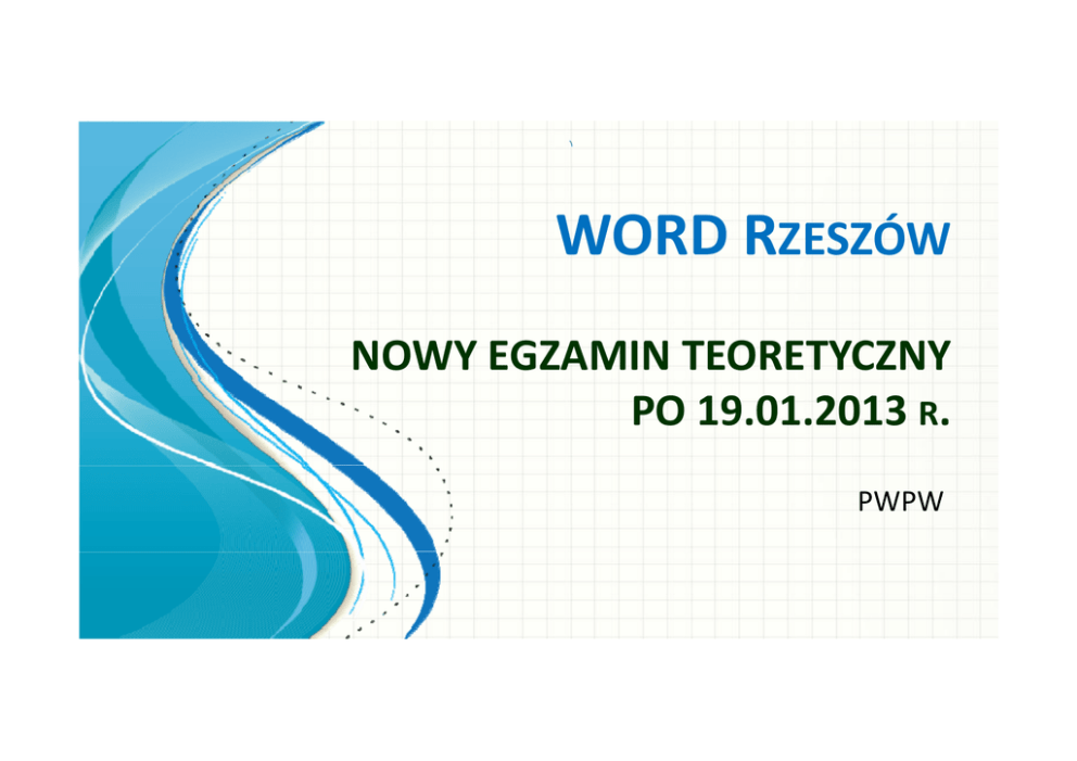 WORD RZESZÓW NOWY EGZAMIN TEORETYCZNY PO 19.01.2013 R. PWPW Realizuje wymagania określone w : • ustawa z dnia 5 stycznia 2011 o kierujących pojazdami, • rozporządzenie Ministra Transportu, Budownictwa i Gospodarki Morskiej z dnia 13 lipca 2012 r. w sprawie egzaminowania osób ubiegających się o uprawnienia do kierowania pojazdami, szkolenia, egzaminowania i uzyskiwania uprawnień przez egzaminatorów oraz wzorów dokumentów stosowanych w tych sprawach. Egzamin teoretyczny po 19 stycznia 2013 r. Zasady egzaminu teoretycznego y g y g • Czas trwania testu egzaminacyjnego wynosi maksymalnie 25 minut maksymalnie 25 minut. • Tylko jedna odpowiedź jest w pytaniu jest prawidłowa, • Nie można cofnąć się do wcześniejszych pytań, Nie można cofnąć się do wcześniejszych pytań, • Projekcja filmu wyświetla się tylko jeden raz, • Projekcja filmu kończy się stop klatką, która trwa przez j j y ę p ą, p cały czas przeznaczony na udzielenie odpowiedzi. Egzamin teoretyczny po 19 stycznia 2013 r. Zasady egzaminu teoretycznego y g y g • Czas trwania testu egzaminacyjnego wynosi maksymalnie 25 minut maksymalnie 25 minut. • Tylko jedna odpowiedź w pytaniu jest prawidłowa, • Nie można cofnąć się do wcześniejszych pytań, Nie można cofnąć się do wcześniejszych pytań, • Projekcja filmu wyświetla się tylko jeden raz, • Projekcja filmu kończy się stop klatką, która trwa przez j j y ę p ą, p cały czas przeznaczony na udzielenie odpowiedzi. Egzamin teoretyczny po 19 stycznia 2013 r. Zasady egzaminu teoretycznego y g y g • Czas trwania testu egzaminacyjnego wynosi maks. 25 minut. minut • Tylko jedna odpowiedź jest w pytaniu jest prawidłowa, • Nie można cofnąć się do wcześniejszych pytań, Nie można cofnąć się do wcześniejszych pytań, • Projekcja filmu wyświetla się tylko jeden raz, • Projekcja filmu kończy się stop klatką, która trwa przez j j y ę p ą, p cały czas przeznaczony na udzielenie odpowiedzi. Egzamin teoretyczny po 19 stycznia 2013 r. Zasady egzaminu teoretycznego y g y g • Czas trwania testu egzaminacyjnego wynosi maks. 25 minut. minut • Tylko jedna odpowiedź jest w pytaniu jest prawidłowa, • Nie można cofnąć się do wcześniejszych pytań, Nie można cofnąć się do wcześniejszych pytań, • Projekcja filmu wyświetla się tylko jeden raz, • Projekcja filmu kończy się stop klatką, która trwa przez j j y ę p ą, p cały czas przeznaczony na udzielenie odpowiedzi. Egzamin teoretyczny po 19 stycznia 2013 r. Zasady egzaminu teoretycznego y g y g • Czas trwania testu egzaminacyjnego wynosi maks. 25 minut. minut • Tylko jedna odpowiedź jest w pytaniu jest prawidłowa, • Nie można cofnąć się do wcześniejszych pytań, Nie można cofnąć się do wcześniejszych pytań, • Projekcja filmu wyświetla się tylko jeden raz, • Projekcja filmu kończy się stop klatką, która trwa przez j j y ę p ą, p cały czas przeznaczony na udzielenie odpowiedzi. Egzamin teoretyczny po 19 stycznia 2013 r. Zasady egzaminu teoretycznego y g y g • Test zawiera 32 pytania: 20 pytań z wiedzy podstawowej i 12 pytań z wiedzy specjalistycznej podstawowej i 12 pytań z wiedzy specjalistycznej, • Pytania są punktowane 3, 2 i 1 w zależności od ich znaczenia dla bezpieczeństwa ruchu drogowego, • Niewskazanie żadnej odpowiedzi skutkuje otrzymaniem 0 pkt,. • Warunkiem uzyskania wyniku pozytywnego jest W ki k i ik t j t uzyskanie co najmniej 68 punktów z 74 możliwych. Egzamin teoretyczny po 19 stycznia 2013 r. Zasady egzaminu teoretycznego y g y g • Test zawiera 32 pytania: 20 pytań z wiedzy podstawowej i 12 pytań z wiedzy specjalistycznej i 12 pytań z wiedzy specjalistycznej, • Pytania są punktowane 3, 2 i 1 w zależności od ich znaczenia dla bezpieczeństwa ruchu drogowego, • Niewskazanie żadnej odpowiedzi skutkuje otrzymaniem 0 punktów, • Warunkiem uzyskania wyniku pozytywnego jest W ki k i ik t j t uzyskanie co najmniej 68 punktów z 74 możliwych. Egzamin teoretyczny po 19 stycznia 2013 r. Zasady egzaminu teoretycznego y g y g • Test zawiera 32 pytania: 20 pytań z wiedzy podstawowej i 12 pytań z wiedzy specjalistycznej i 12 pytań z wiedzy specjalistycznej, • Pytania są punktowane 3, 2 i 1 w zależności od ich znaczenia dla bezpieczeństwa ruchu drogowego, • Niewskazanie żadnej odpowiedzi skutkuje otrzymaniem 0 punktów, • Warunkiem uzyskania wyniku pozytywnego jest W ki k i ik t j t uzyskanie co najmniej 68 punktów z 74 możliwych. Egzamin teoretyczny po 19 stycznia 2013 r. Zasady egzaminu teoretycznego y g y g • Test zawiera 32 pytania: 20 pytań z wiedzy podstawowej i 12 pytań z wiedzy specjalistycznej i 12 pytań z wiedzy specjalistycznej, • Pytania są punktowane 3, 2 i 1 w zależności od ich znaczenia dla bezpieczeństwa ruchu drogowego, • Niewskazanie żadnej odpowiedzi skutkuje otrzymaniem 0 punktów, • Warunkiem uzyskania wyniku pozytywnego jest W ki k i ik t j t uzyskanie co najmniej 68 punktów z 74 możliwych. Egzamin teoretyczny po 19 stycznia 2013 r. Budowa testu egzaminacyjnego g yj g Część podstawowa ( 20 pytań ): • Pytania jednokrotnego wyboru TAK/NIE, y j g y / • Pytania ilustrowane klipami filmowymi lub zdjęciami z realnych sytuacji drogowych, • 20 sekund na zapoznanie się z treścią pytania, • 15 sekund na udzielenie odpowiedzi. k d d l d d Podział: • 10 pytań o wysokim znaczeniu dla bezpieczeństwa ruchu drogowego ( 3pkt ) 10 t ń ki i dl b i ńt h d ( 3 kt ) • 6 pytań o średnim znaczeniu dla bezpieczeństwa ruchu drogowego ( 2pkt ), • 4 pytania o niskim znaczeniu dla bezpieczeństwa ruchu drogowego ( 1pkt ). Egzamin teoretyczny po 19 stycznia 2013 r. Budowa testu egzaminacyjnego g yj g Część podstawowa ( 20 pytań ): • Pytania jednokrotnego wyboru TAK/NIE, y j g y • Pytania ilustrowane klipami filmowymi lub zdjęciami z realnych sytuacji drogowych, • 20 sekund na zapoznanie się z treścią