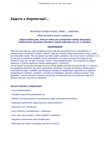 PRZEDSZKOLE NR 3 im. Jana Brzechwy Zajęcia z dogoterapii... We wtorek 21.lutego w grupie ,,Żabek" i ,,Zajączków" odbyły się kolejne zajecia z dogoterapii. Zajęcia edukacyjne, których celem jest przekazanie wiedzy dotyczącej bezpiecznych sposobów interakcji z psami odbywają się raz w miesiącu. DOGOTERAPIA Obecność psa podczas zajęć terapeutycznych staje się niezwykle silnym motywatorem w podejmowaniu określonych działań. Zajęcia stają się ciekawe, pełne pozytywnych emocji, dając tym niezwykła radość. Pies akceptuje nas takich jakimi jesteśmy. Nie chce w nas nic zmieniać i nie ocenia nas na podstawie wyglądu, formy wypowiedzi czy stopy życiowej. Dla niego nie jest istotne ile masz lat, ale fakt, że jesteś i może z Tobą współpracować. Pies terapeuta to oddany towarzysz w trakcie wspólnych zabaw edukacyjnych i ruchowych. W warunkach terapii pies pomaga stworzyć klimat bezpieczeństwa emocjonalnego, a w sytuacji przygnębienia obecność psa służy poprawieniu atmosfery i sprzyja rozluźnieniu. Atrakcyjność i różnorodność zajęć z udziałem psa terapeuty sprawia, że dogoterapia zagościła już w polskich przedszkolach, szkołach, szpitalach, ośrodkach rehabilitacji, domach spokojnej starości. Dziś specjaliści różnych dziedzin medycyny przyznają, że obecność psa ma pozytywny wpływ na zdrowie fizyczne i psychiczne człowieka. Korzyści płynące z dogoterapii: - Uczy samoakceptacji, - Poprawia system komunikowania się, - Rozwija funkcje poznawcze, koncentrację uwagi, orientacje przestrzenna, - Podwyższa samoocenę, dając poczucie własnej wartości, - Stymuluje ruch i aktywność, - Uczy tolerancji, samodzielności i otwartości, - Uczy czym jest przyjaźń, rozwija empatie i wrażliwość, - Wytwarza niesamowita wieź człowiek-pies, - Daje ogromna radość, wywołując uśmiech na twarzy, 1 PRZEDSZKOLE NR 3 im. Jana Brzechwy - Pozwala na współdziałanie w grupie, - Uczy odpowiedniego zachowania wobec zwierząt, - Pomaga rozładować stres, zmniejsza napięcie, poprawia samopoczucie, - Stymuluje zmysł słuchu, wzroku i dotyku. 2