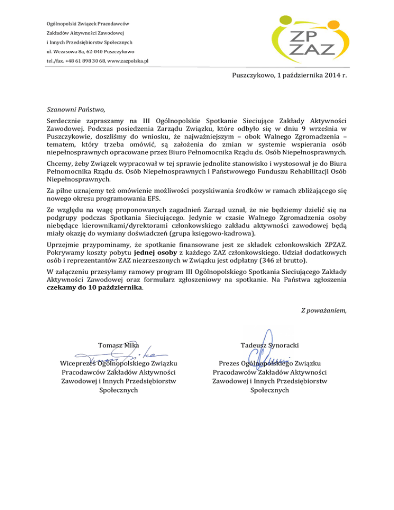 Ogólnopolski Związek Pracodawców Zakładów Aktywności Zawodowej i Innych Przedsiębiorstw Społecznych ul. Wczasowa 8a, 62-040 Puszczykowo tel./fax. +48 61 898 30 68, www.zazpolska.pl Puszczykowo, 1 października 2014 r. Szanowni Państwo, Serdecznie zapraszamy na III Ogólnopolskie Spotkanie Sieciujące Zakłady Aktywności Zawodowej. Podczas posiedzenia Zarządu Związku, które odbyło się w dniu 9 września w Puszczykowie, doszliśmy do wniosku, że najważniejszym – obok Walnego Zgromadzenia – tematem, który trzeba omówić, są założenia do zmian w systemie wspierania osób niepełnosprawnych opracowane przez Biuro Pełnomocnika Rządu ds. Osób Niepełnosprawnych. Chcemy, żeby Związek wypracował w tej sprawie jednolite stanowisko i wystosował je do Biura Pełnomocnika Rządu ds. Osób Niepełnosprawnych i Państwowego Funduszu Rehabilitacji Osób Niepełnosprawnych. Za pilne uznajemy też omówienie możliwości pozyskiwania środków w ramach zbliżającego się nowego okresu programowania EFS. Ze względu na wagę proponowanych zagadnień Zarząd uznał, że nie będziemy dzielić się na podgrupy podczas Spotkania Sieciującego. Jedynie w czasie Walnego Zgromadzenia osoby niebędące kierownikami/dyrektorami członkowskiego zakładu aktywności zawodowej będą miały okazję do wymiany doświadczeń (grupa księgowo-kadrowa). Uprzejmie przypominamy, że spotkanie finansowane jest ze składek członkowskich ZPZAZ. Pokrywamy koszty pobytu jednej osoby z każdego ZAZ członkowskiego. Udział dodatkowych osób i reprezentantów ZAZ niezrzeszonych w Związku jest odpłatny (346 zł brutto). W załączeniu przesyłamy ramowy program III Ogólnopolskiego Spotkania Sieciującego Zakłady Aktywności Zawodowej oraz formularz zgłoszeniowy na spotkanie. Na Państwa zgłoszenia czekamy do 10 października. Z poważaniem, Tomasz Mika Tadeusz Synoracki Wiceprezes Ogólnopolskiego Związku Pracodawców Zakładów Aktywności Zawodowej i Innych Przedsiębiorstw Społecznych Prezes Ogólnopolskiego Związku Pracodawców Zakładów Aktywności Zawodowej i Innych Przedsiębiorstw Społecznych Ogólnopolski Związek Pracodawców Zakładów Aktywności Zawodowej i Innych Przedsiębiorstw Społecznych ul. Wczasowa 8a, 62-040 Puszczykowo tel./fax. +48 61 898 30 68, www.zazpolska.pl Ramowy program III Ogólnopolskiego Spotkania Sieciującego Zakłady Aktywności Zawodowej 15-17 października 2014 Mickiewiczowskie Centrum Turystyczne, ul. Jarocińska 35, Żerków Dzień 1 13:30 – Obiad 14:30 –Strategiczny kontekst funkcjonowania ZAZ – pytania kluczowe. Analiza założeń do zmian w systemie wspierania osób niepełnosprawnych 16:00-16:30 – Przerwa w obradach. Zwiedzanie Zakładu Aktywności Zawodowej „Promyk” 16:30 – Wznowienie obrad 19:00 – Uroczysta kolacja; wieczór integracyjny przy muzyce Dzień 2 8:30-10:00 – Śniadanie 10:00-13:30 Walne Zgromadzenie (porządek obrad w załączeniu) 10:00-13:30 – Sprawy kadrowo-księgowe. Forum dobrych praktyk 13:30 – Obiad 14:30 – Strategiczny kontekst funkcjonowania ZAZ – cd. Wyłonienie grup roboczych (np. orzecznictwo, zadania ZAZ, finansowanie ZAZ) 19:00 – Kolacja; integracja w kręgielni lub na dyskotece Dzień 3 8:30-10:00 – Śniadanie 10:00-13:30 – ZAZ w dokumentach strategicznych na lata 2014-2020. Możliwość pozyskiwania dodatkowych źródeł finansowania w nowym okresie programowania 13:30 – Obiad Ogólnopolski Związek Pracodawców Zakładów Aktywności Zawodowej i Innych Przedsiębiorstw Społecznych ul. Wczasowa 8a, 62-040 Puszczykowo tel./fax. +48 61 898 30 68, www.zazpolska.pl ZGŁOSZENIE UCZESTNICTWA Zgłaszam uczestnictwo poniższych osób w III Ogólnopolskim Spotkaniu Sieciującym Zakłady Aktywności Zawodowej, które odbędzie się w dniach 15-17 października 2014 w Mickiewiczowskim Centrum Turystycznym w Żerkowie. Prosimy o wypełnienie tabeli DRUKOWANYMI LITERAMI Nazwa instytucji: Imię i nazwisko: Stanowisko w organizacji: 1. Telefon: E-mail: Uwagi: Imię i nazwisko: Stanowisko w organizacji: 2. Telefon: E-mail: Uwagi: Informacja finansowa: pobyt 1 przedstawiciela ZAZ członkowskiego nieodpłatny. Pozostałe osoby: 346 zł brutto za cały pobyt. Zgłoszenia należy przesyłać drogą elektroniczną, faksem lub pocztą do dnia 10 października 2014 na adres: Ogólnopolski Związek Pracodawców Zakładów Aktywności Przedsiębiorstw Społecznych, ul. Wczasowa 8a, 62-040 Puszczykowo Zawodowej i Innych Tel./fax: (61) 898 30 68 e-mail: [email protected] Gdyby ktoś z Państwa nie mógł uczestniczyć w całości zjazdu, prosimy o zaznaczenie tego w „Uwagach”. Informacja ta zostanie wzięta pod uwagę w rozliczeniu. W tej samej rubryce prosimy o podanie informacji o diecie wegetariańskiej Uczestnika. W przypadku pytań lub wątpliwości prosimy o kontakt z pracownikami biura Związku.