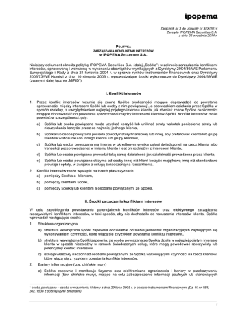 Załącznik nr 3 do uchwały nr 3/IX/2014 Zarządu IPOPEMA Securities S.A. z dnia 26 września 2014 r. POLITYKA ZARZĄDZANIA KONFLIKTAMI INTERESÓW W IPOPEMA SECURITIES S.A. Niniejszy dokument określa politykę IPOPEMA Securities S.A. (dalej „Spółka”) w zakresie zarządzania konfliktami interesów, opracowaną i wdrożoną w wykonaniu obowiązków wynikających z Dyrektywy 2004/39/WE Parlamentu Europejskiego i Rady z dnia 21 kwietnia 2004 r. w sprawie rynków instrumentów finansowych oraz Dyrektywy 2006/73/WE Komisji z dnia 10 sierpnia 2006 r. wprowadzające środki wykonawcze do Dyrektywy 2004/39/WE (zwanymi dalej łącznie „MiFID”). I. Konflikt interesów 1. 2. Przez konflikt interesów rozumie się znane Spółce okoliczności mogące doprowadzić do powstania sprzeczności między interesem Spółki lub osoby z nim powiązanej1, a obowiązkiem działania przez Spółkę w sposób rzetelny, z uwzględnieniem najlepiej pojętego interesu klienta, jak również znane Spółce okoliczności mogące doprowadzić do powstania sprzeczności między interesami klientów Spółki. Konflikt interesów może powstać w szczególności, gdy: a) Spółka lub osoba powiązana może uzyskać korzyść lub uniknąć straty wskutek poniesienia straty lub nieuzyskania korzyści przez co najmniej jednego klienta, b) Spółka lub osoba powiązana posiada powody natury finansowej lub innej, aby preferować klienta lub grupę klientów w stosunku do innego klienta lub grupy klientów, c) Spółka lub osoba powiązana ma interes w określonym wyniku usługi świadczonej na rzecz klienta albo transakcji przeprowadzanej w imieniu klienta i jest on rozbieżny z interesem klienta, d) Spółka lub osoba powiązana prowadzi taką samą działalność jak działalność prowadzona przez klienta, e) Spółka lub osoba powiązana otrzyma od osoby innej niż klient korzyść majątkową inną niż standardowe prowizje i opłaty, w związku z usługą świadczoną na rzecz klienta. Konflikt interesów może wystąpić na trzech płaszczyznach: a) pomiędzy Spółka a klientem, b) pomiędzy klientami Spółki, c) pomiędzy Spółką lub klientem a osobami powiązanymi ze Spółka. II. Środki zarządzania konfliktami interesów W celu zapobiegania powstawaniu potencjalnych konfliktów interesów oraz efektywnego zarządzania rzeczywistymi konfliktami interesów, w taki sposób, aby nie dochodziło do naruszenia interesów klienta, Spółka wprowadził następujące środki: 1. Struktura organizacyjna a) struktura wewnętrzna Spółki zapewnia oddzielenie od siebie jednostek organizacyjnych zajmujących się wykonywaniem czynności, które wiążą się z ryzykiem powstania konfliktu interesów.. b) struktura wewnętrzna Spółki zapewnia, że osoba powiązana ze Spółką działa w najlepiej pojętym interesie klienta w sposób niezależny w ramach świadczonych usług, które mogą powodować rzeczywisty lub potencjalny konflikt interesów. c) istnieje właściwy nadzór nad osobami powiązanymi ze Spółką wykonującymi czynności na rzecz klientów, które wiążą się z ryzykiem powstania konfliktu interesów. 2. Bariery informacyjne (tzw. chińskie mury) a) Spółka zapewnia i monitoruje fizyczne oraz elektroniczne ograniczenia i bariery w przekazywaniu informacji (tzw. chińskie mury), mające na celu zabezpieczenie informacji poufnych lub stanowiących 1 osoba powiązana – osoba w rozumieniu Ustawy z dnia 29 lipca 2005 r. o obrocie instrumentami finansowymi (Dz. U. nr 183, poz. 1538 z późniejszymi zmianami) 1 tajemnicę zawodową oraz zapobieganie nieuzasadnionemu ich przepływowi bądź niewłaściwemu ich wykorzystaniu. b) w celu kontroli dostępu do istotnych informacji związanych ze świadczeniem usług na rzecz klienta Spółka wdraża regulacje wewnętrzne zapewniające ochronę przepływu informacji poufnych lub stanowiących tajemnicę zawodową, które otrzymuje od swoich klientów. c) Spółka ogranicza do niezbędnego minimum krąg osób mających dostęp do informacji poufnych lub stanowiących tajemnicę zawodową i udostępnia je wyłącznie osobom lub instytucjom upoważnionym do ich otrzymania. 3. Realizacja zleceń klientów a) realizacja zleceń klientów realizowana jest w taki sposób, aby wszyscy klienci byli traktowani jednakowo w takiej samej sytuacji. b) transakcje zawierane są w taki sposób, aby żaden z klientów nie był preferowany w przypadku nabycia instrumentów finansowych po różnych cenach lub w mniejszej liczbie niż określono w zleceniach. 4. Niezależność a) Spółka zapobiega istnieniu bezpośrednich zależności pomiędzy wysokością wynagrodzenia osób powiązanych ze Spółką wykonujących określone czynności na rzecz klientów a wynagrodzeniem lub zyskami osiąganymi przez osoby wykonujące inne czynności, które mogą powodować rzeczywisty lub potencjalny konflikt interesów. b) Spółka zapobiega możliwości wywierania niekorzystnego wpływu osób trzecich na wykonywanie przez osoby powiązane ze Spółką czynności na rzecz klientów. c) Spółka zapobiega przypadkom jednoczesnego lub następującego bezpośrednio po sobie wykonywania przez tę samą osobę powiązaną czynności związanych z różnymi usługami świadczonymi przez Spółkę, jeżeli mogłoby to wywrzeć niekorzystny wpływ na prawidłowe zarządzanie konfliktami interesów, lub zapewnia nadzór nad takim sposobem wykonywania czynności, jeżeli jest on konieczny. d) Spółka zapewnia istnienie i realizację procedur mających na celu niezależną ocenę sytuacji w przypadku podejrzenia wystąpienia konfliktu interesów. e) wdrażane środki i procedury zarządzania konfliktami interesów zapewniają osobom powiązanym, zaangażowanym w wykonywanie przez Spółkę czynności stanowiących działalność maklerską, niezależność wykonywania tych czynności. f) inwestowanie przez osoby powiązane na własny rachunek jest uregulowane w odpowiednich procedurach wewnę
